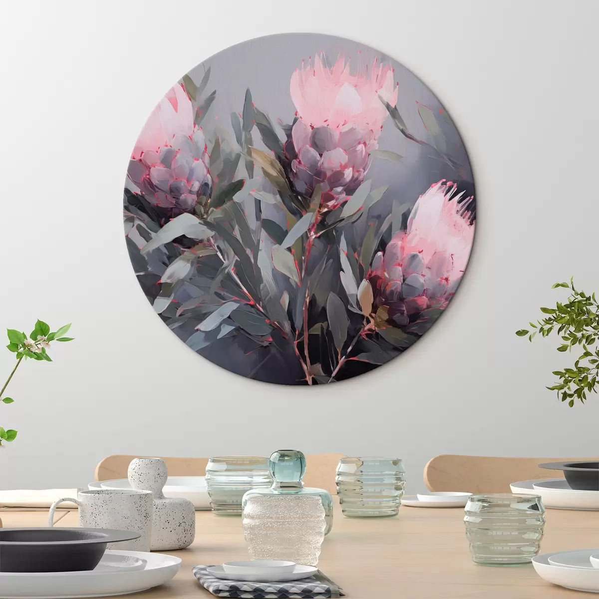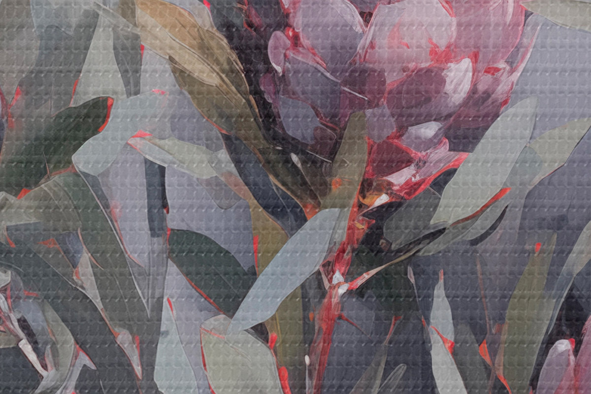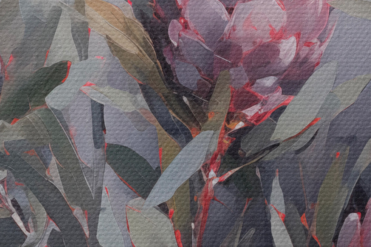 Pilt Roosa protea lilled roheliste lehtedega, pehmed pintslitõmbed, tumedad värvid, elegantne kompositsioon Nr r44400