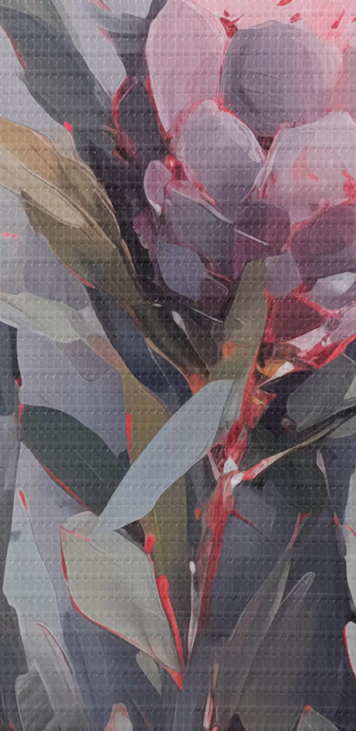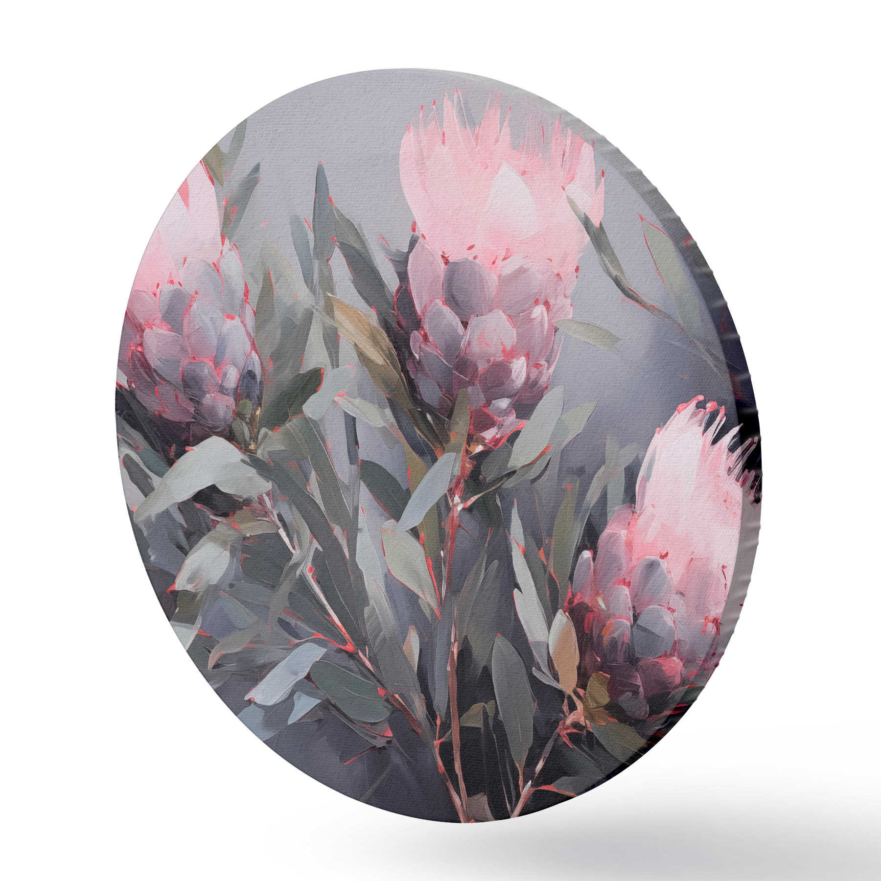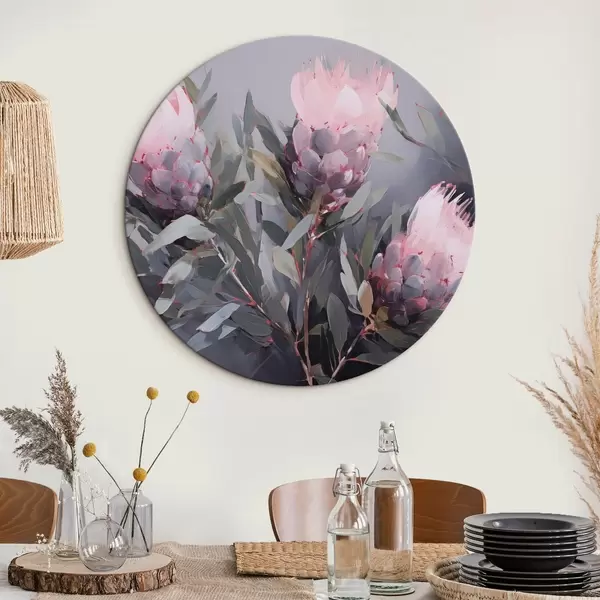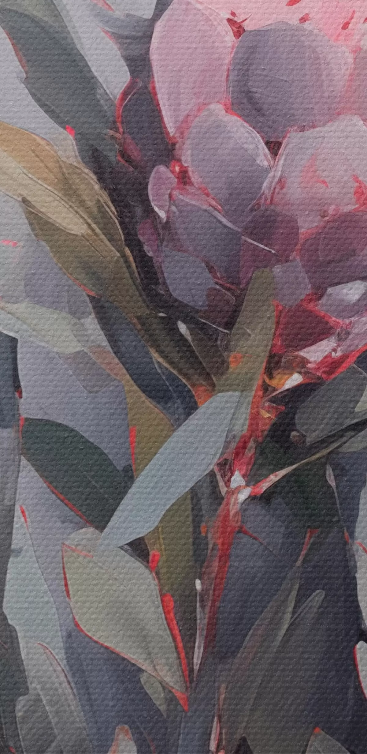 Pilt Roosa protea lilled roheliste lehtedega, pehmed pintslitõmbed, tumedad värvid, elegantne kompositsioon Nr r44400
