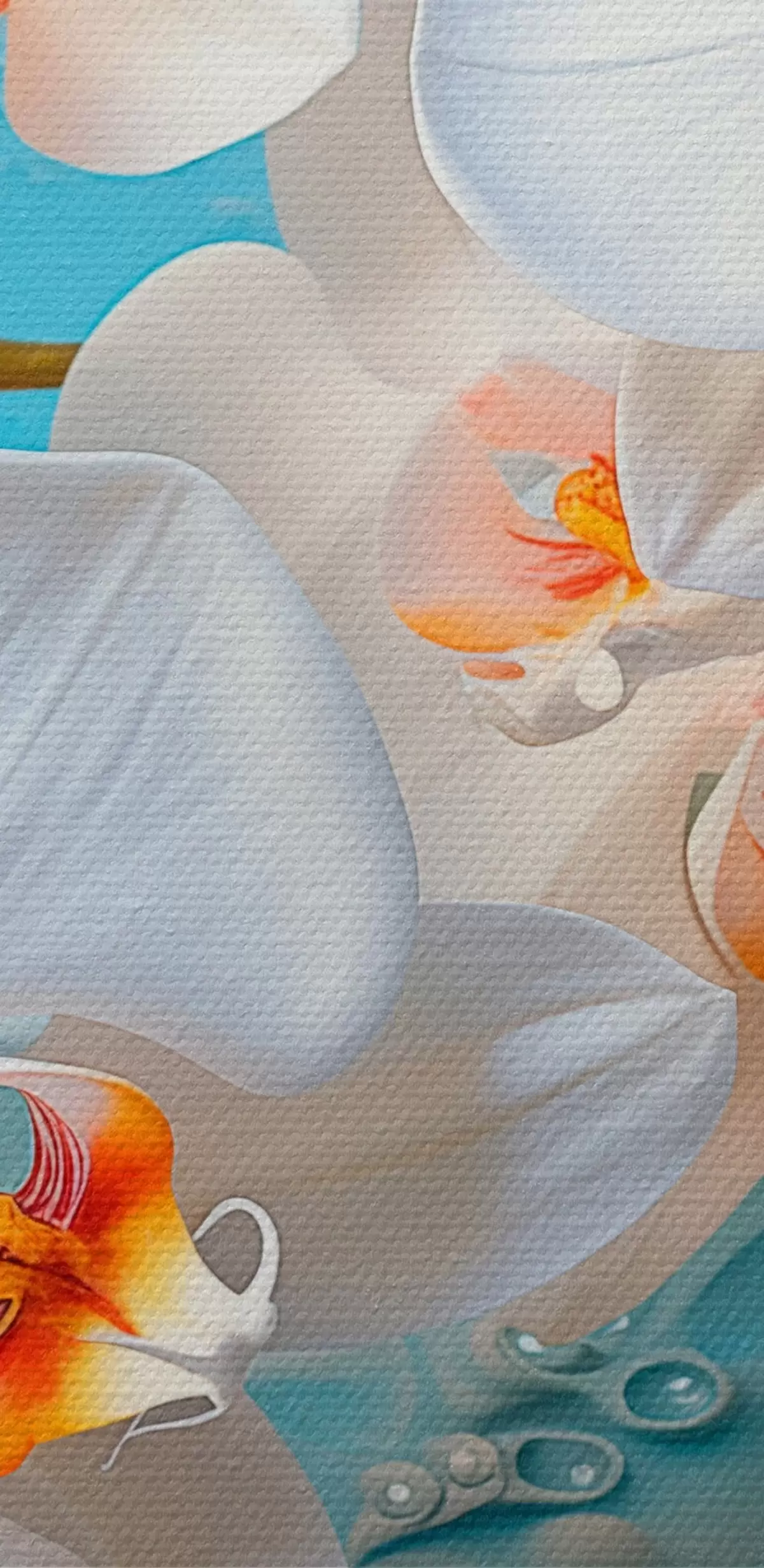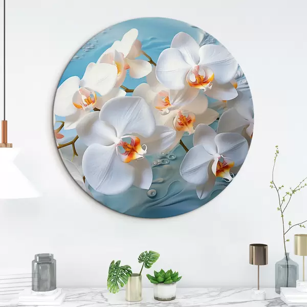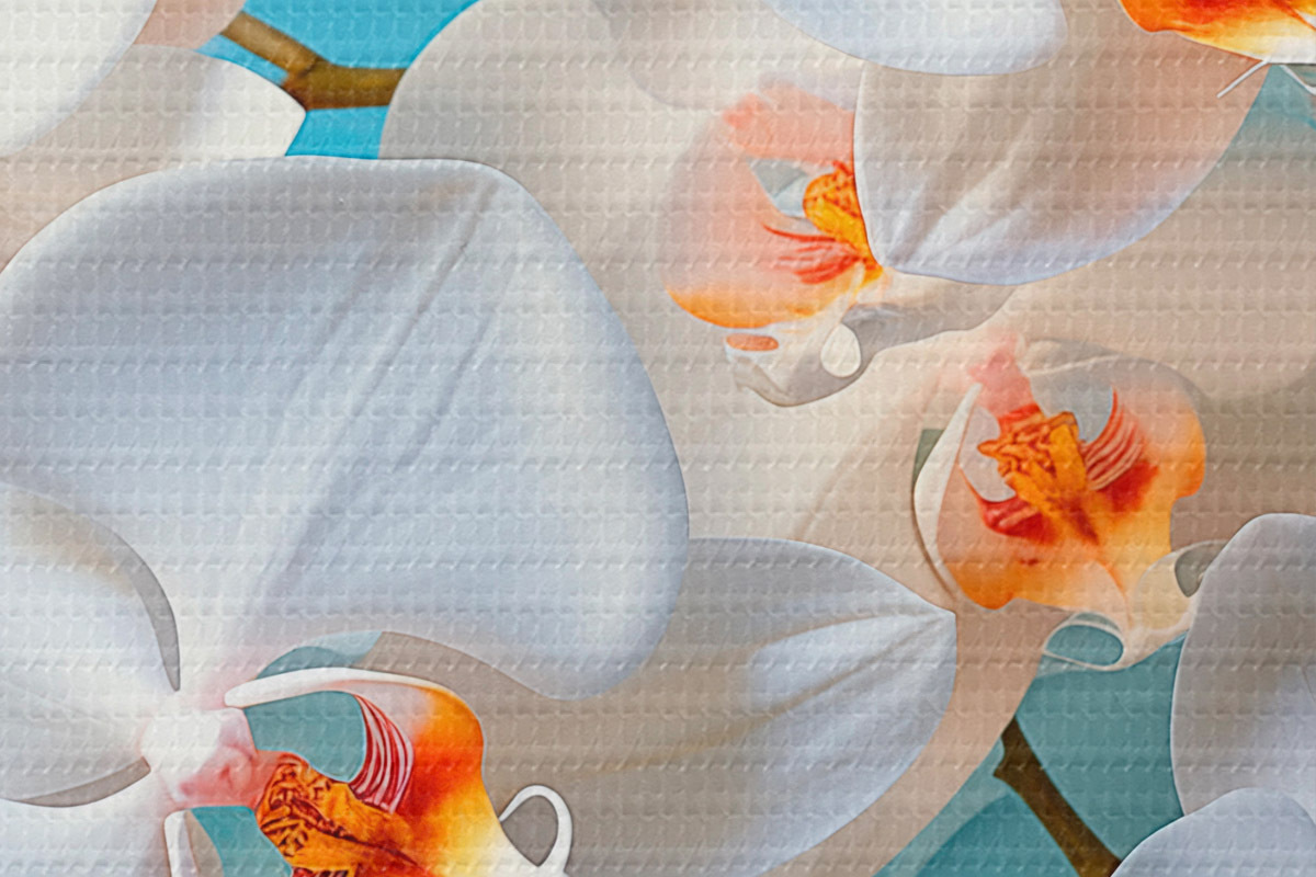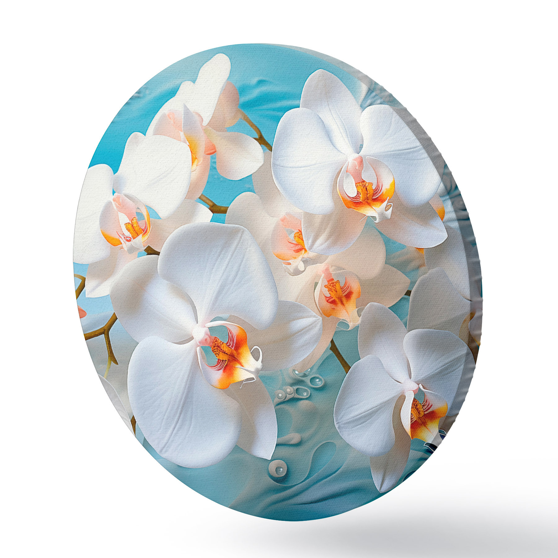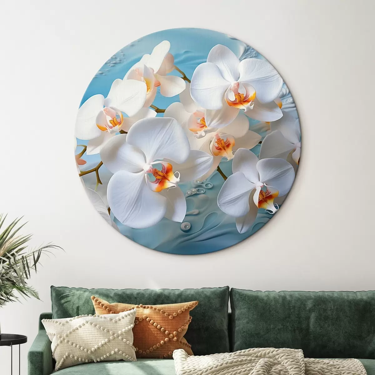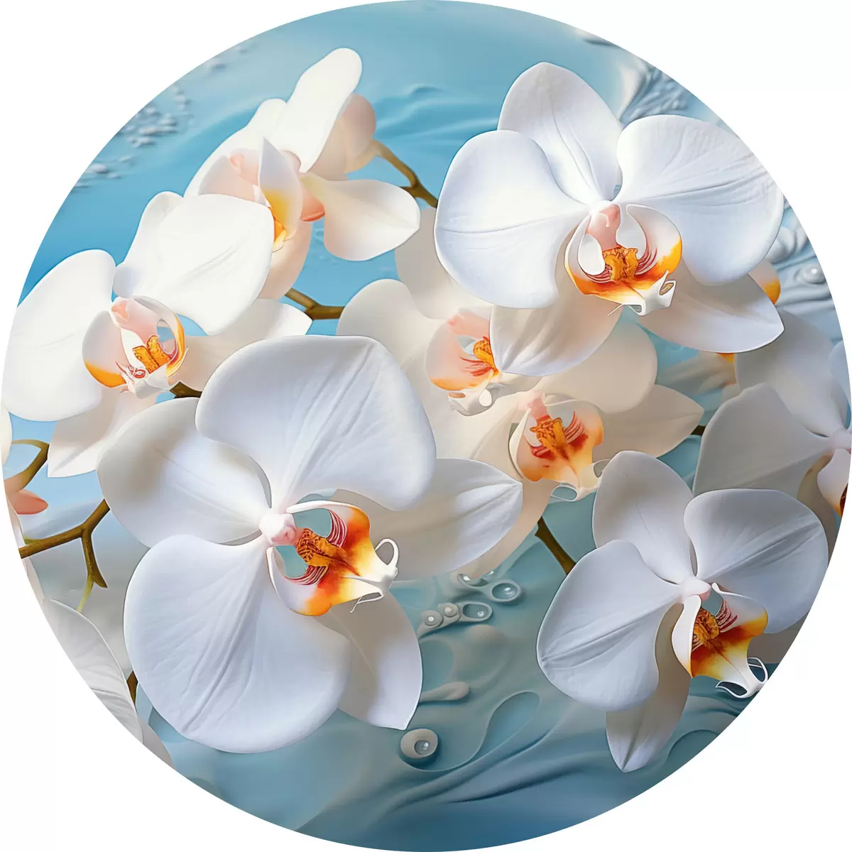 Pilt Valged orhideed, paigutatud helesinisele pinnale veetilkadega, pehme valgustus Nr r44401