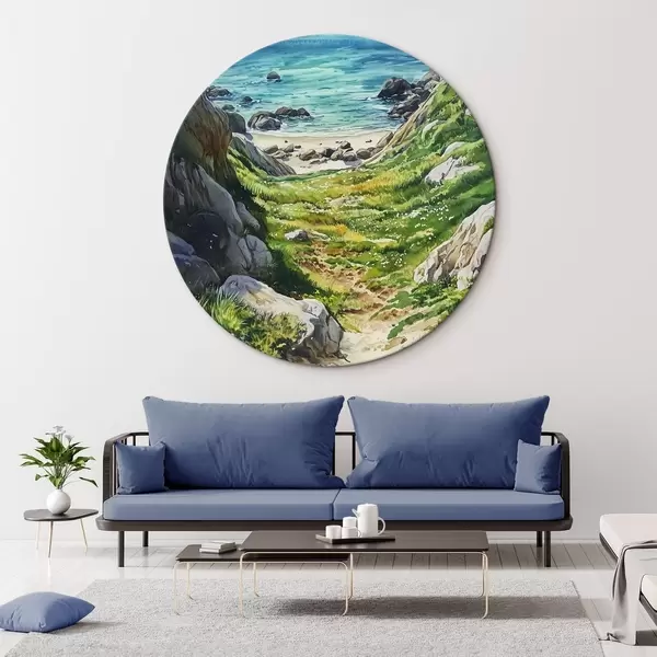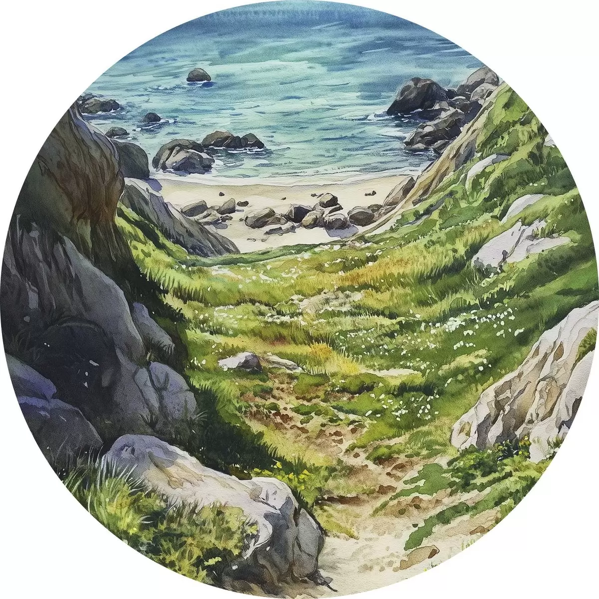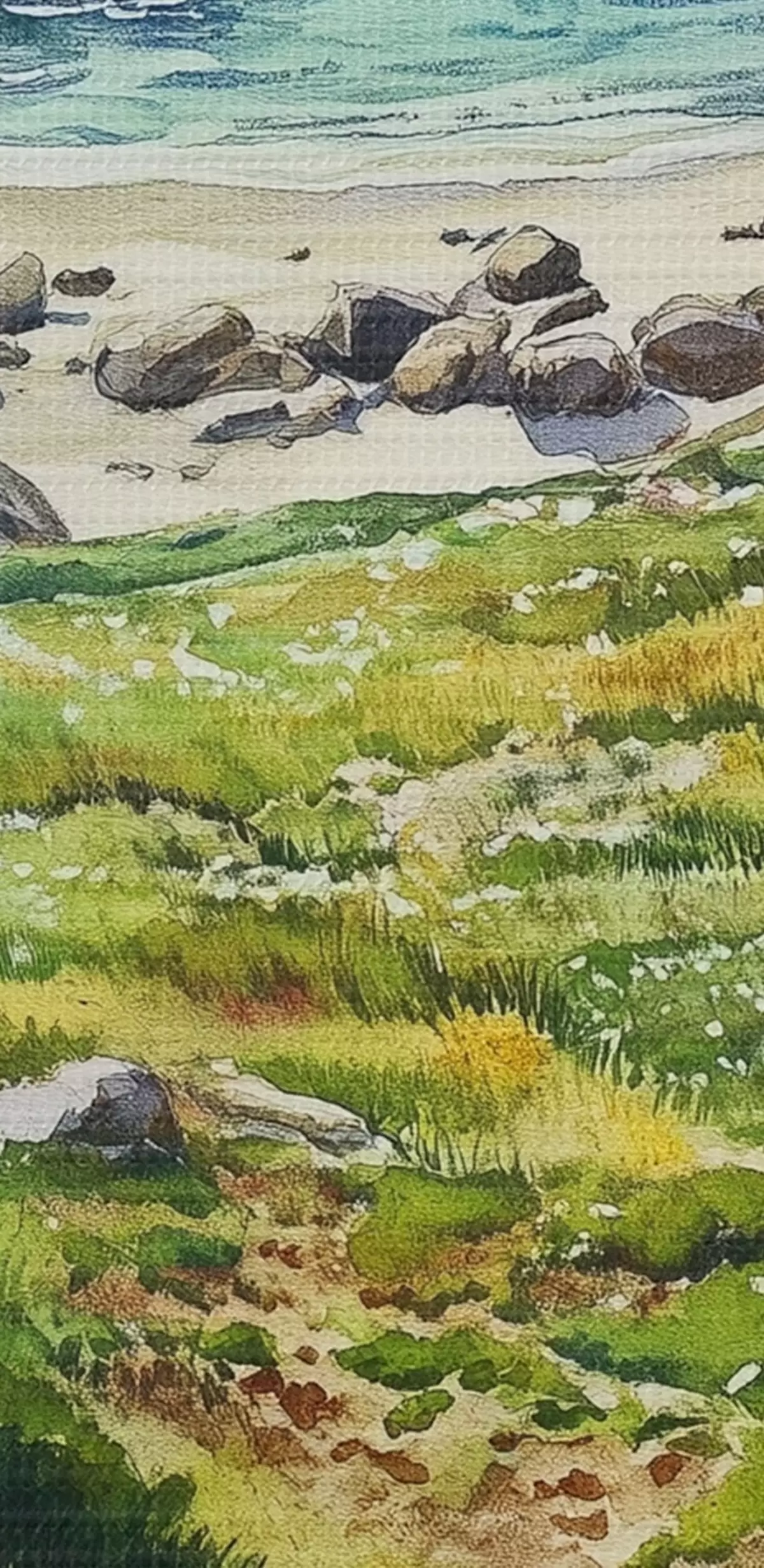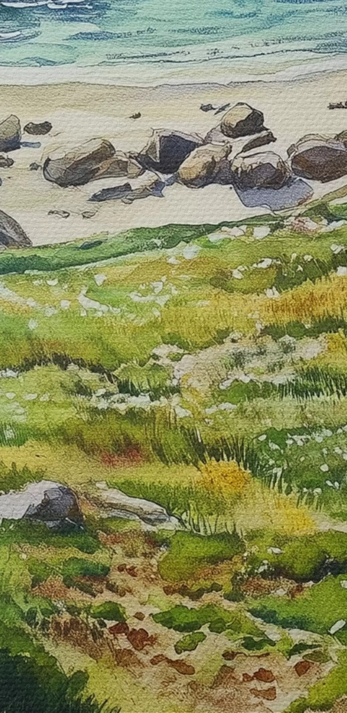 Pilt Mererannik koos kivide ja rohelise rohuga, akvarellstiilis, suvi Nr r44616