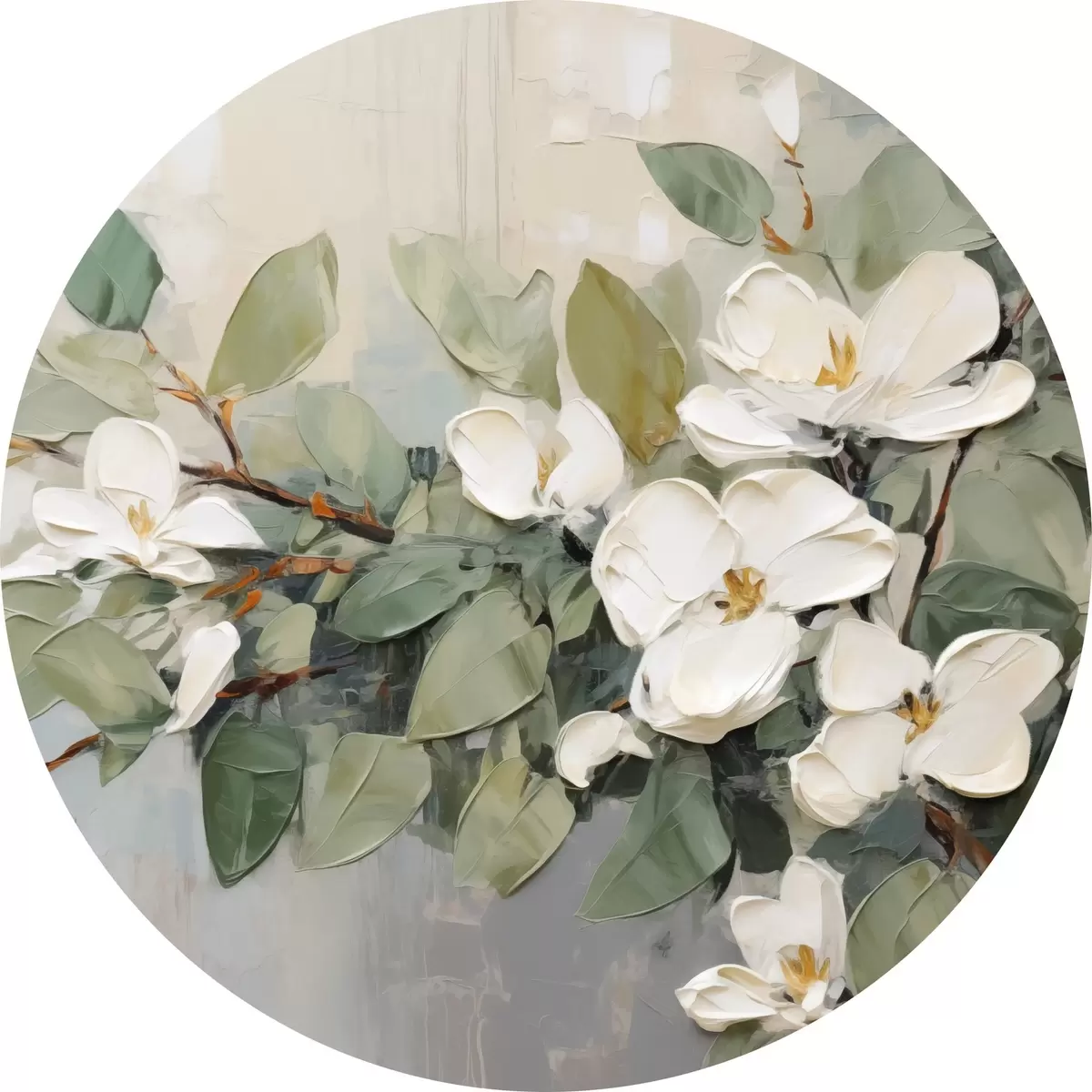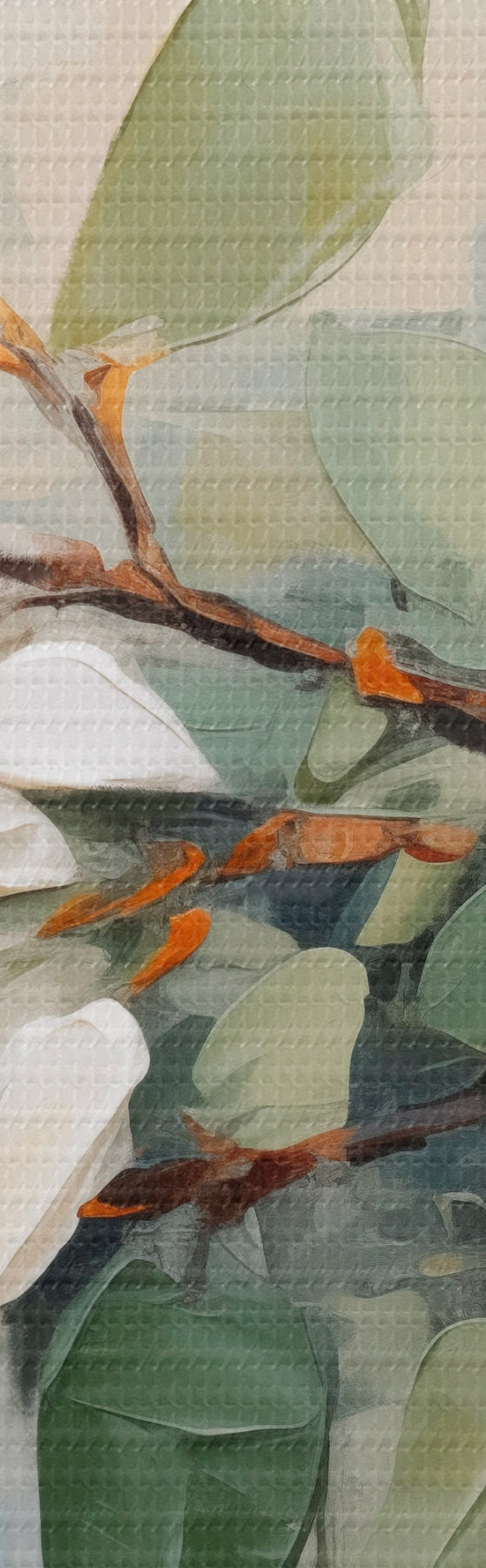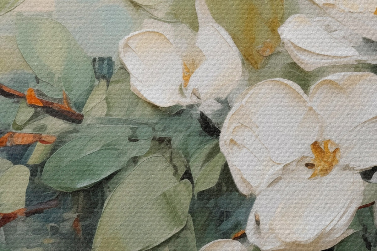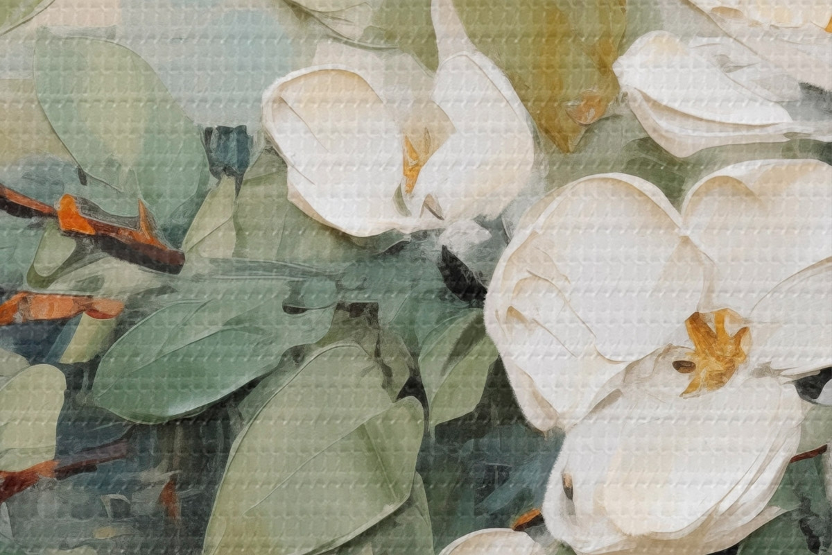 Pilt Magnoolia lilled roheliste lehtedega oksal, pastoosne tekstuurne stiil, pehme värvipalett Nr r44853