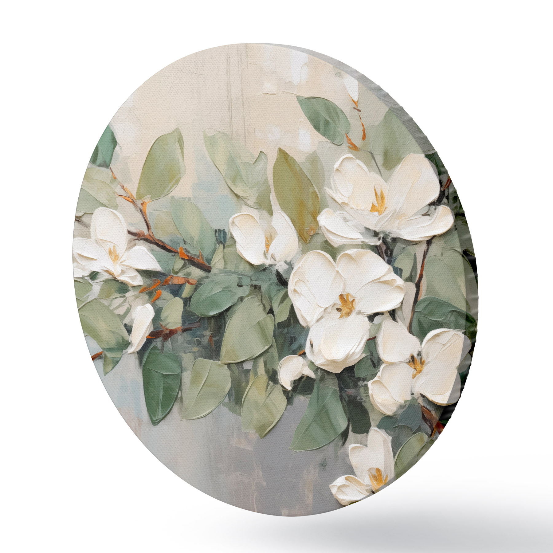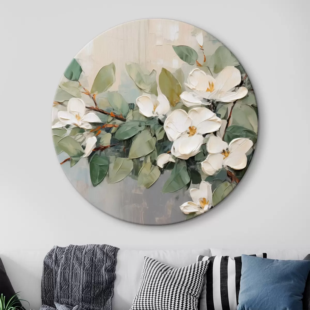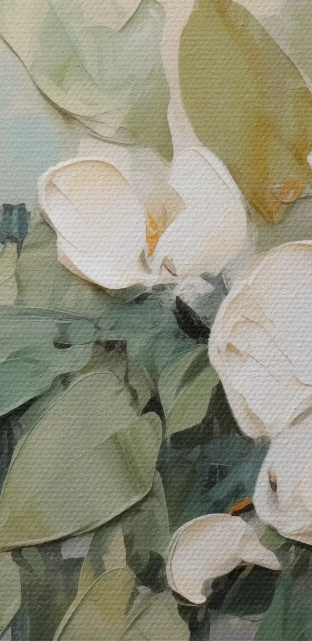Pilt Magnoolia lilled roheliste lehtedega oksal, pastoosne tekstuurne stiil, pehme värvipalett Nr r44853