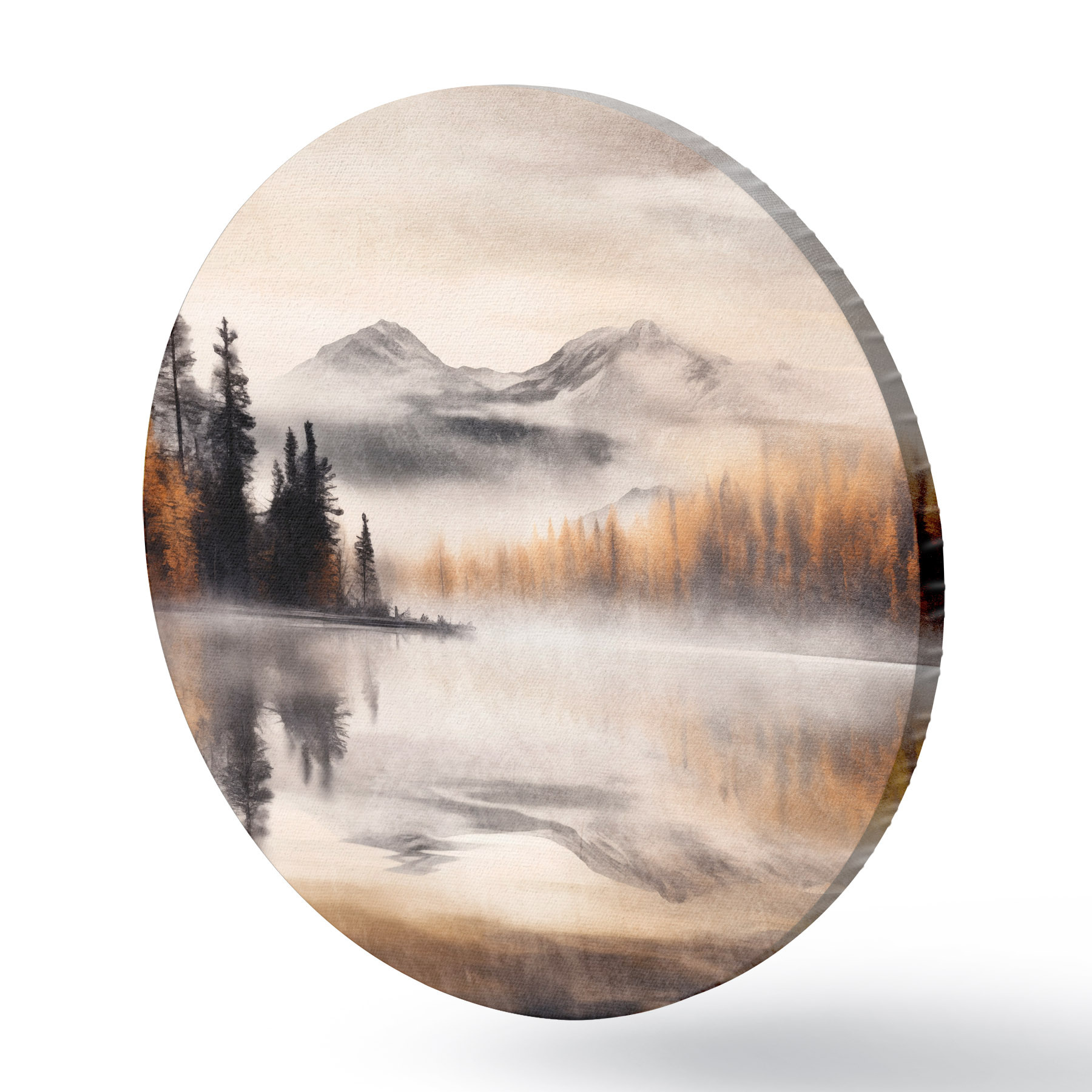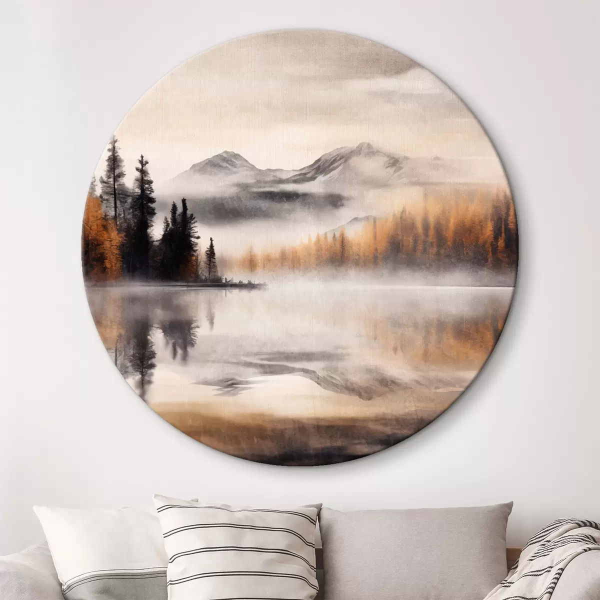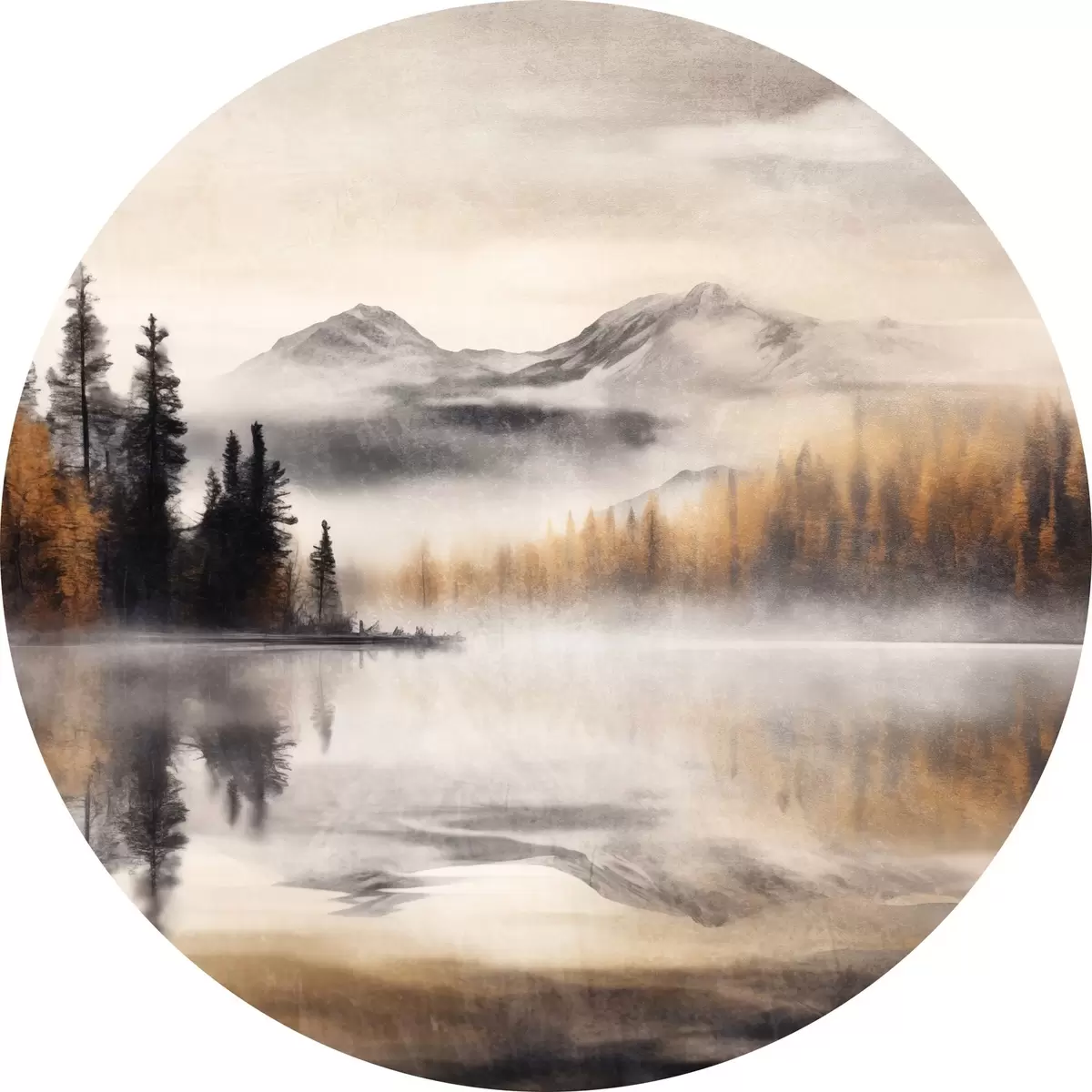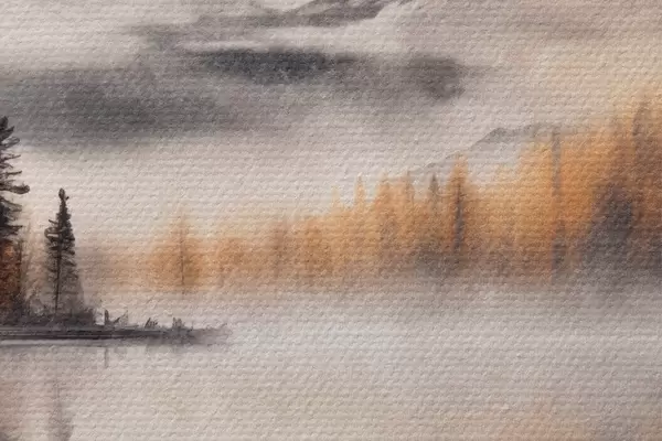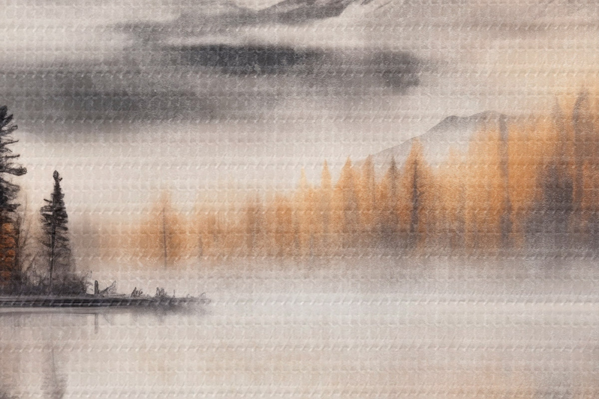 Pilt Udune tekstuurne järvemaastik mändide ja mägedega, pilvine hall taevas Nr r44856