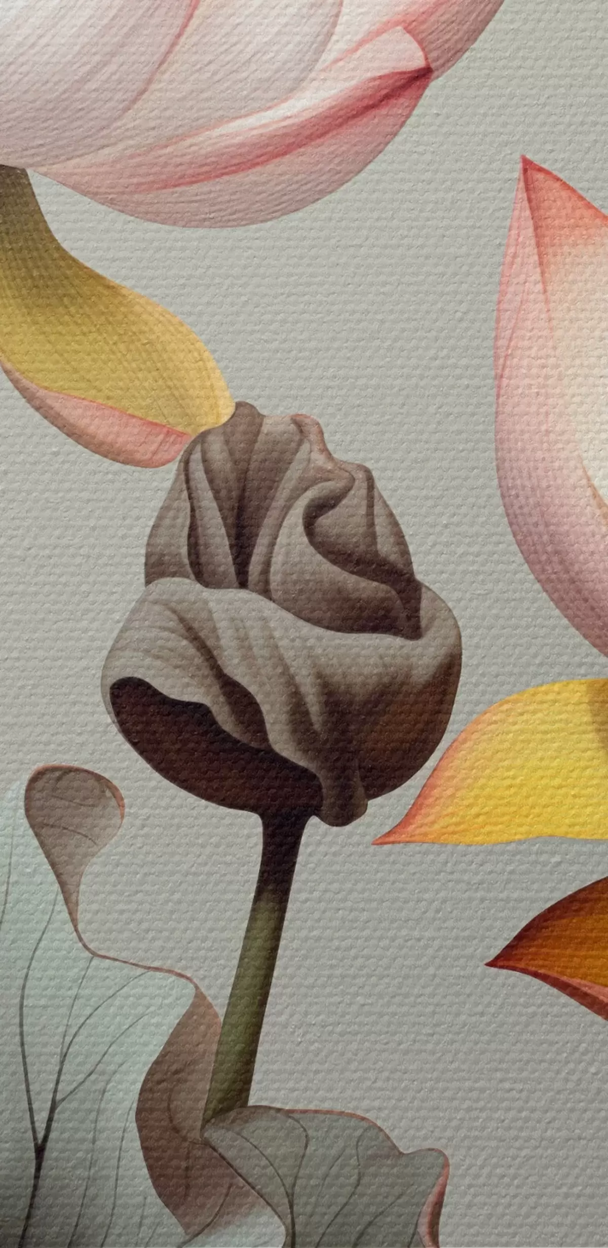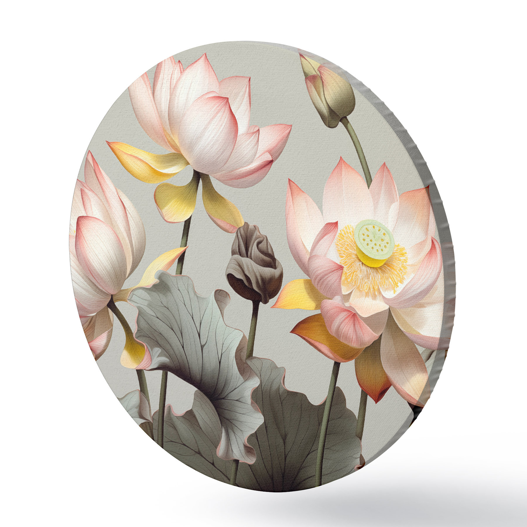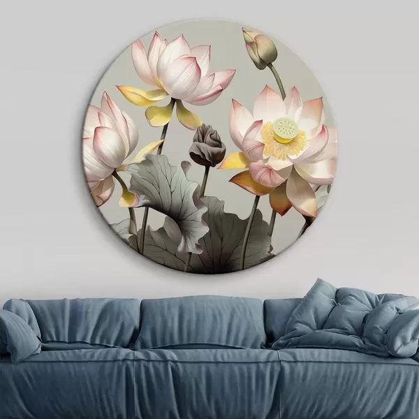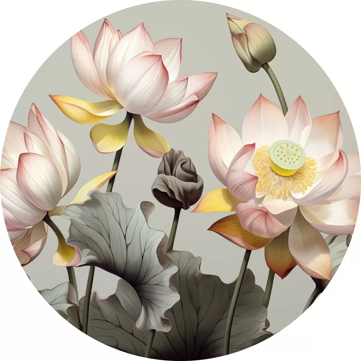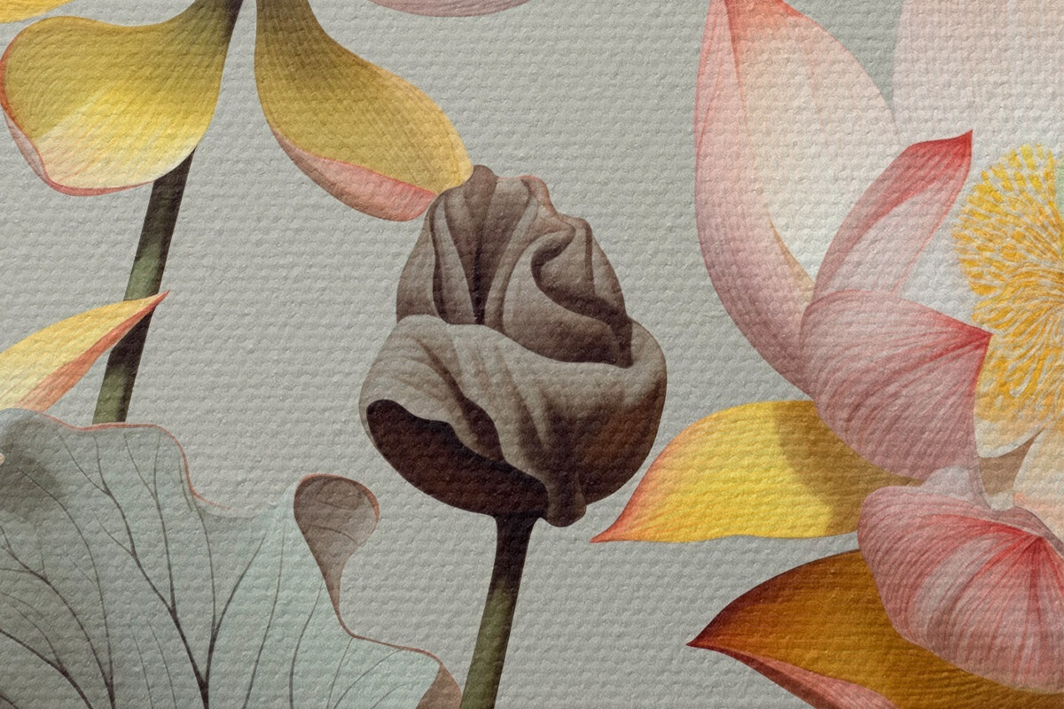 Pilt Pastelsete kroonlehtede ja roheliste lehtedega lootoslilled, vaoshoitud värvipaletis, tavalisel taustal Nr r44862
