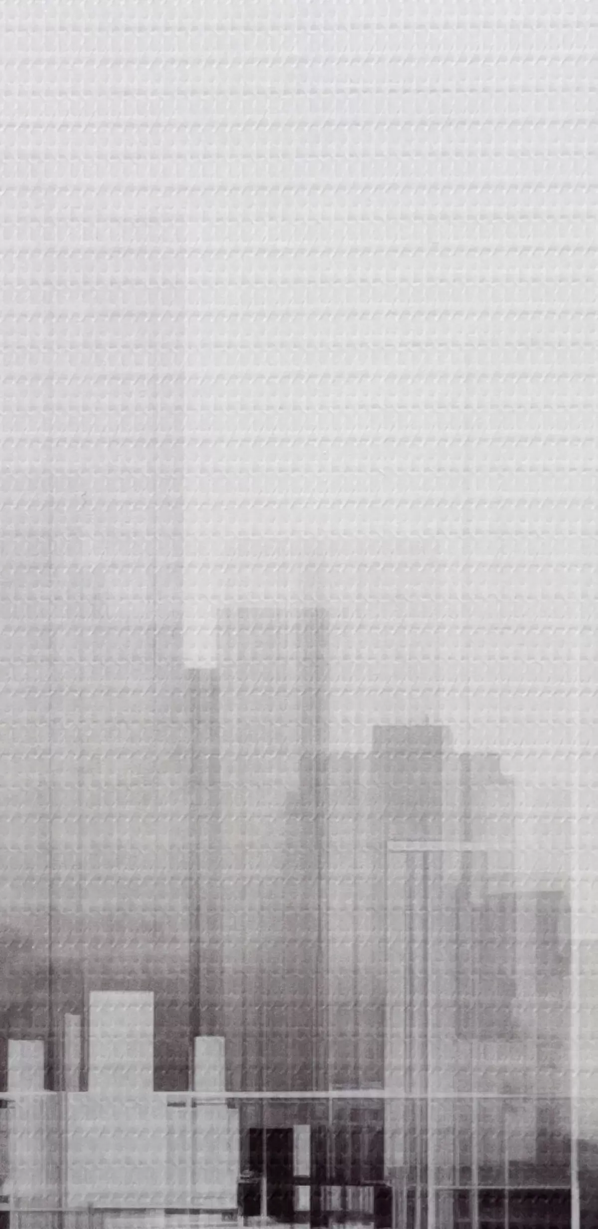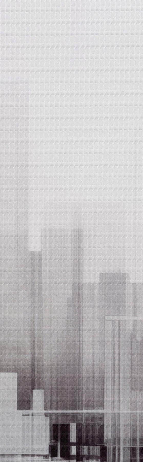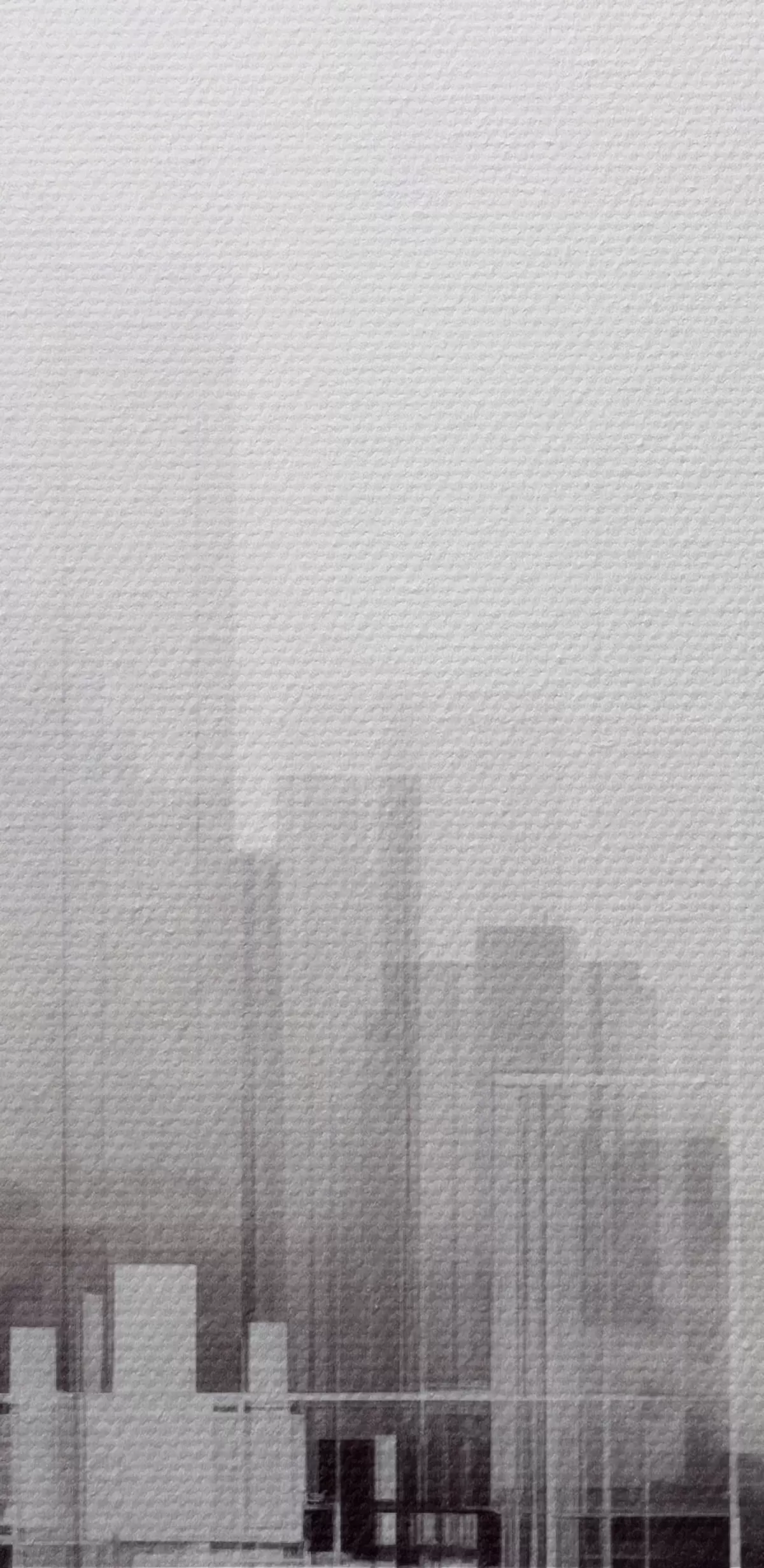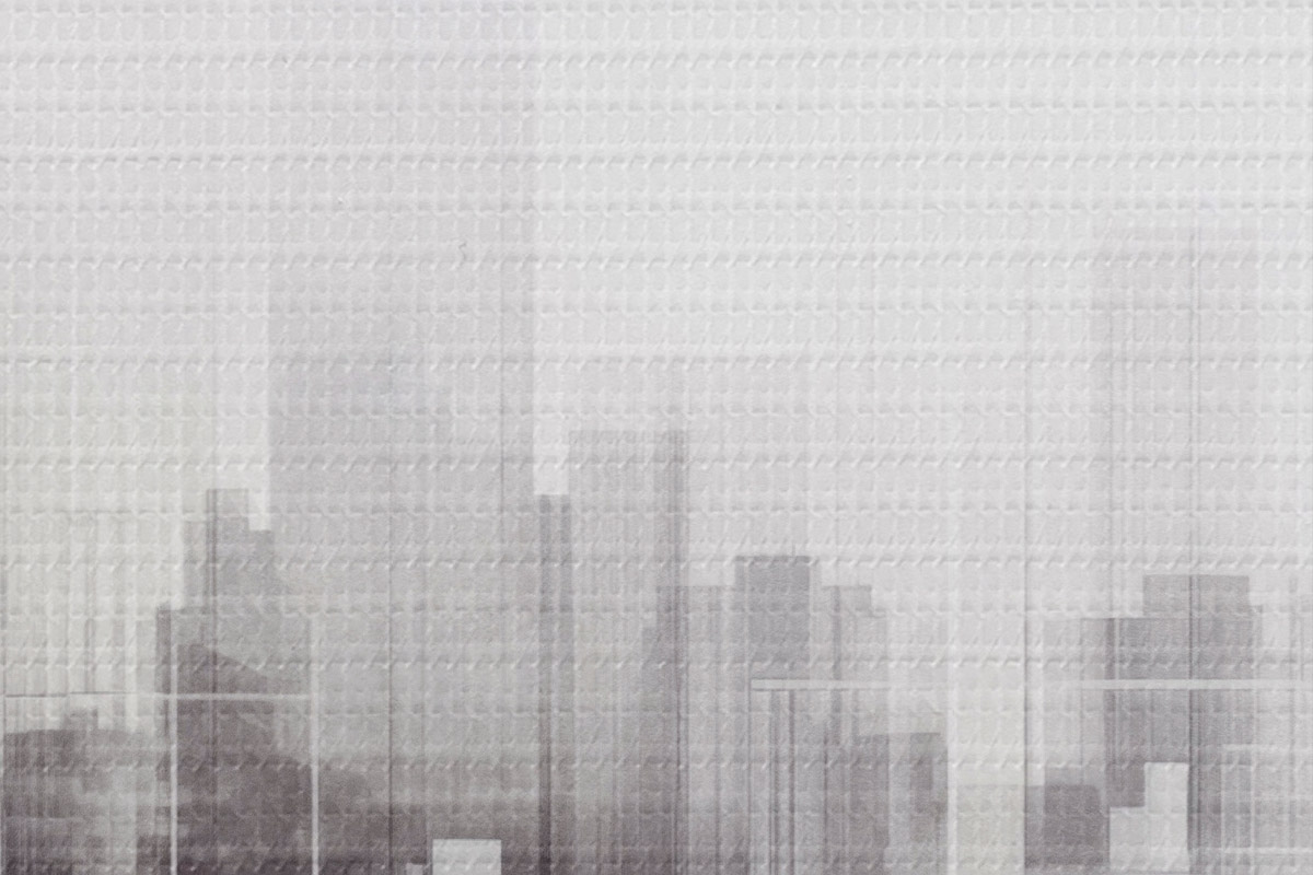 Pilt Tekstuurne minimalistlik linnapilt kõrgete hoonete ja pilvelõhkujatega, siluettidena valge taeva taustal Nr r44863
