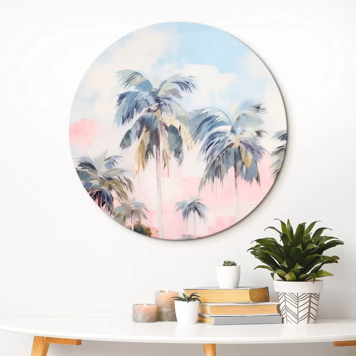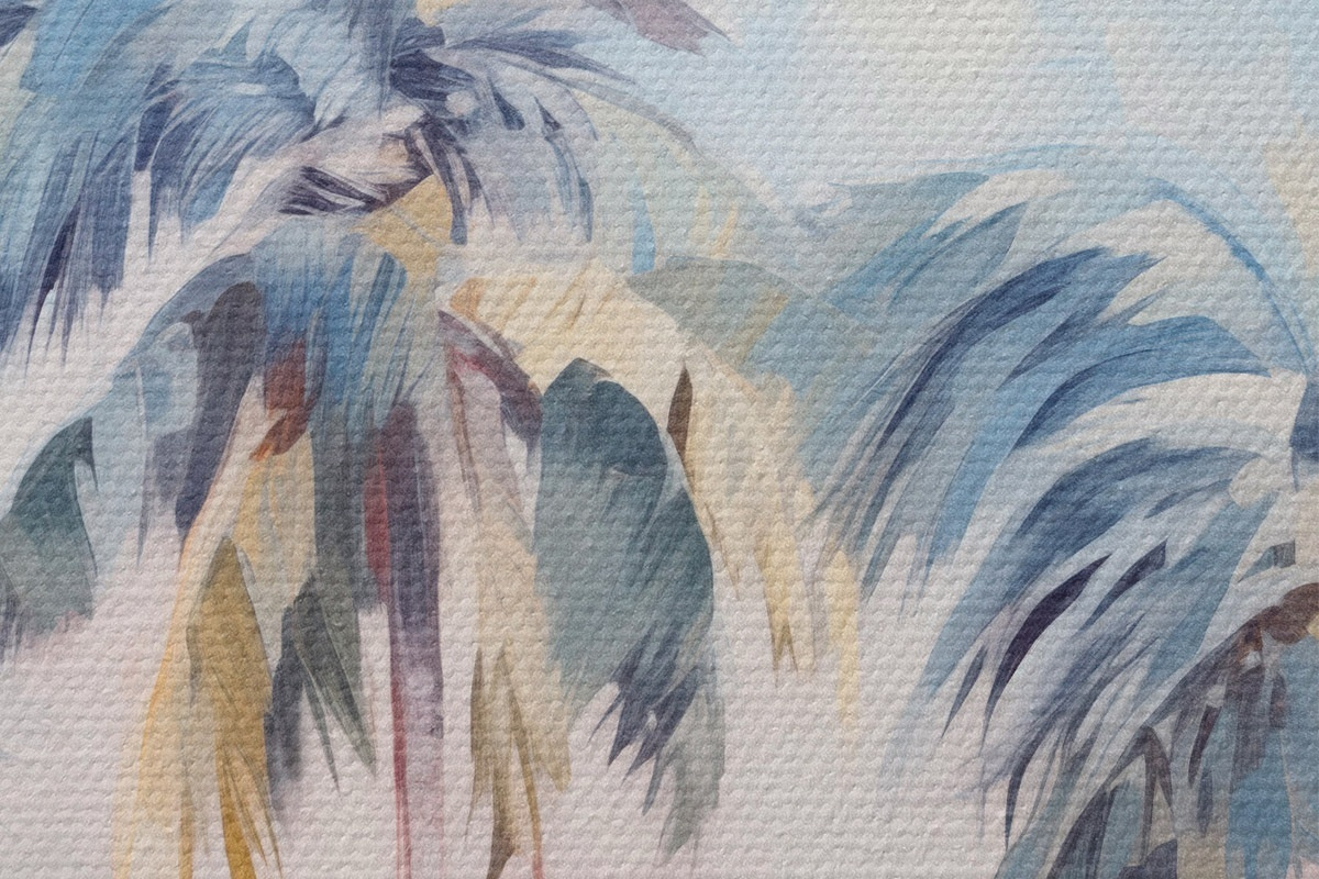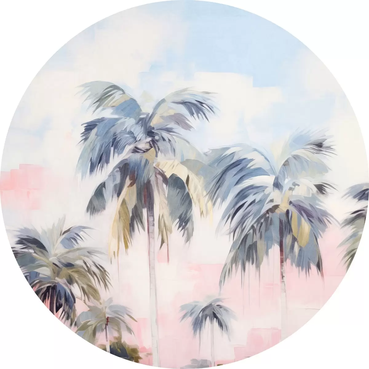 Pilt Pastelsete lehtede ja pruunide tüvedega palmid, roosa ja sinine taevas, troopiline keskkond Nr r44866