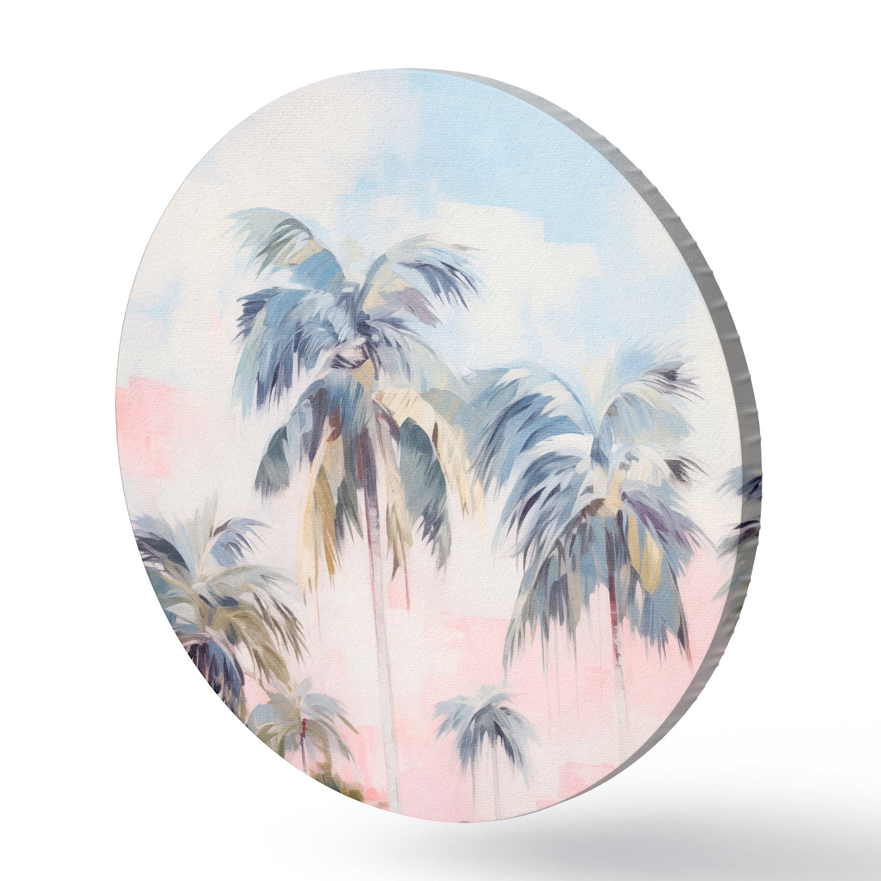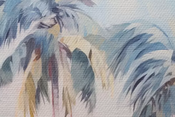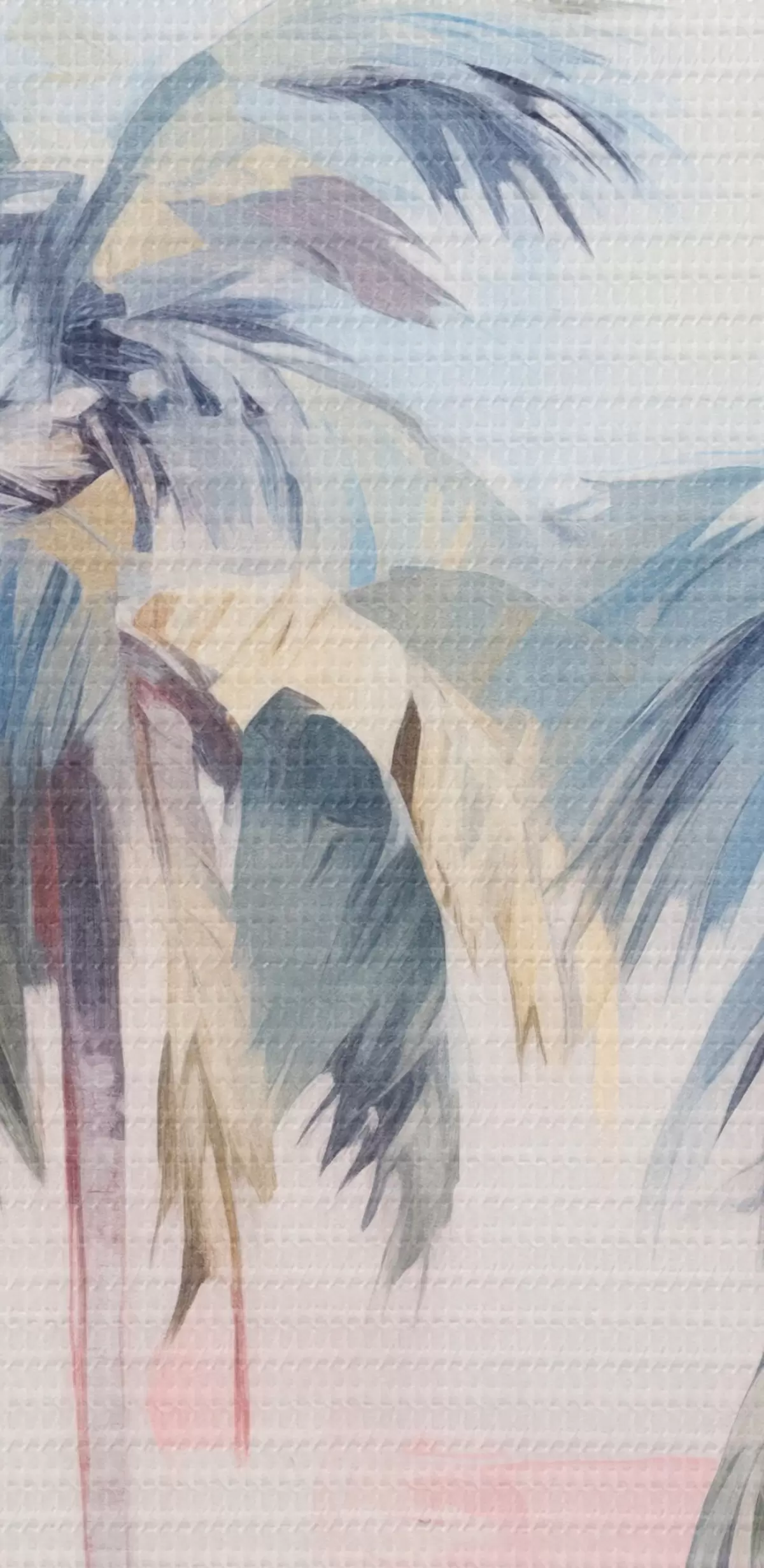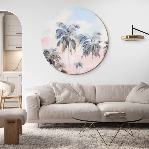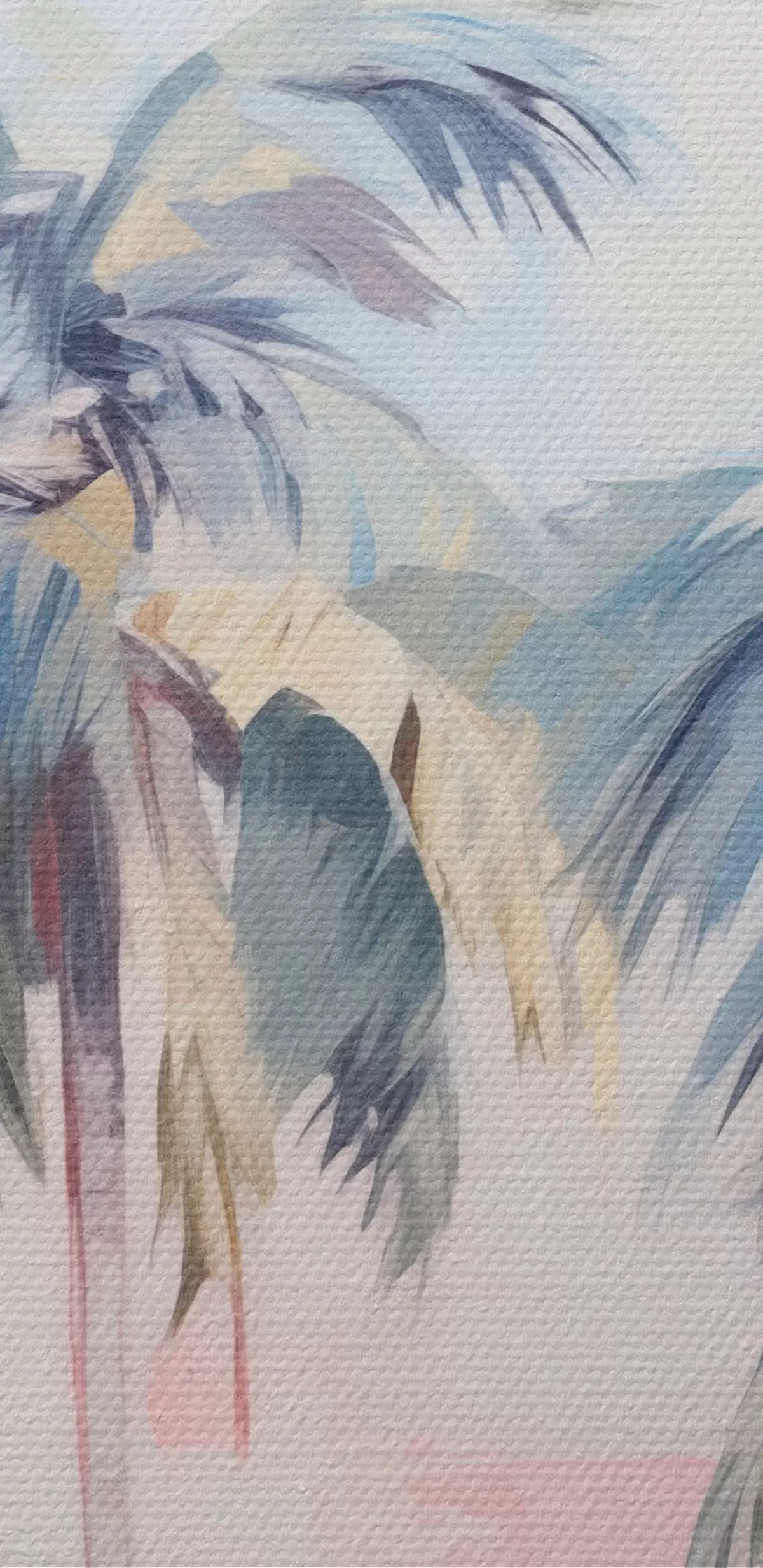 Pilt Pastelsete lehtede ja pruunide tüvedega palmid, roosa ja sinine taevas, troopiline keskkond Nr r44866