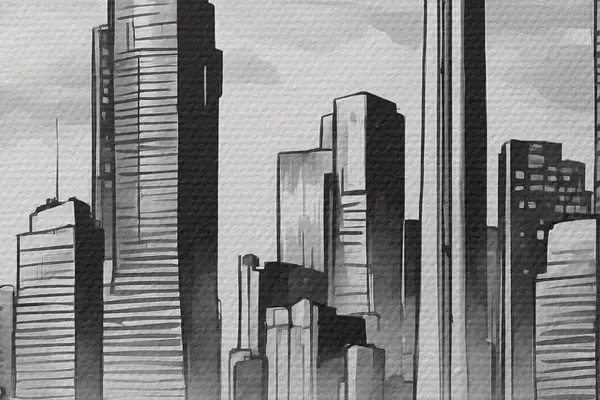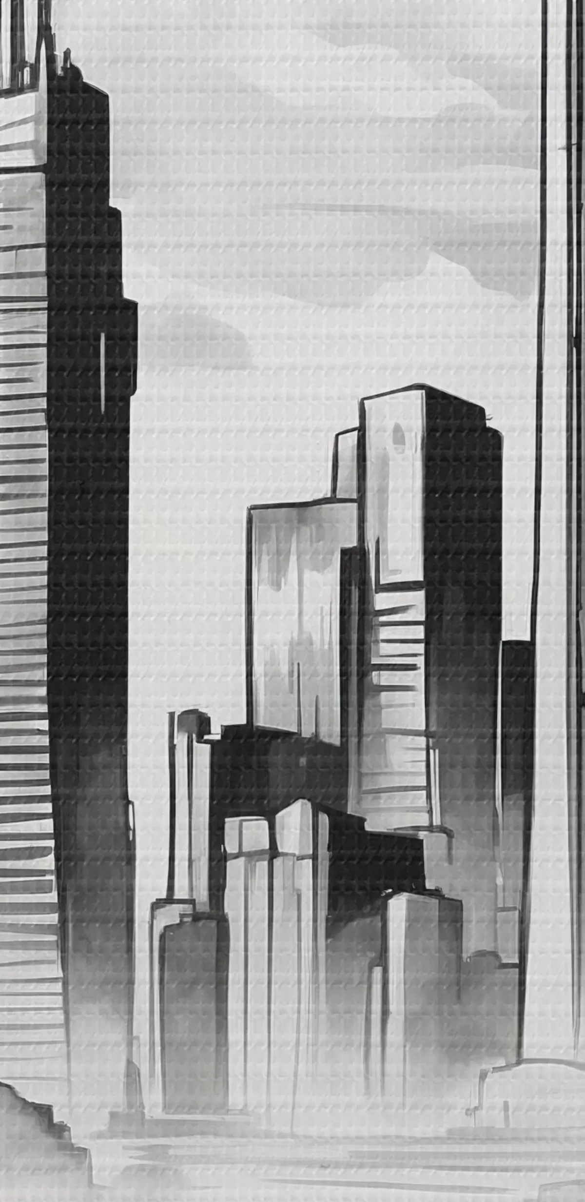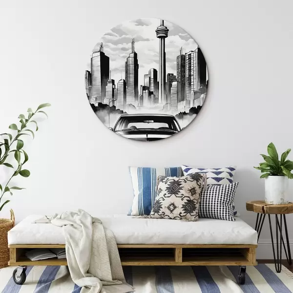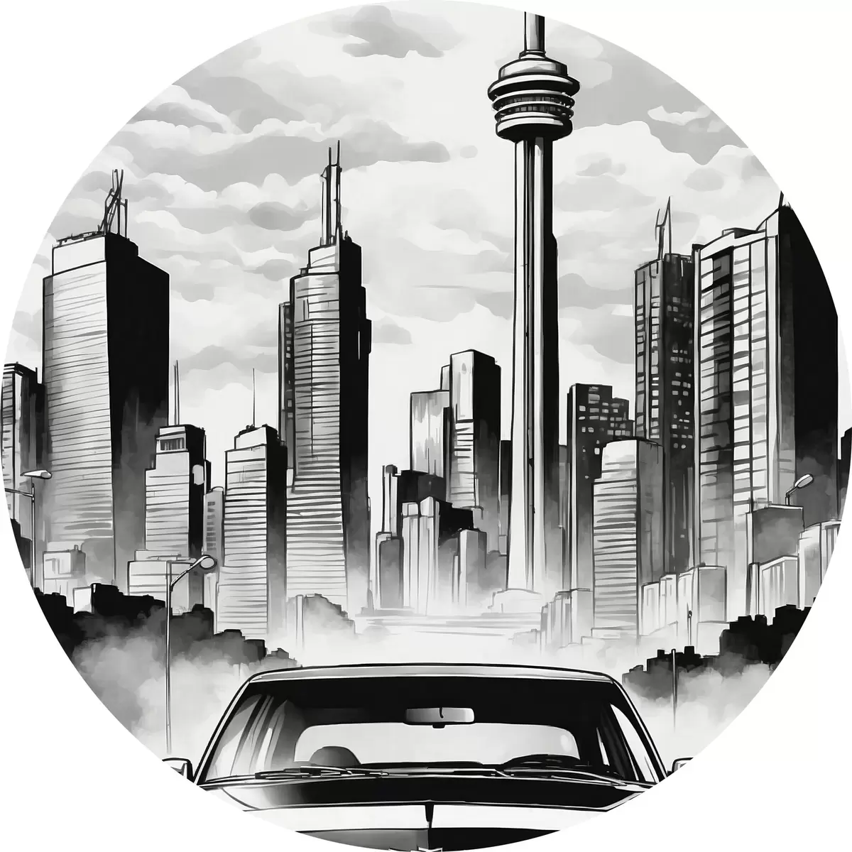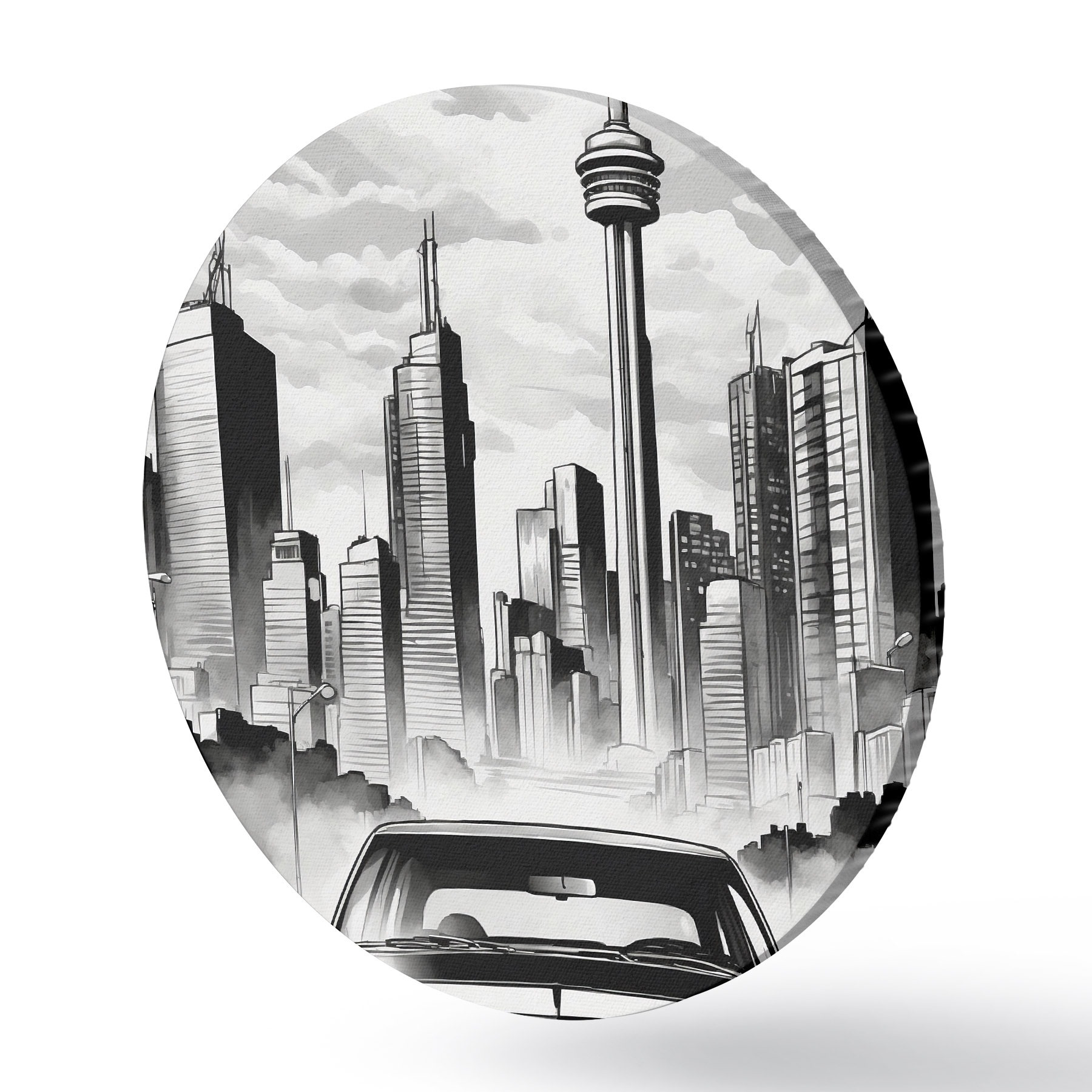 Pilt Retro auto ühevärvilise linna taustal koos pilvelõhkujatega Nr r44871