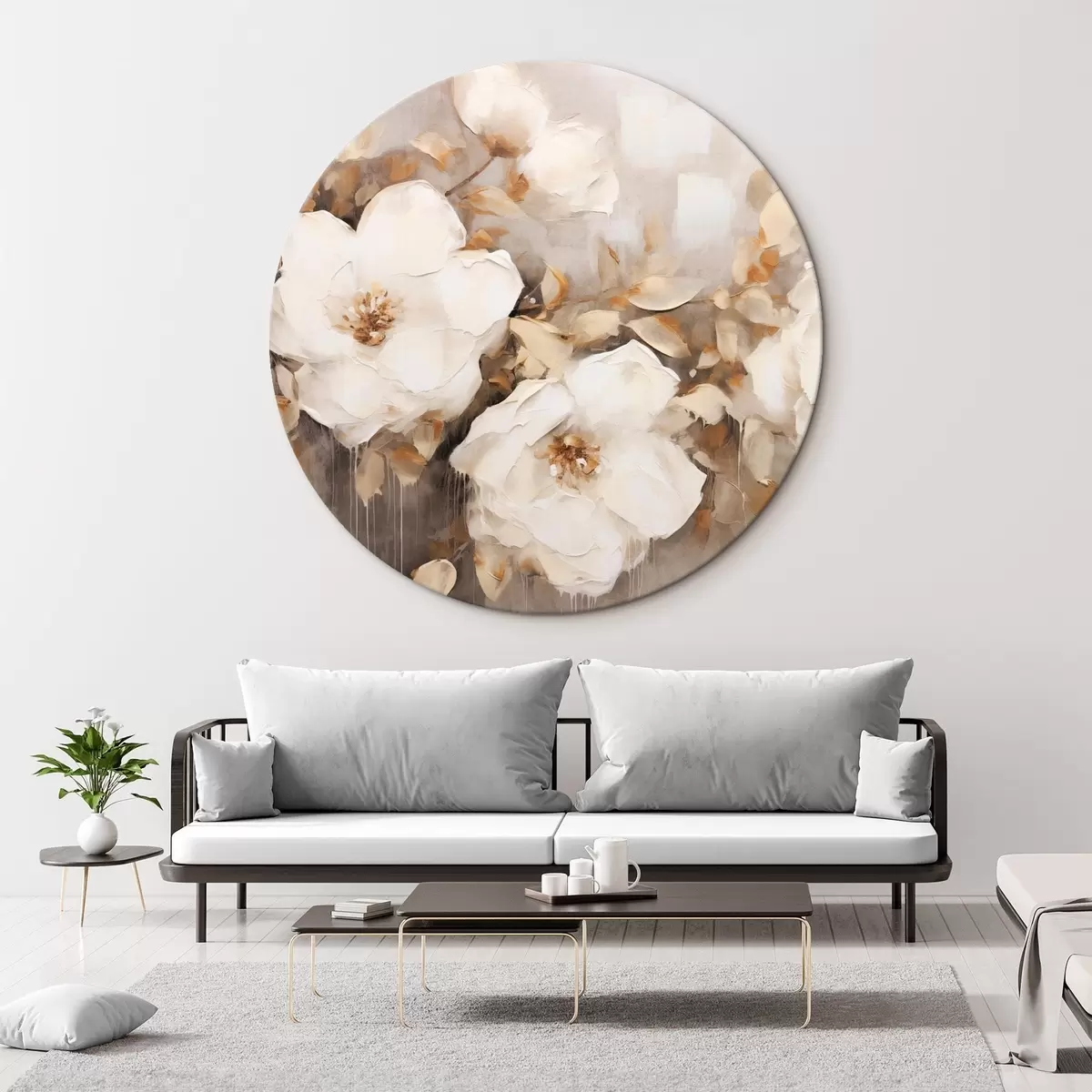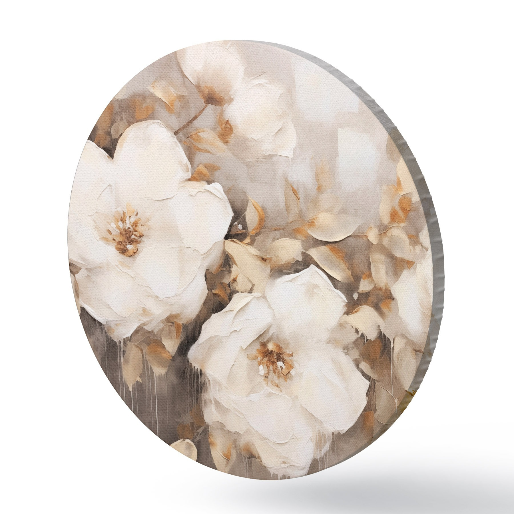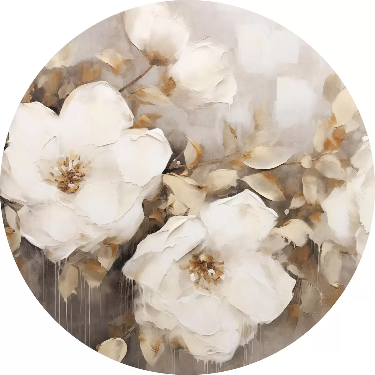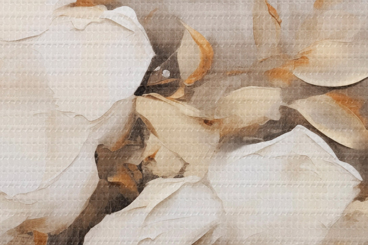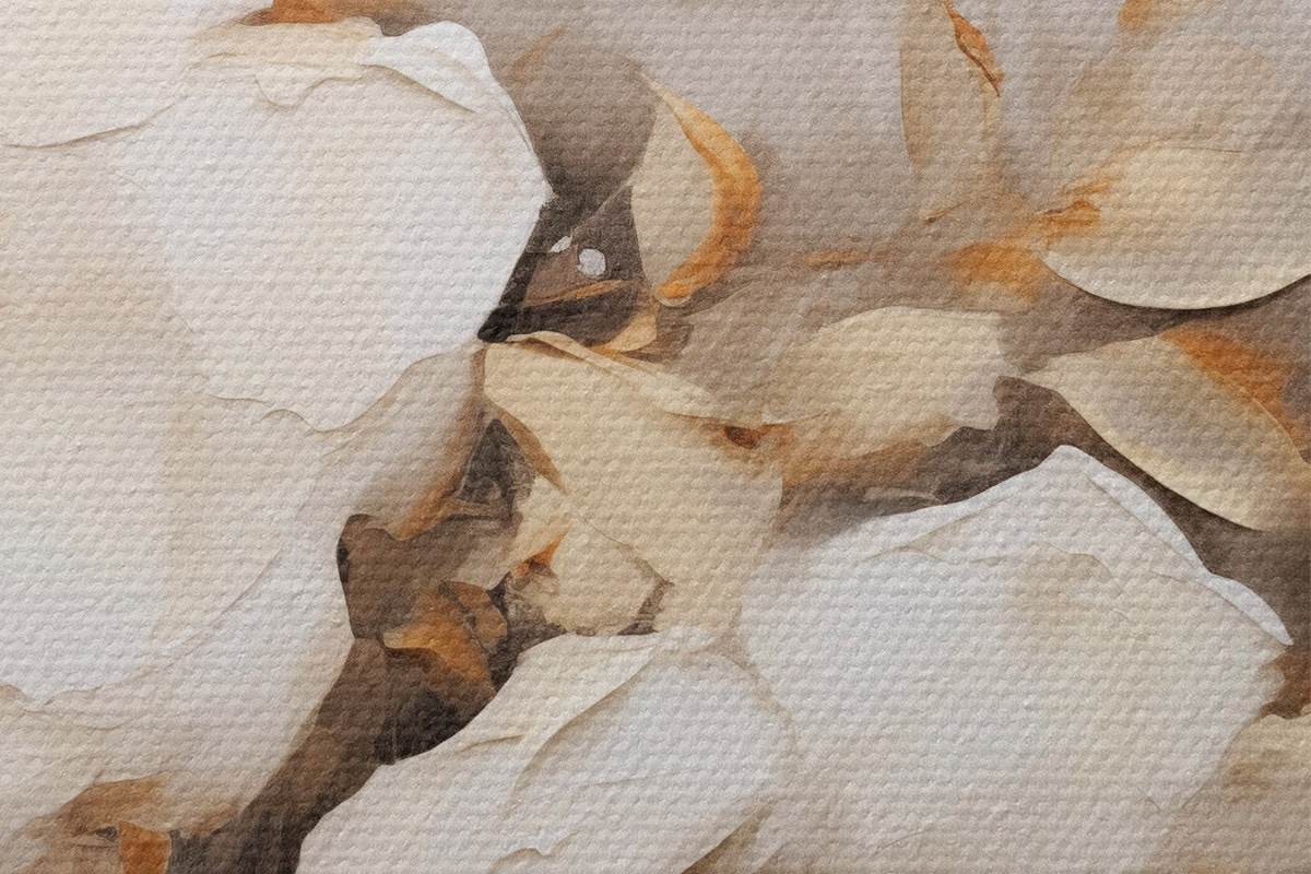 Pilt Valged lilled koos pruunide lehtedega beežil taustal, õlimaalide imitatsioon, lillekokkulepe, botaaniline kunst Nr r44922