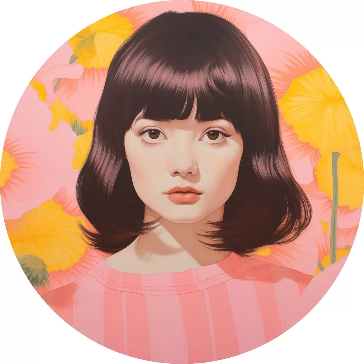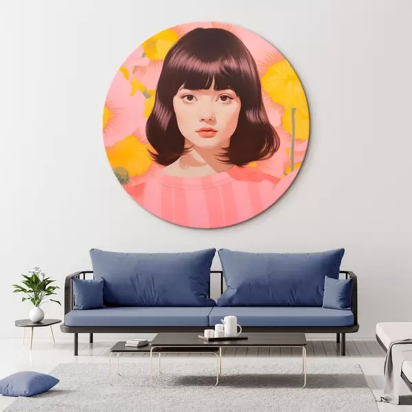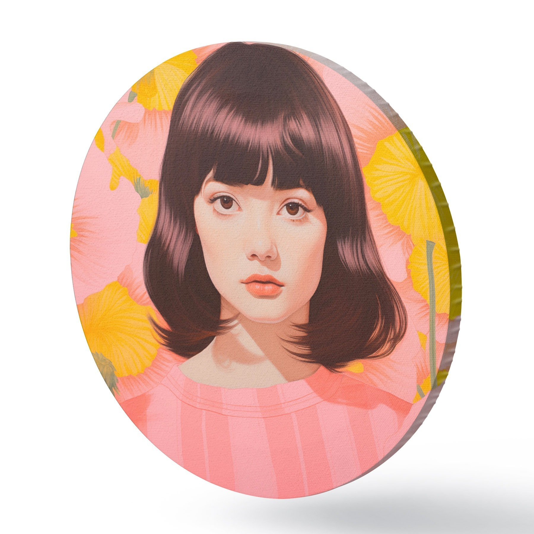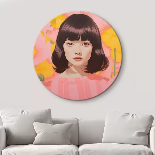 Pilt Dekoratiivne minimalistlik portree aasia tüdrukust kollaste ja roosade lillede väljal Nr r44924