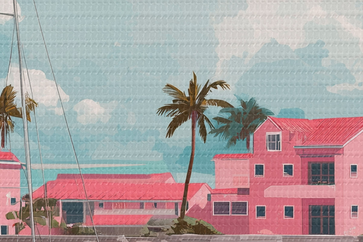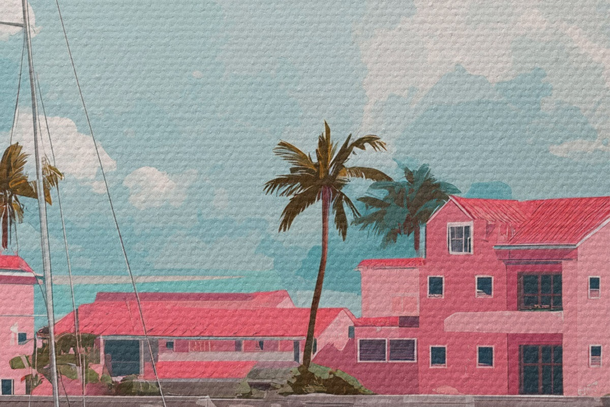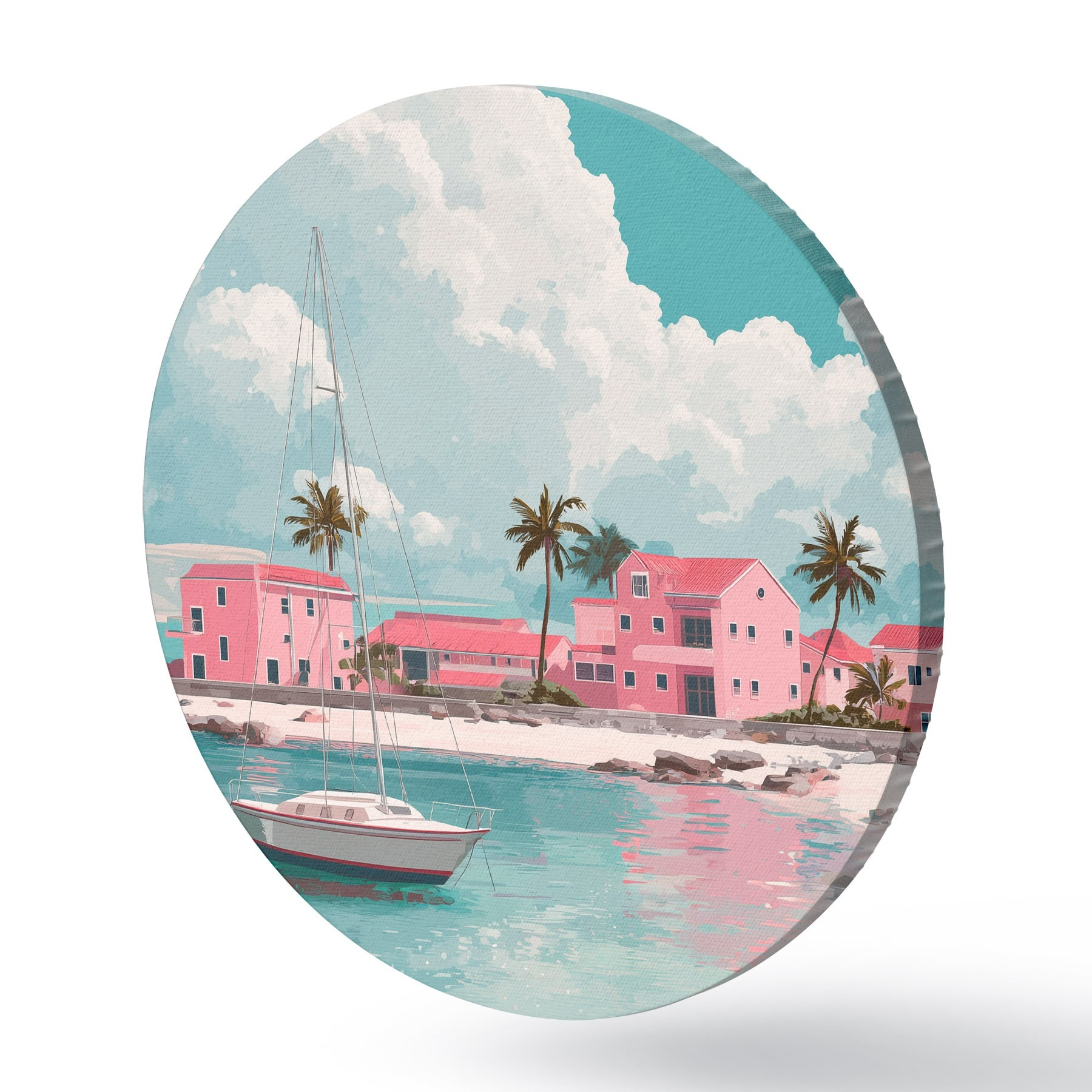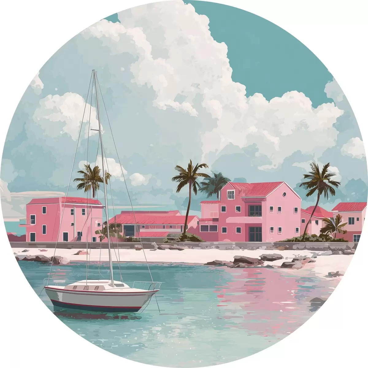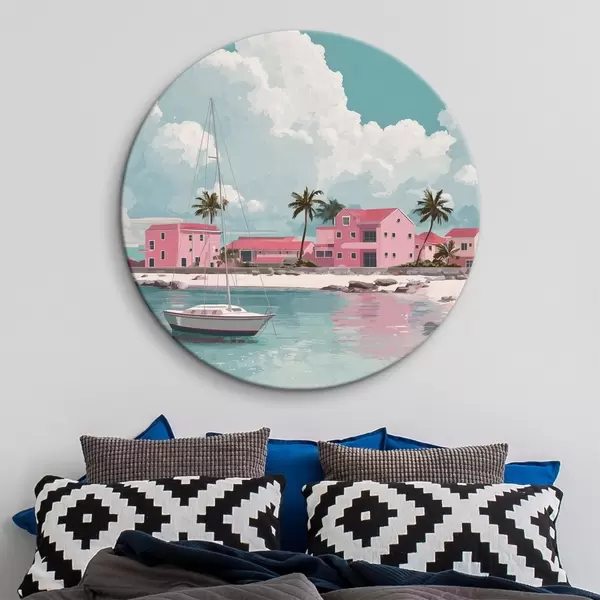 Pilt Roosa rand heleda päikesepaistega, purjekas ja majad Nr r44986