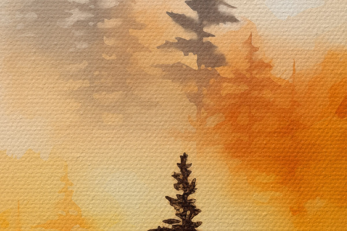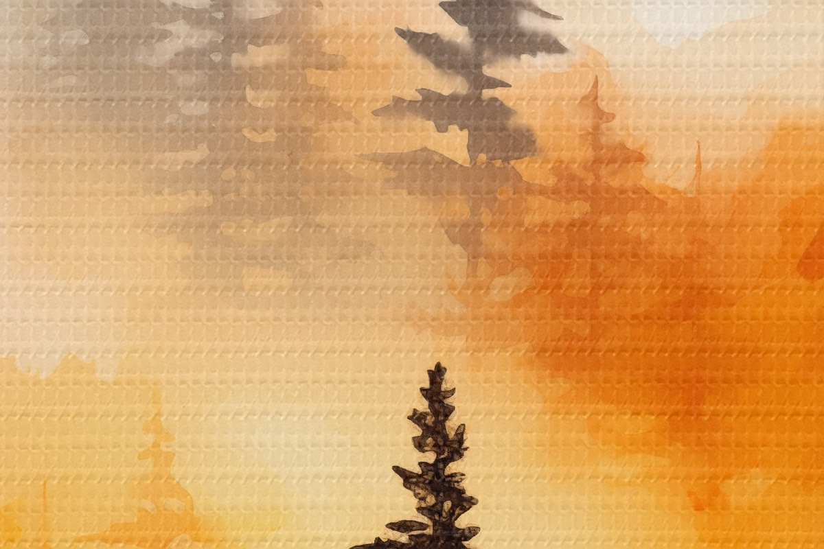 Pilt Maastiku akvarellmaal imitatsioon metsa kõrge männi ja mägedega taustal Nr r45170