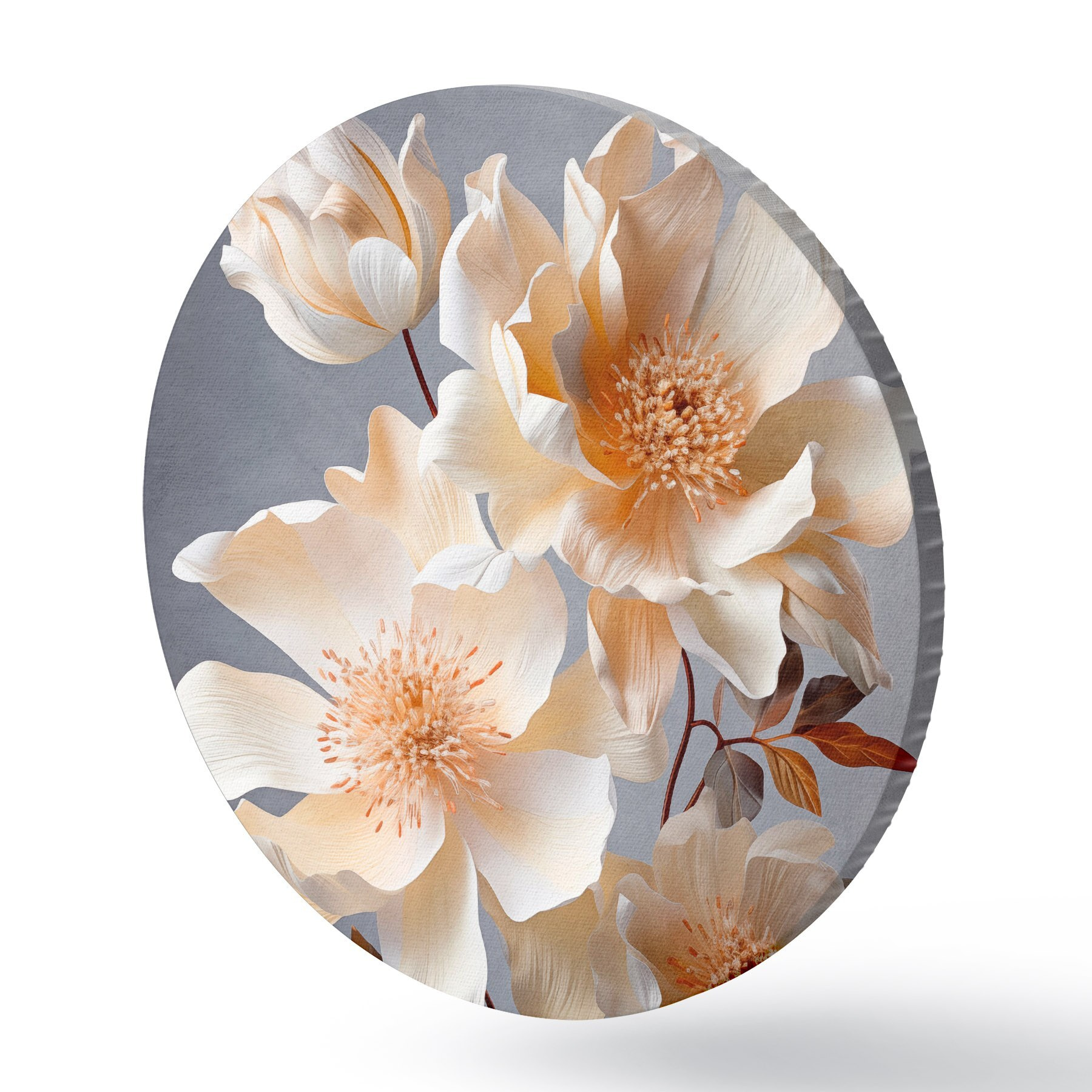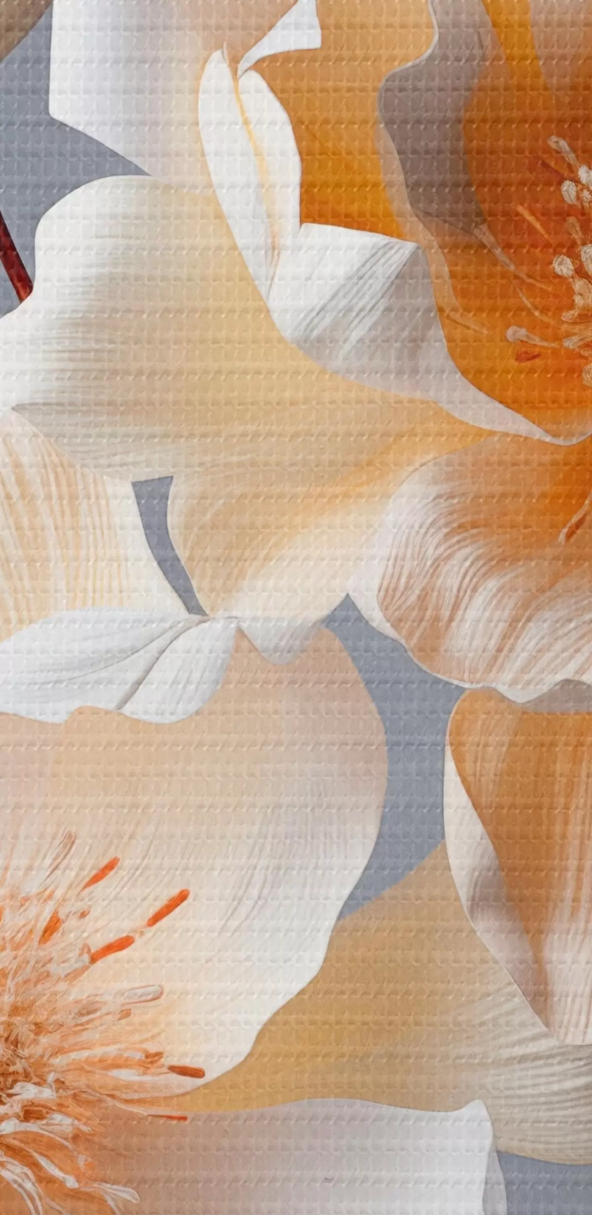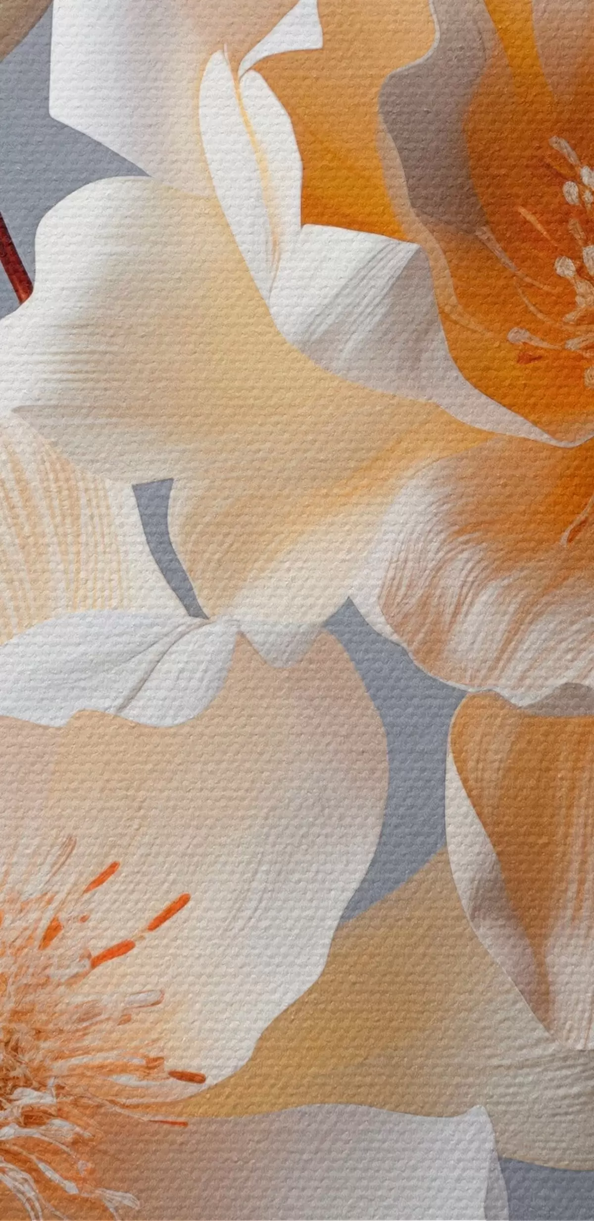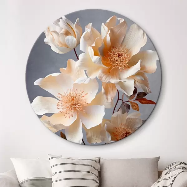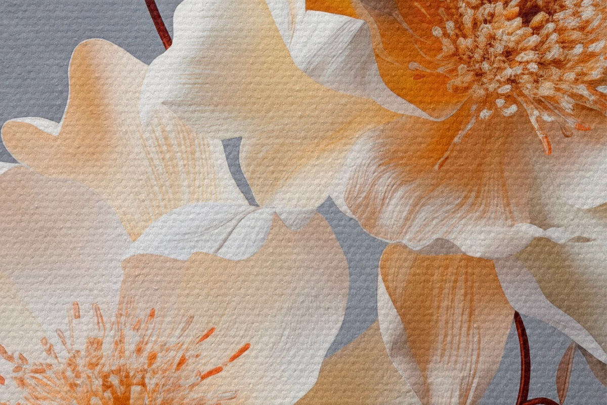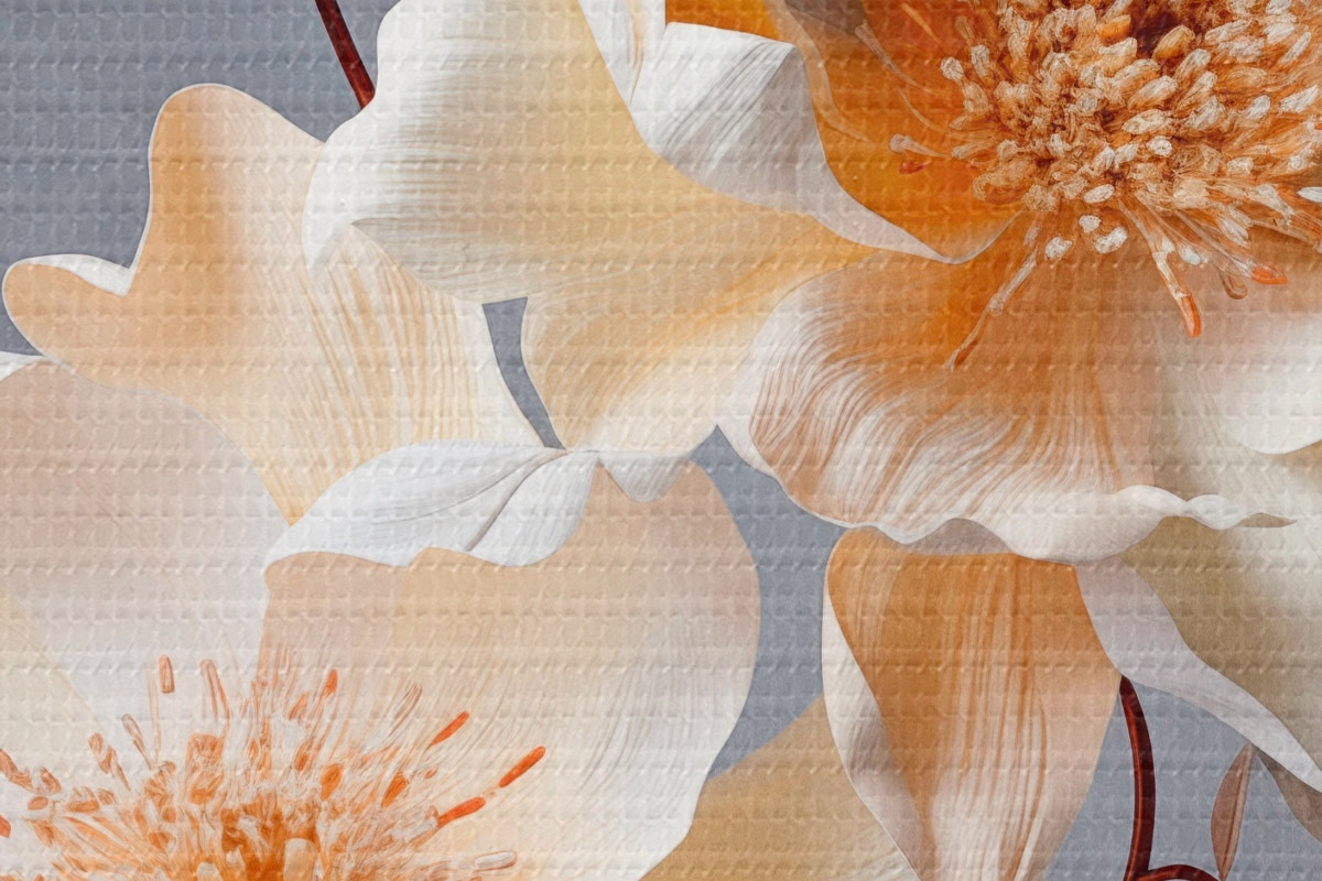 Pilt Tekstuursed lilled oranžide õite ja oranžide lehtedega halli taustal, pehme valgus, elegantne, detailne, realistlik Nr r45181