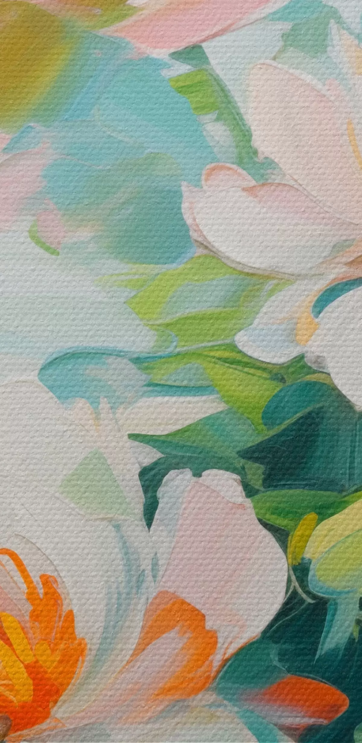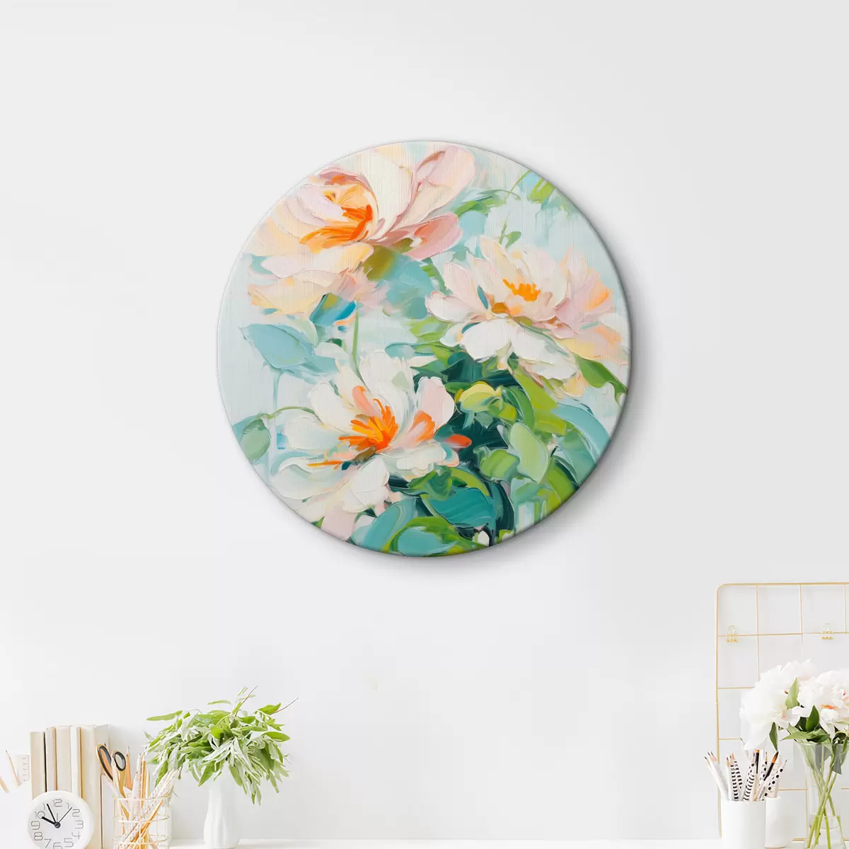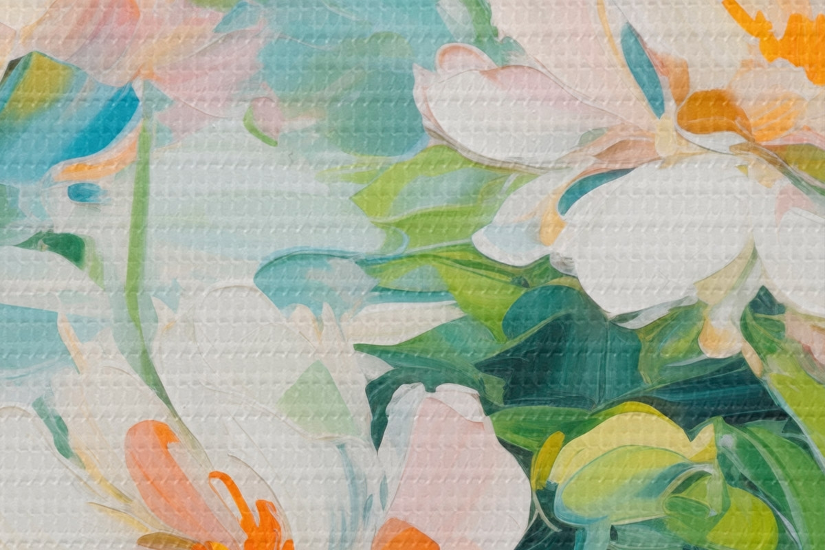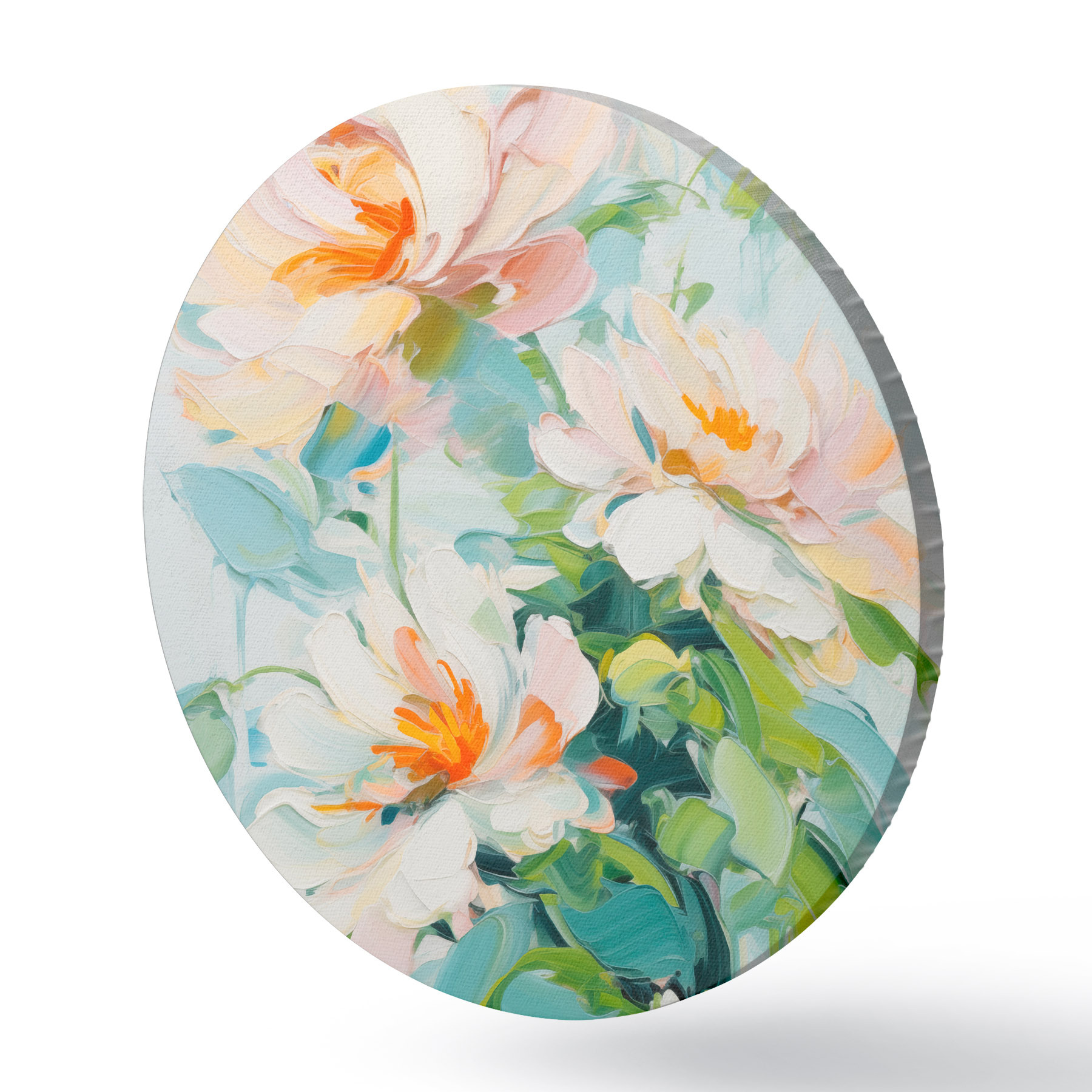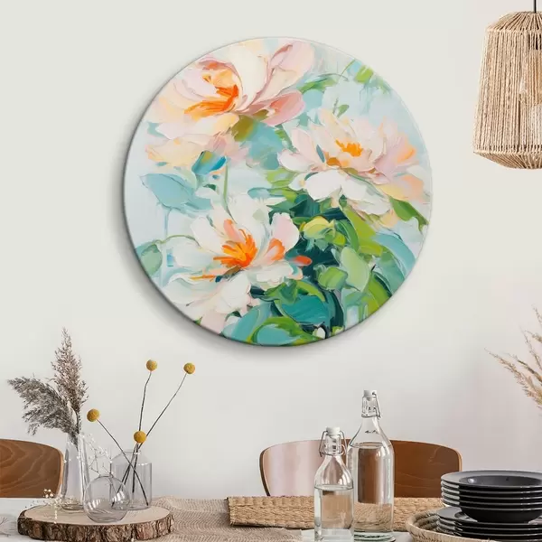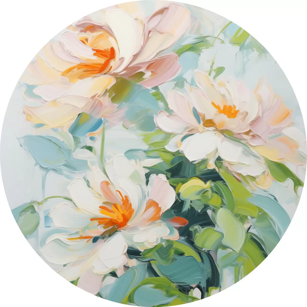 Pilt Valge ja pastell virsiku lilled, rohelised lehed, pehmed pintslitõmbed õlimaali imitatsioon, helesinine taust Nr r45550