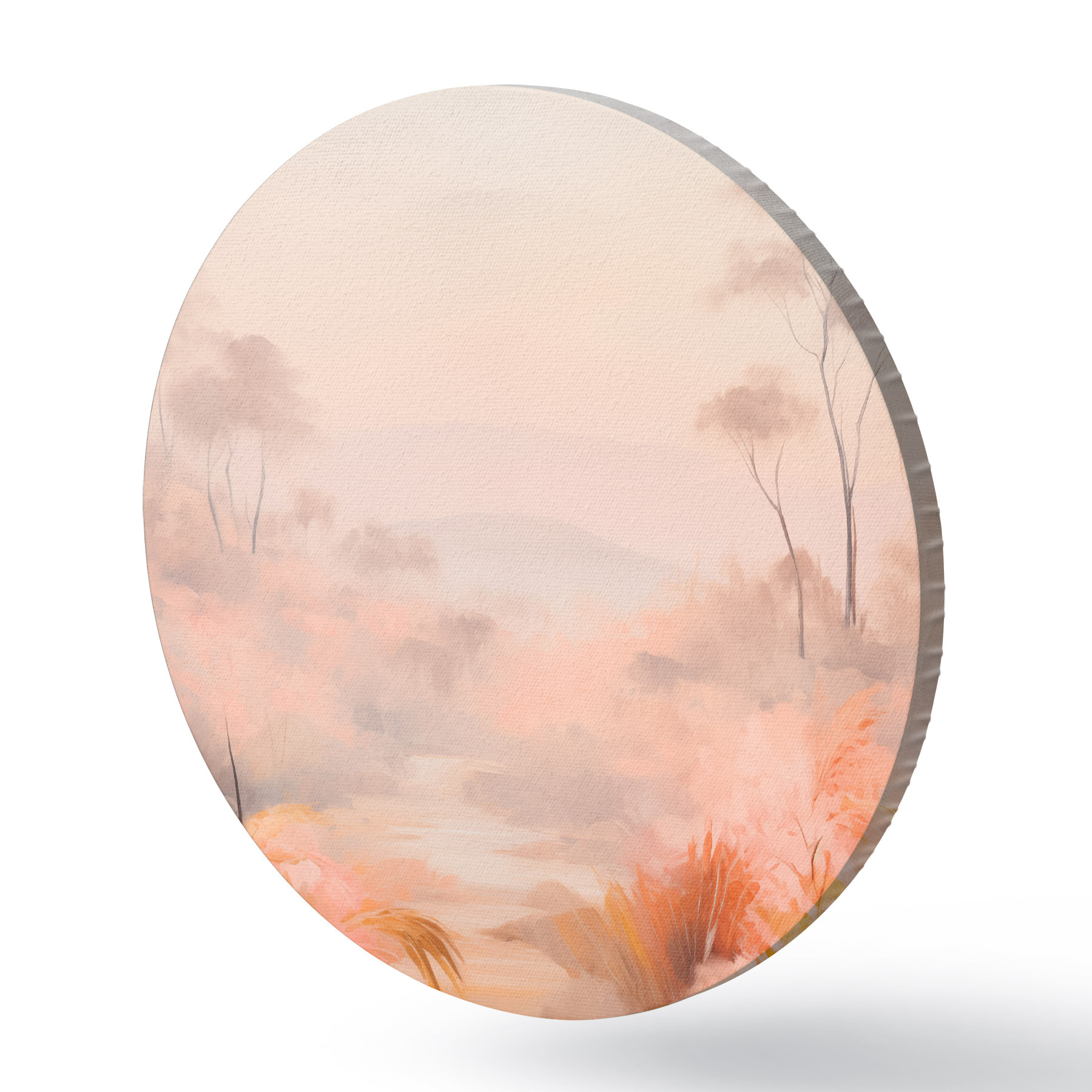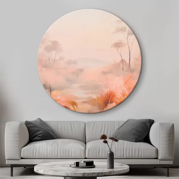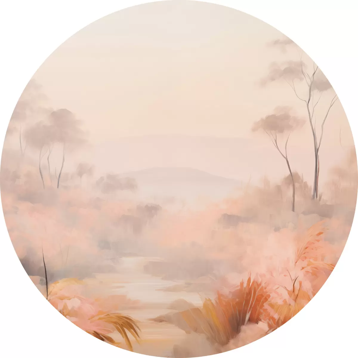 Pilt Maastik roosa , oranži ja pruuni toonides põõsaste ja puudega, taustaks mäed Nr r45553