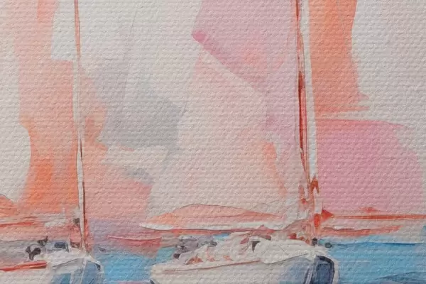 Pilt Roosade purjedega purjekad ujuvad rahulikul merel, paatide peegeldused vees, pehmed pastelsed värvid Nr r45557