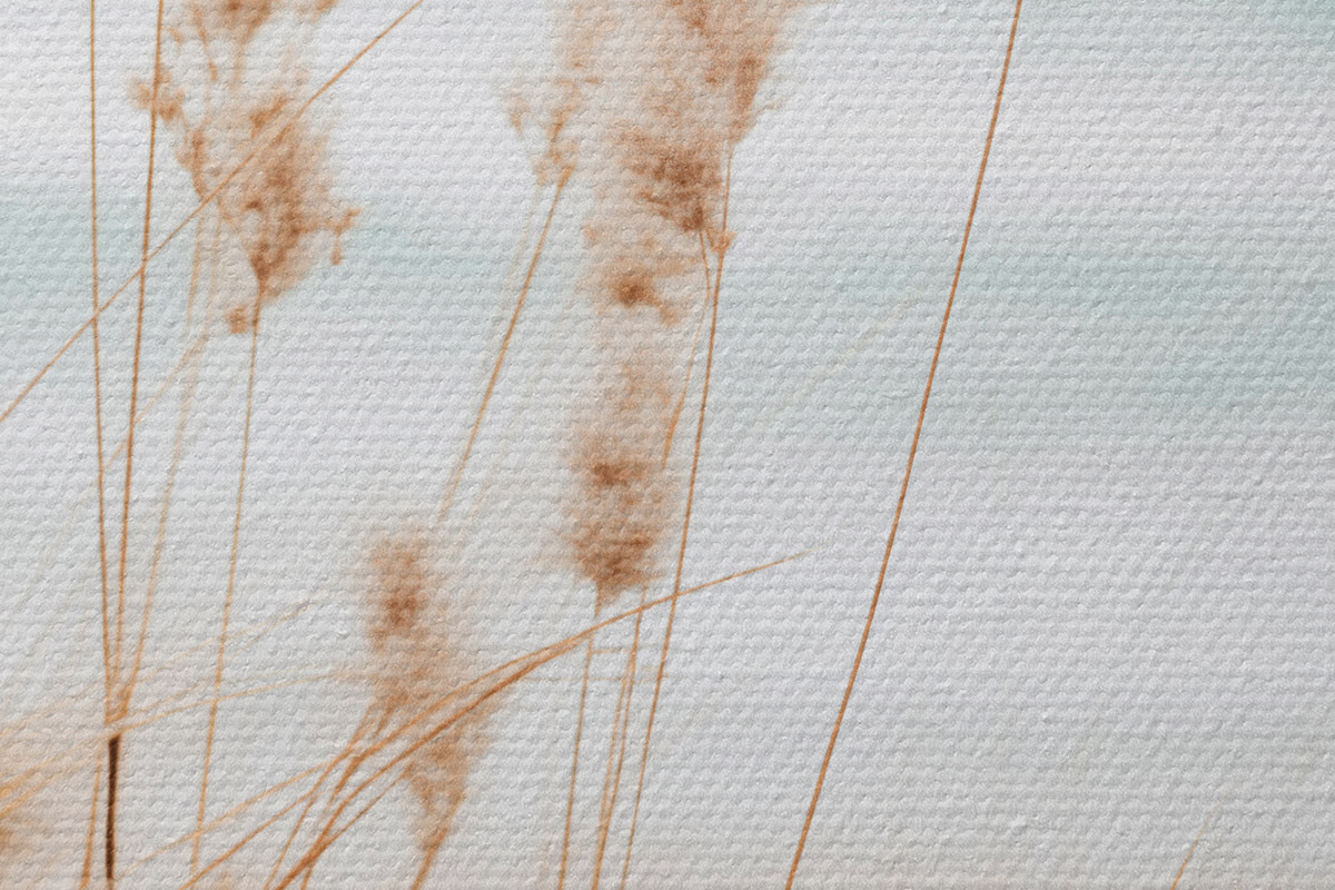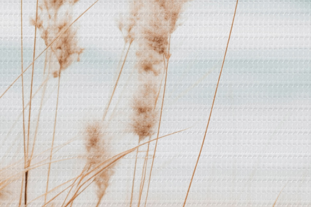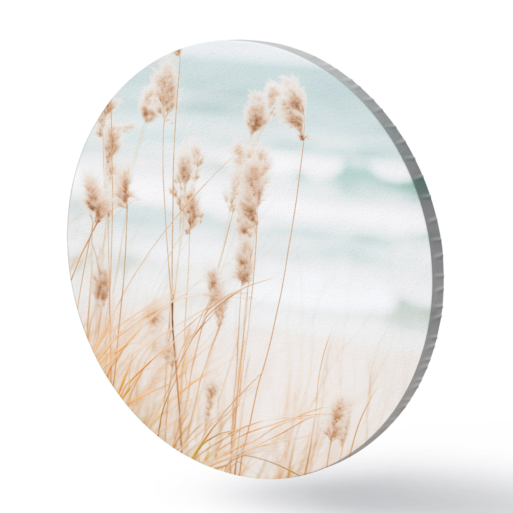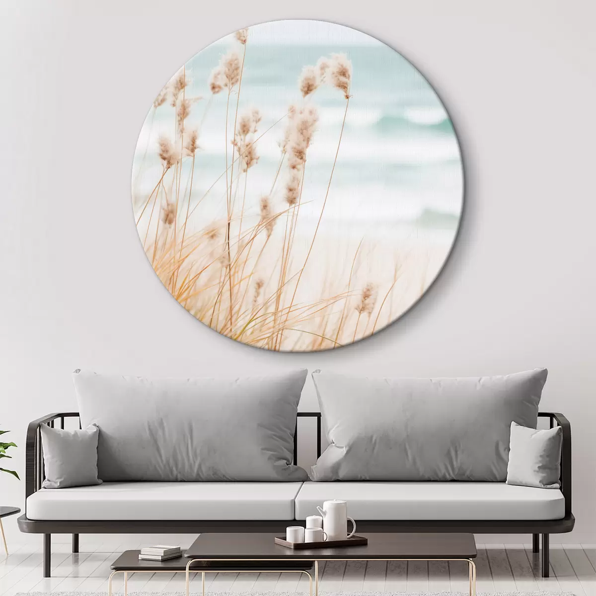 Pilt Kõrge rohi koos kohevate seemnepeadega, liivarand ja ookeanilained taustal, pehme ja vaoshoitud värvipalett Nr r45561