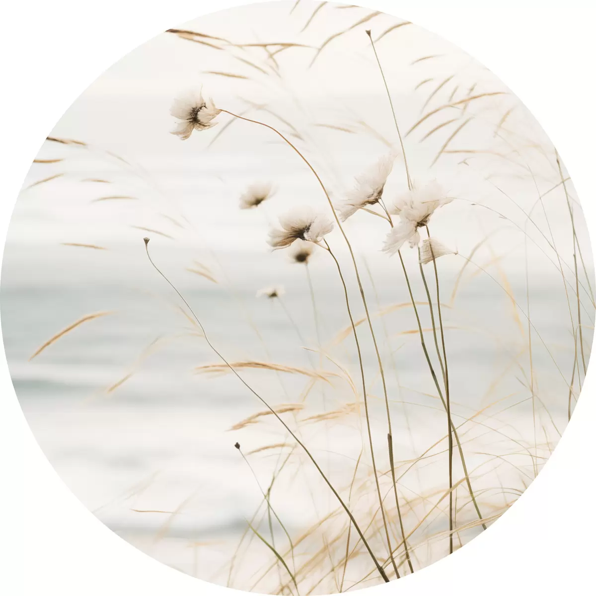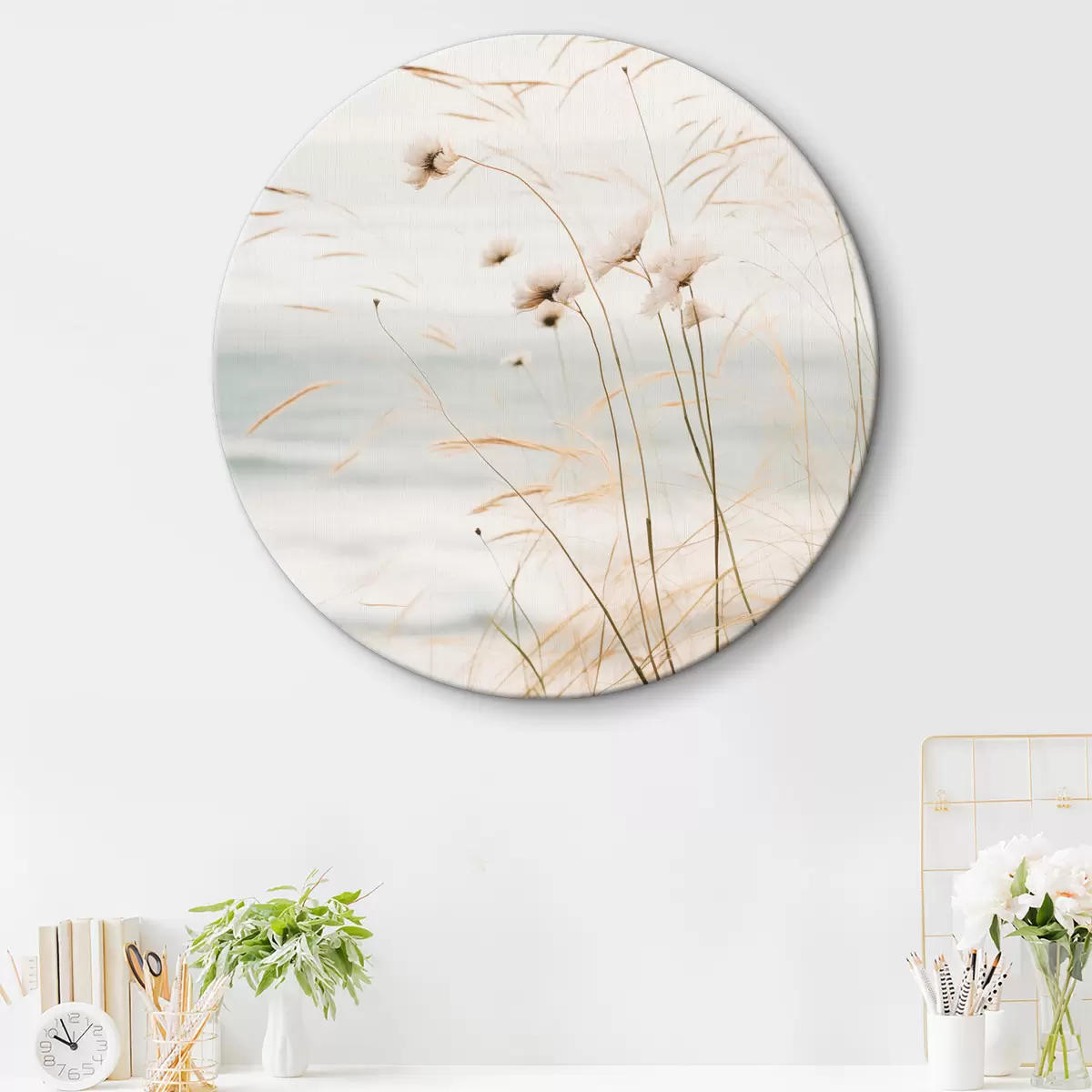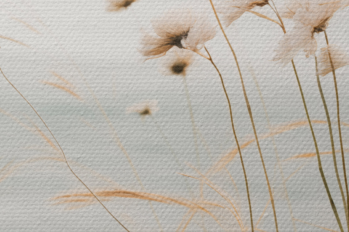 Pilt Natuke puuvillast rohtu ja muud kuiva rohtu ähmase mere ees, pehme ja vaoshoitud värvipalett Nr r45562