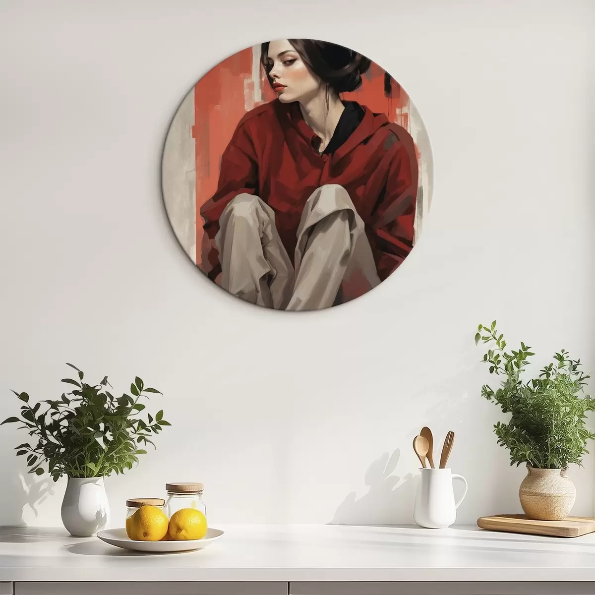Pilt Tüdruk punases mantlis istub kokku pandud jalgadega Nr r45624