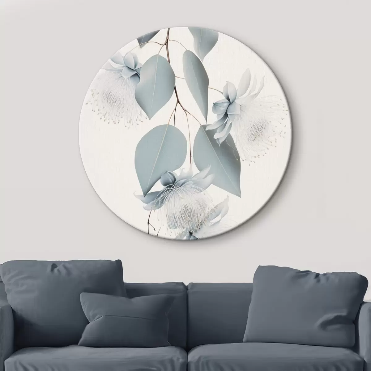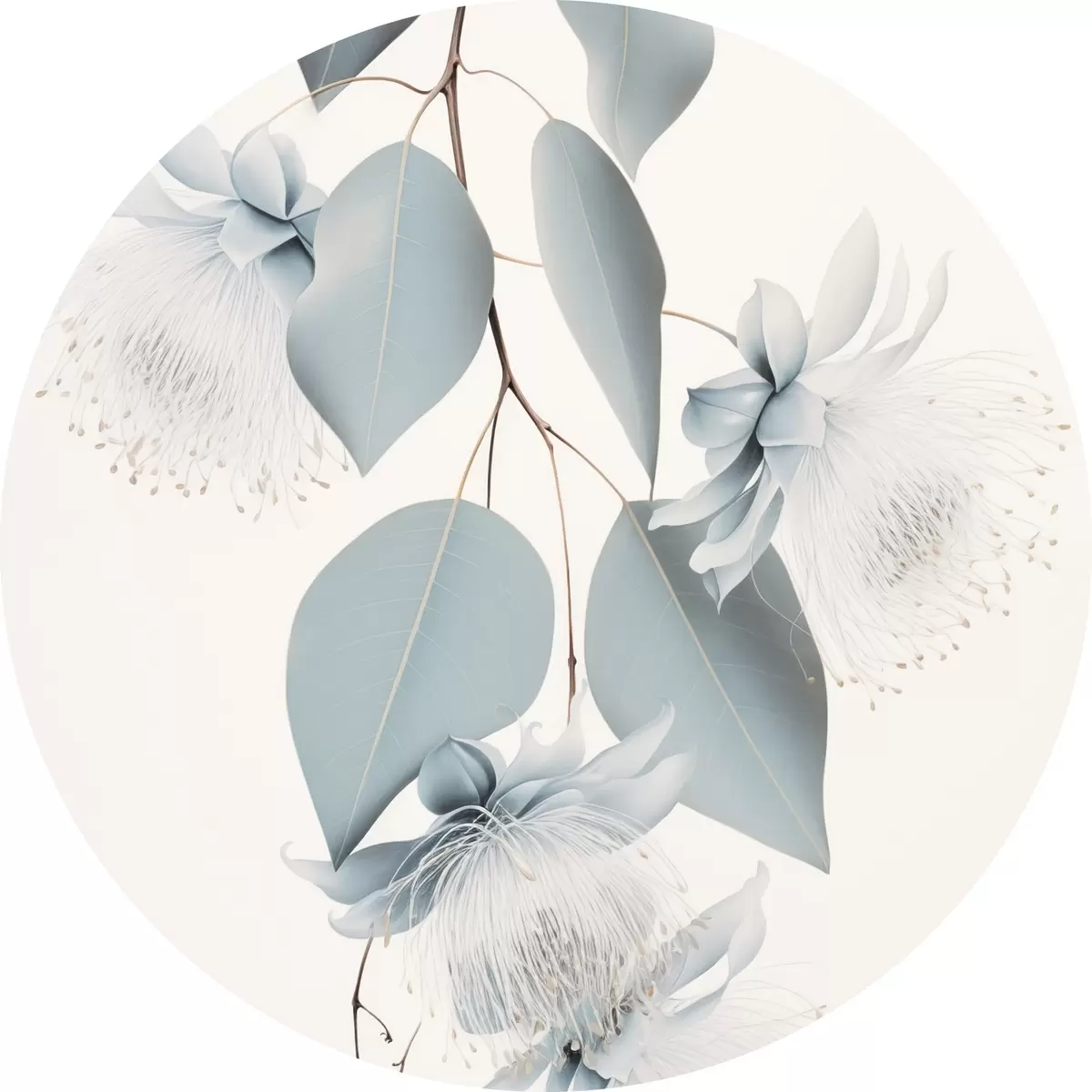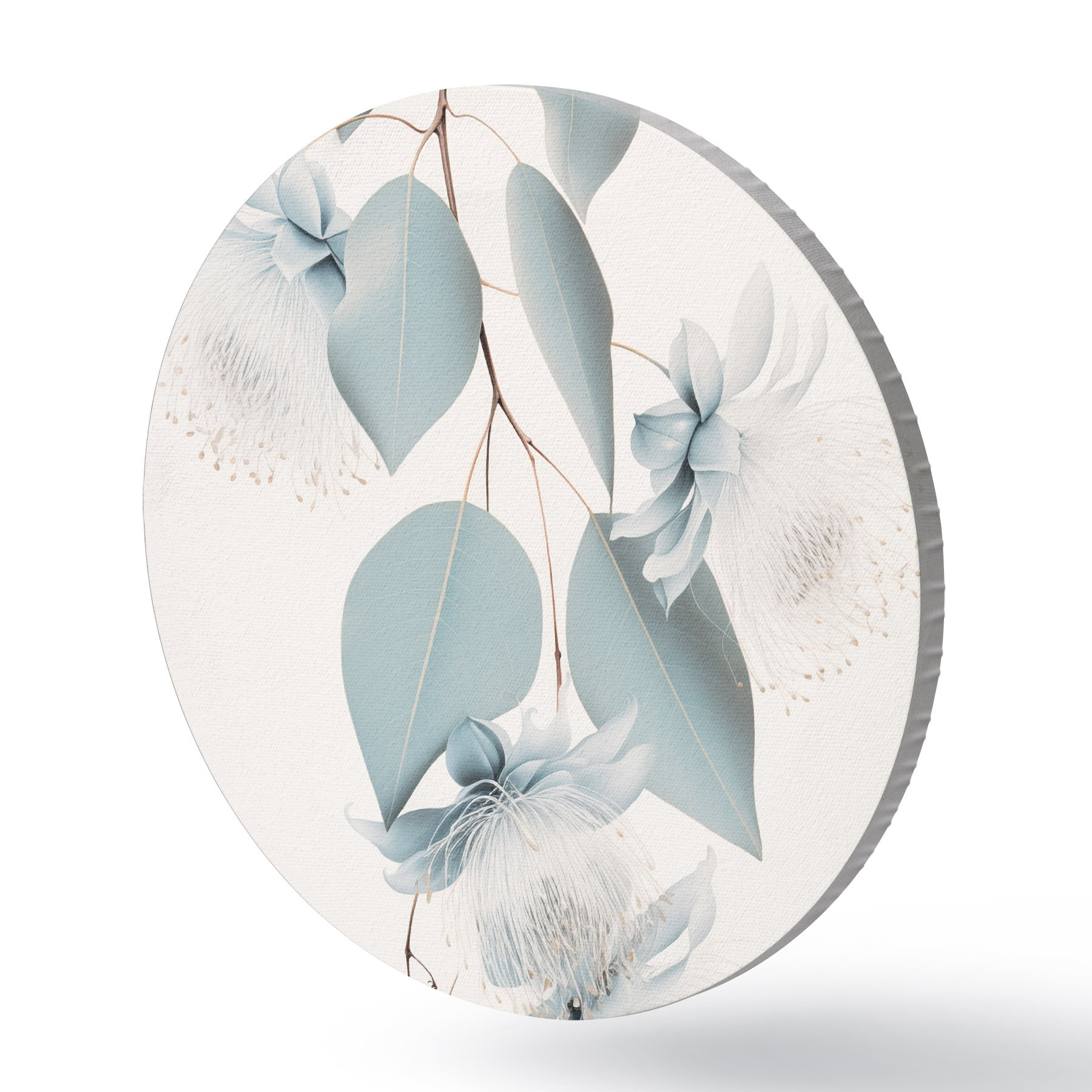 Pilt Eukalüptuse oks siniste lehtede ja valget värvi õitega, hele taust Nr r45947
