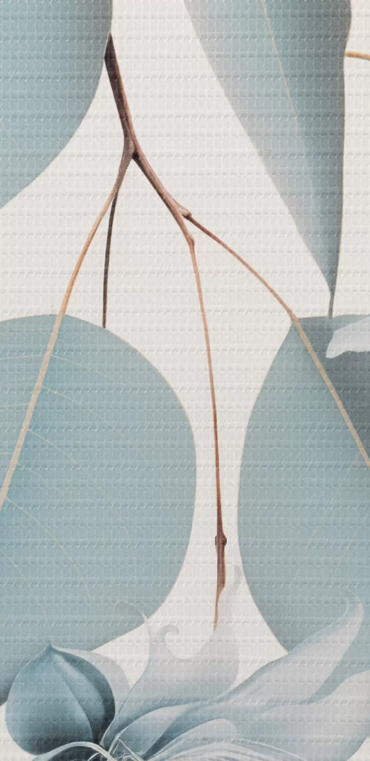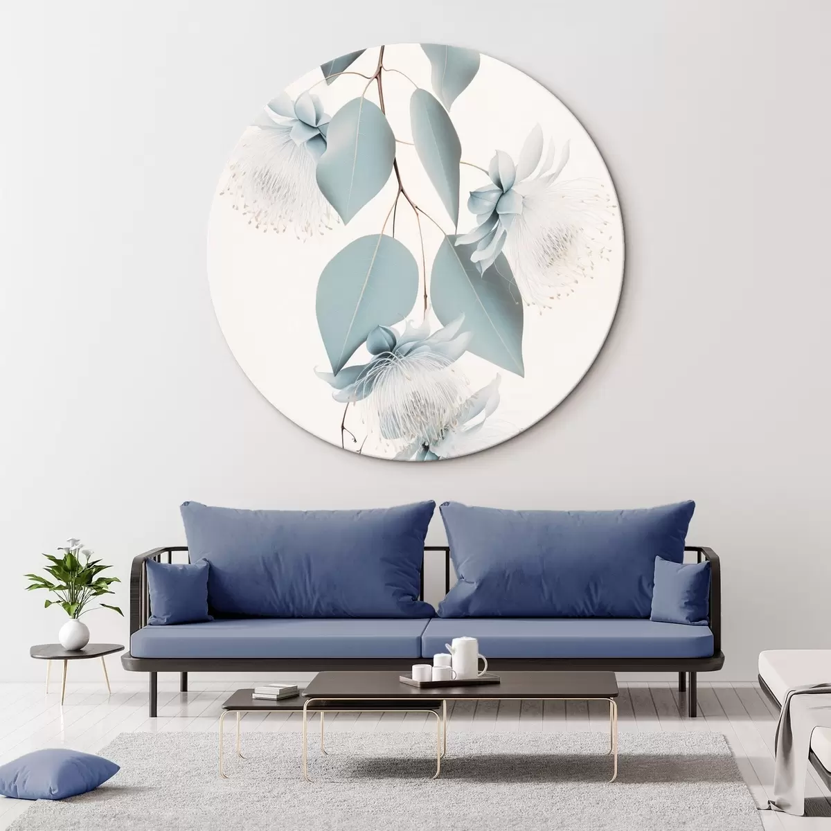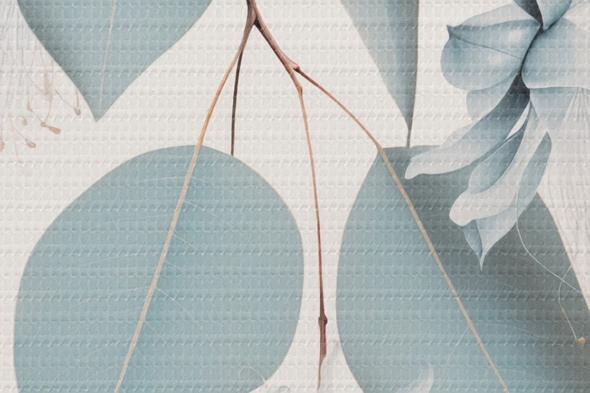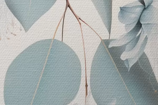 Pilt Eukalüptuse oks siniste lehtede ja valget värvi õitega, hele taust Nr r45947