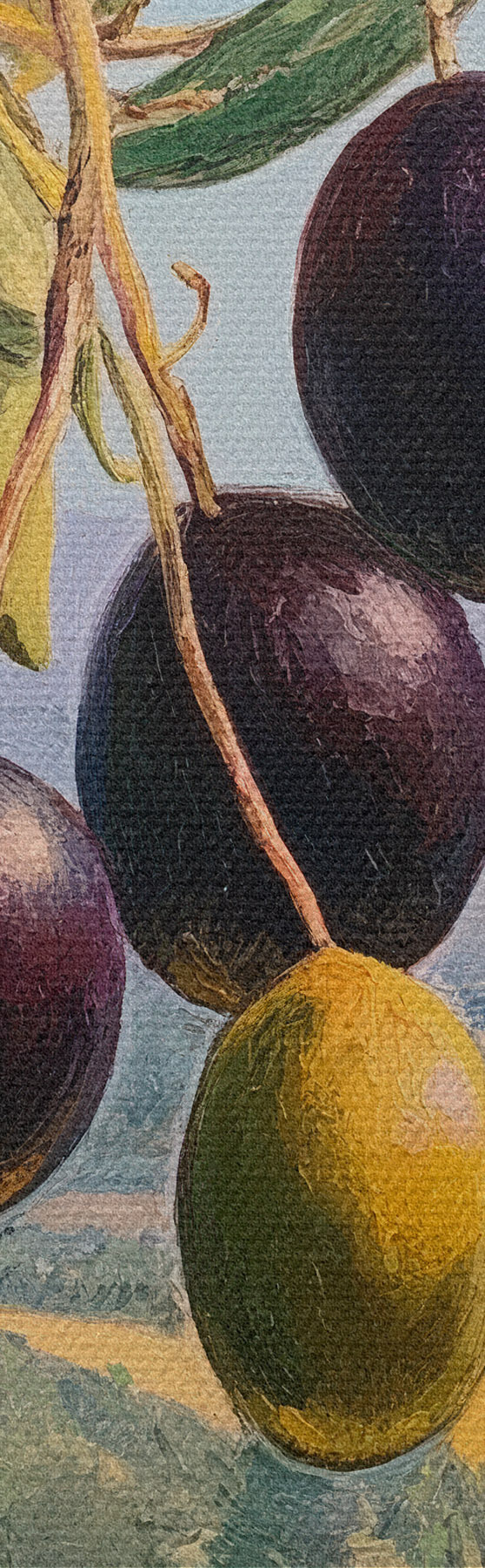 Pilt Oliivipuu oks tumedate viljadega suvise maastiku taustal Nr r46150