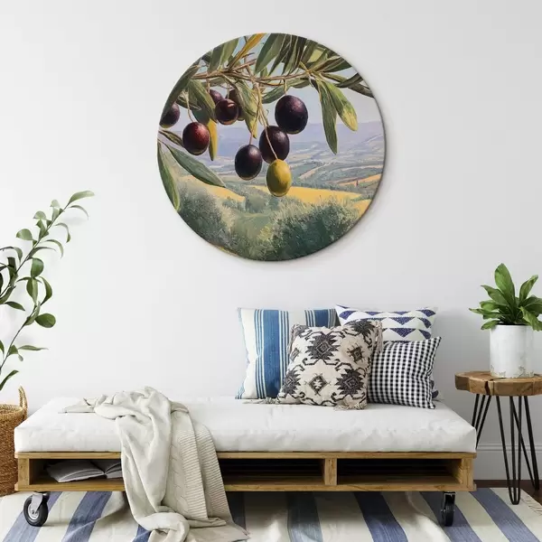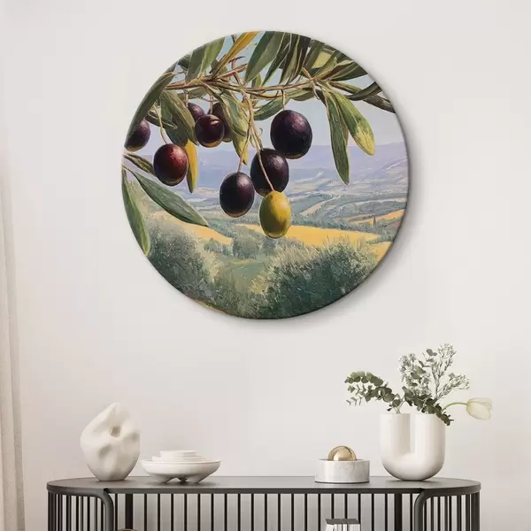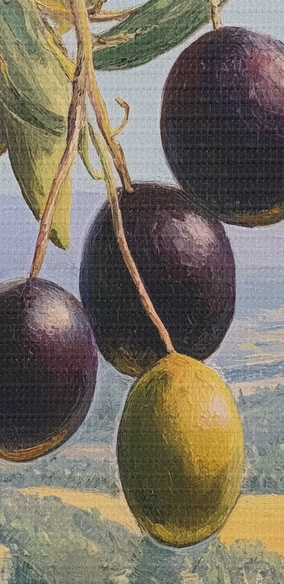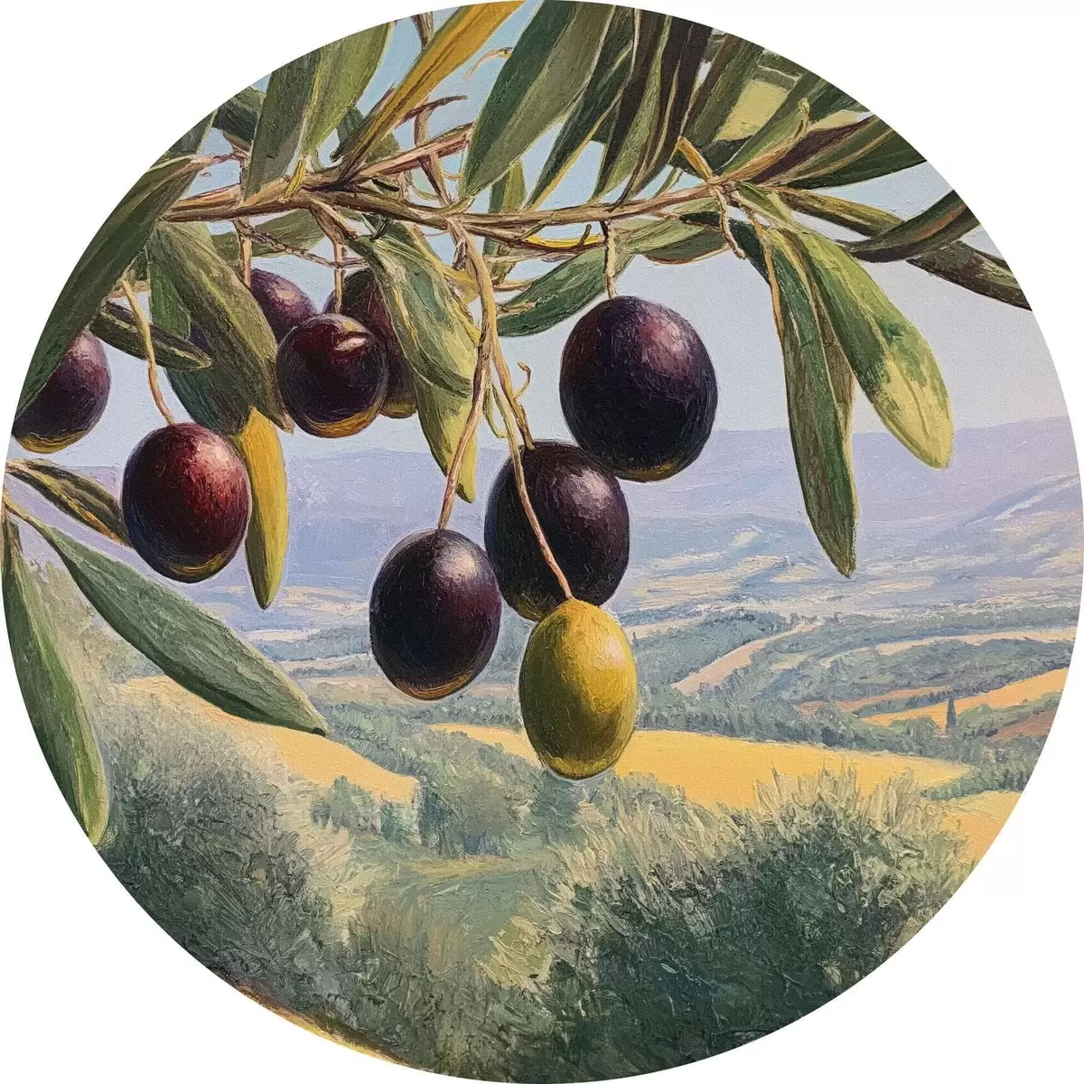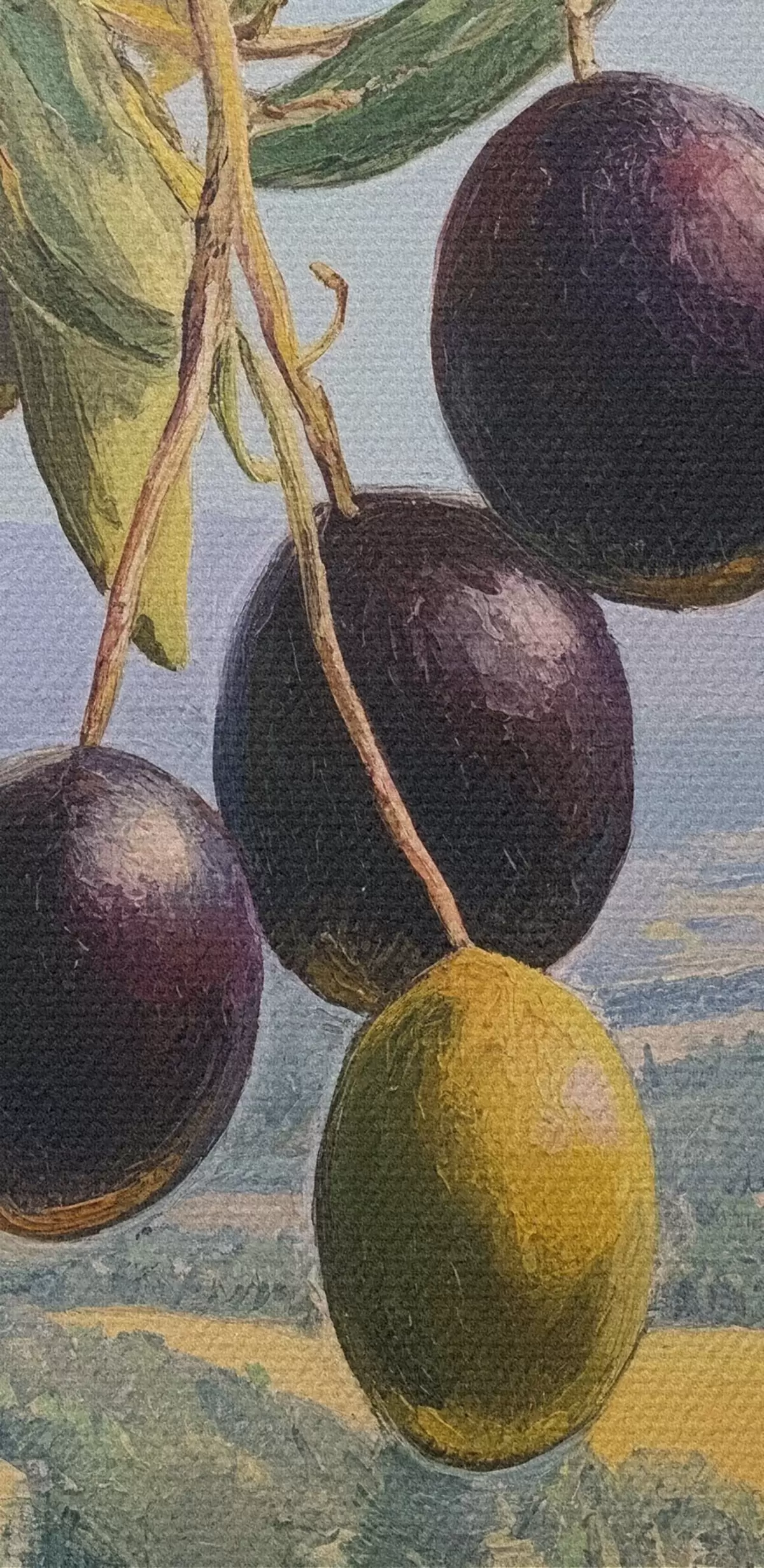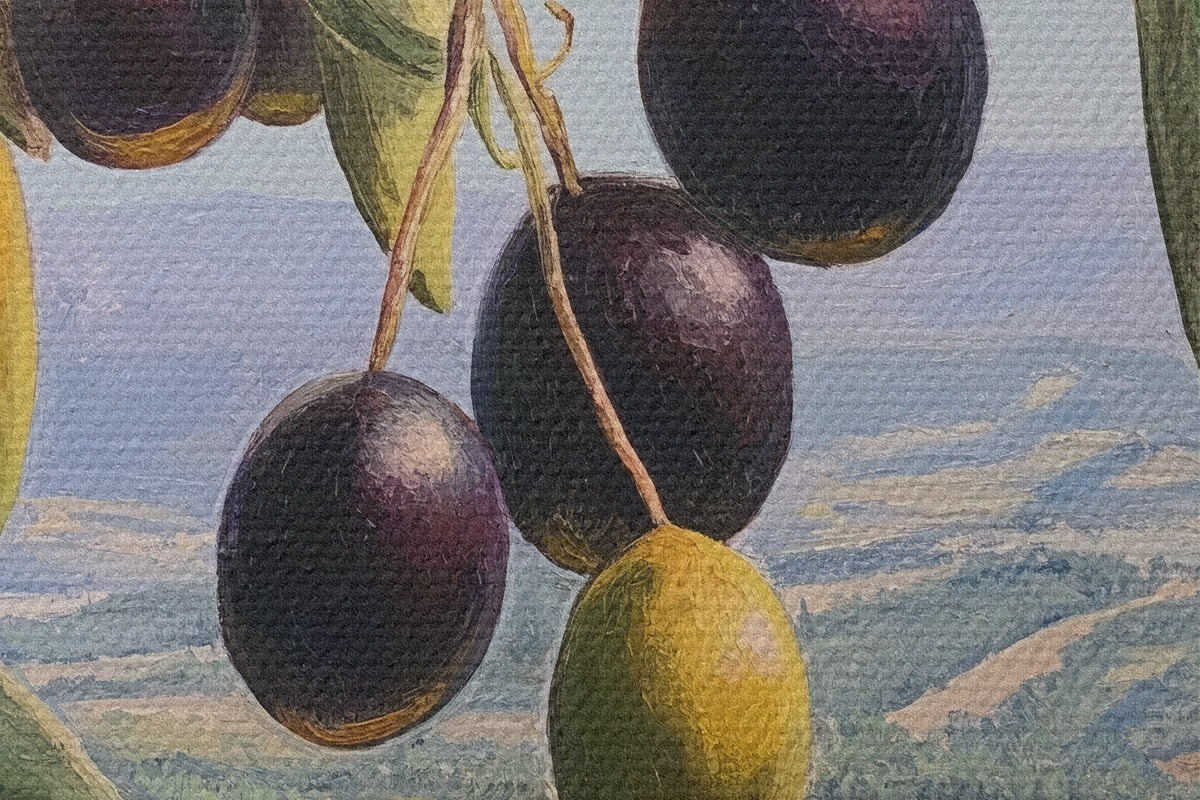 Pilt Oliivipuu oks tumedate viljadega suvise maastiku taustal Nr r46150