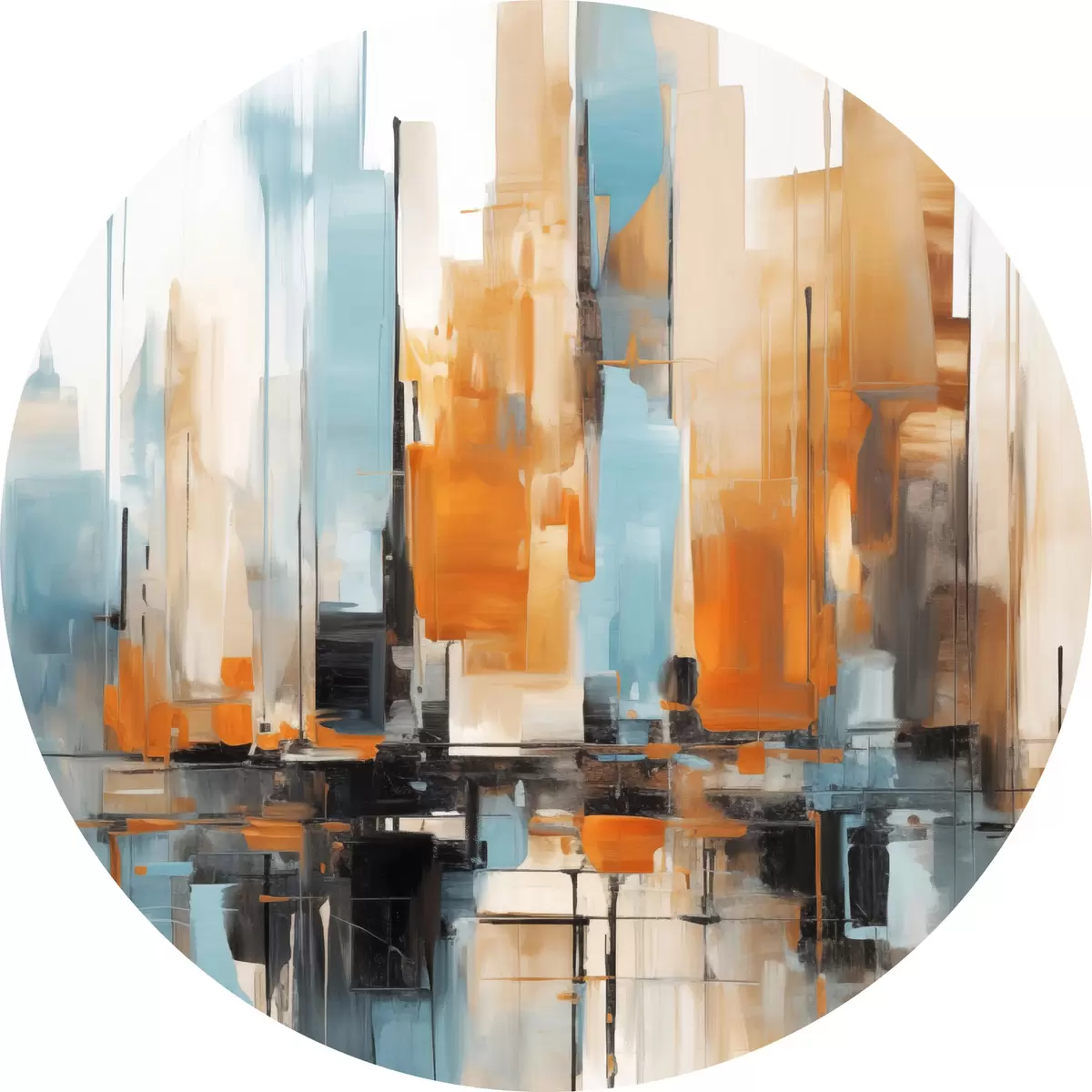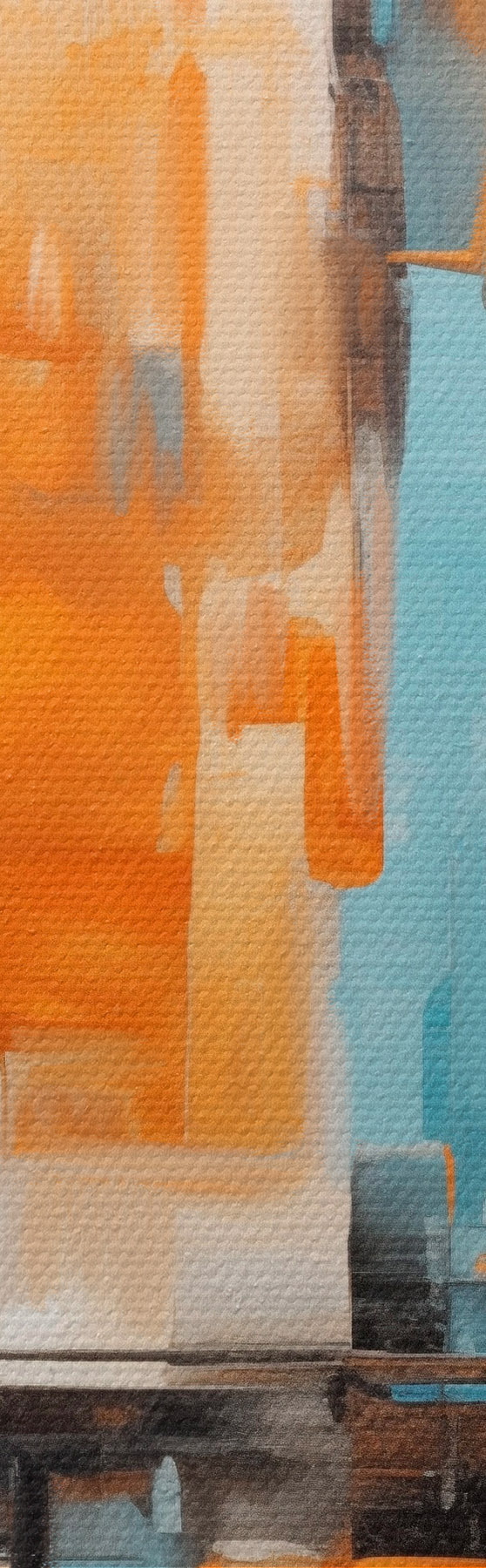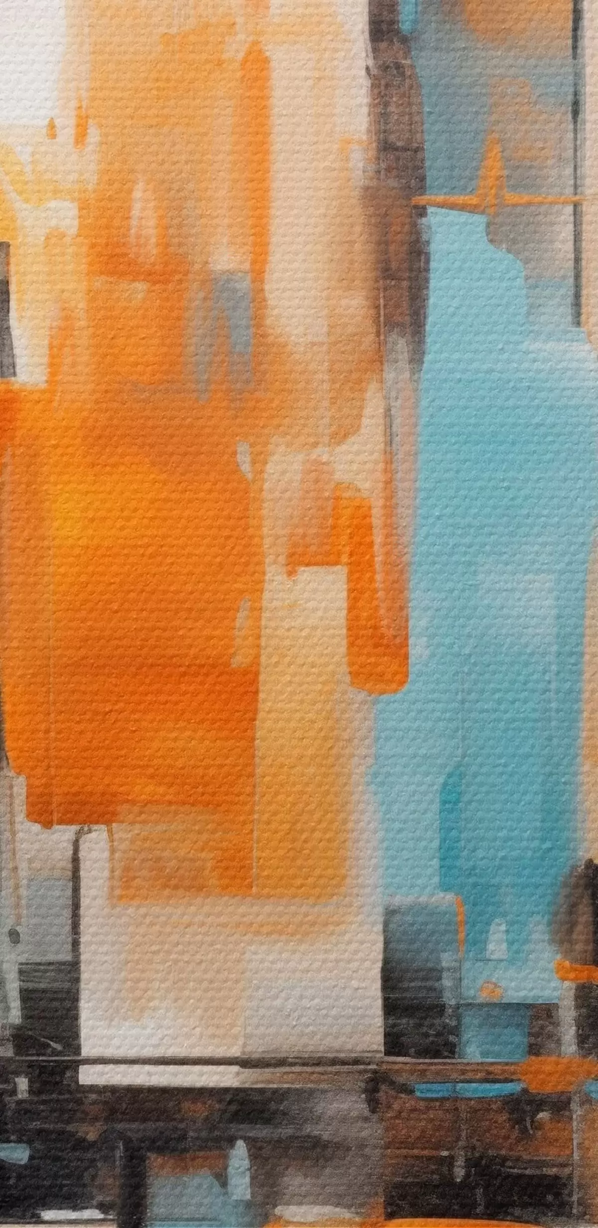 Pilt Abstraktne linnamaastik oranži, sinise ja valge toonides vertikaalsete pintslitõmmetega, maalistiil Nr r46267