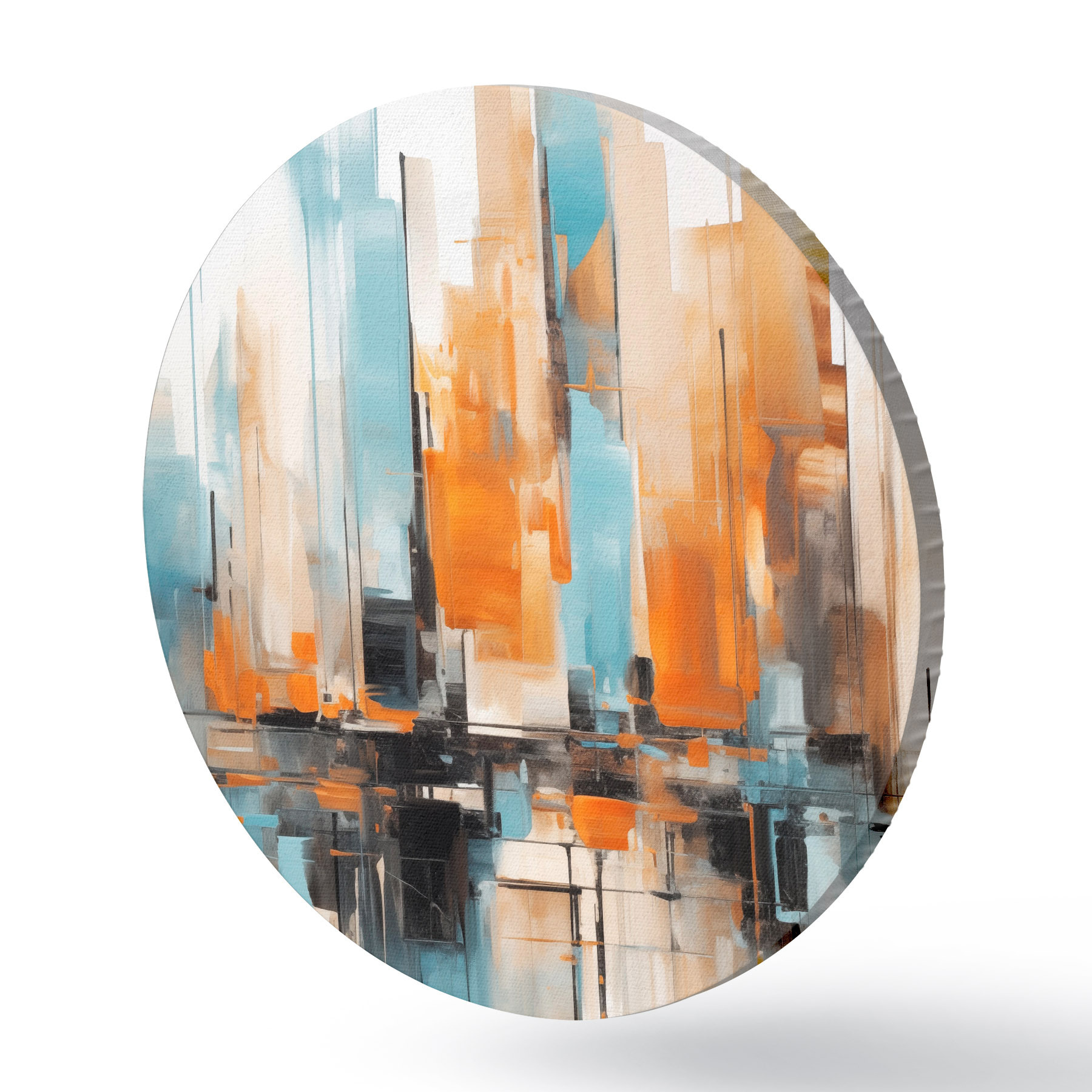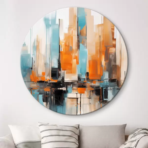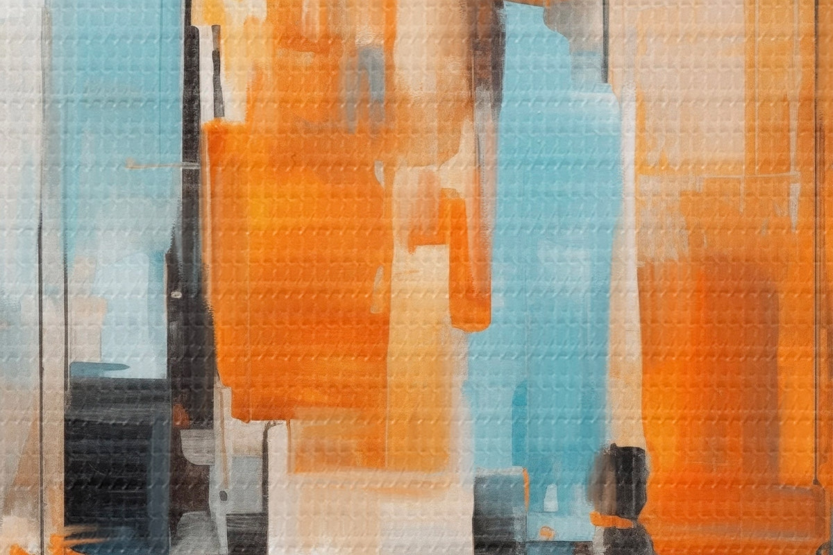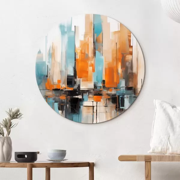 Pilt Abstraktne linnamaastik oranži, sinise ja valge toonides vertikaalsete pintslitõmmetega, maalistiil Nr r46267