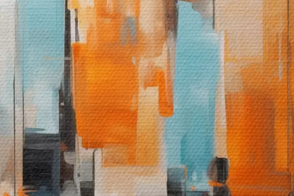 Pilt Abstraktne linnamaastik oranži, sinise ja valge toonides vertikaalsete pintslitõmmetega, maalistiil Nr r46267