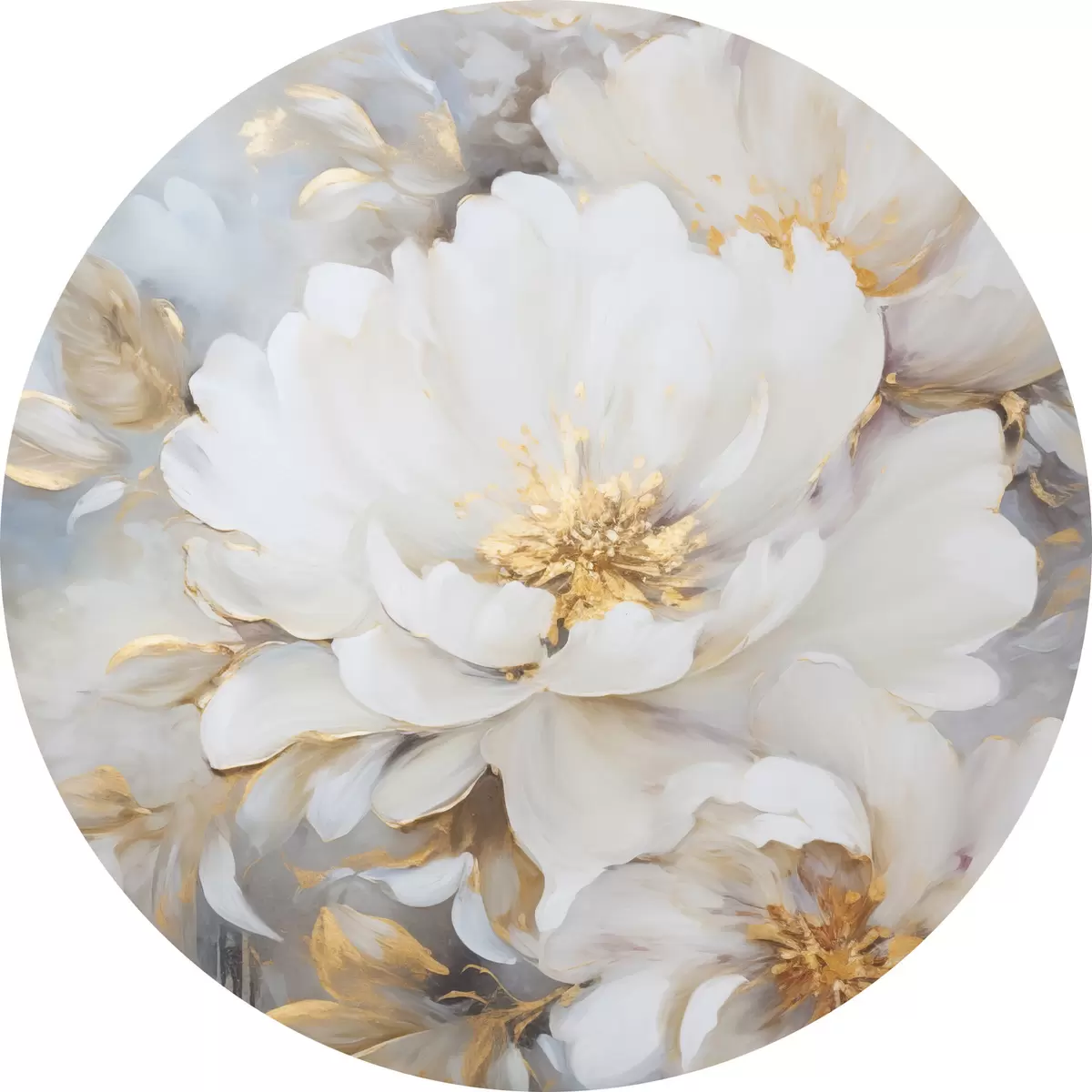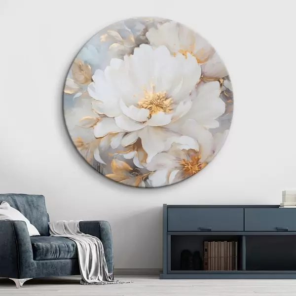 Pilt Valged pioonid sinise südamikuga ja lehtedega, pehmed pintslitõmbed, helesinine taust, lillekompositsioon Nr r46271