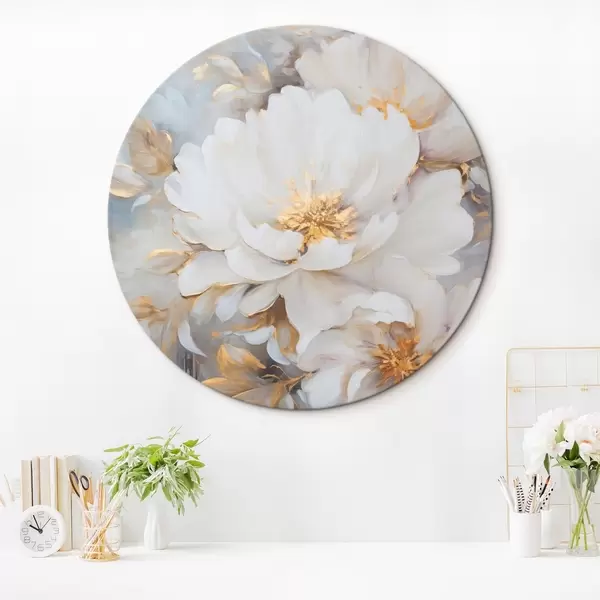 Pilt Valged pioonid sinise südamikuga ja lehtedega, pehmed pintslitõmbed, helesinine taust, lillekompositsioon Nr r46271