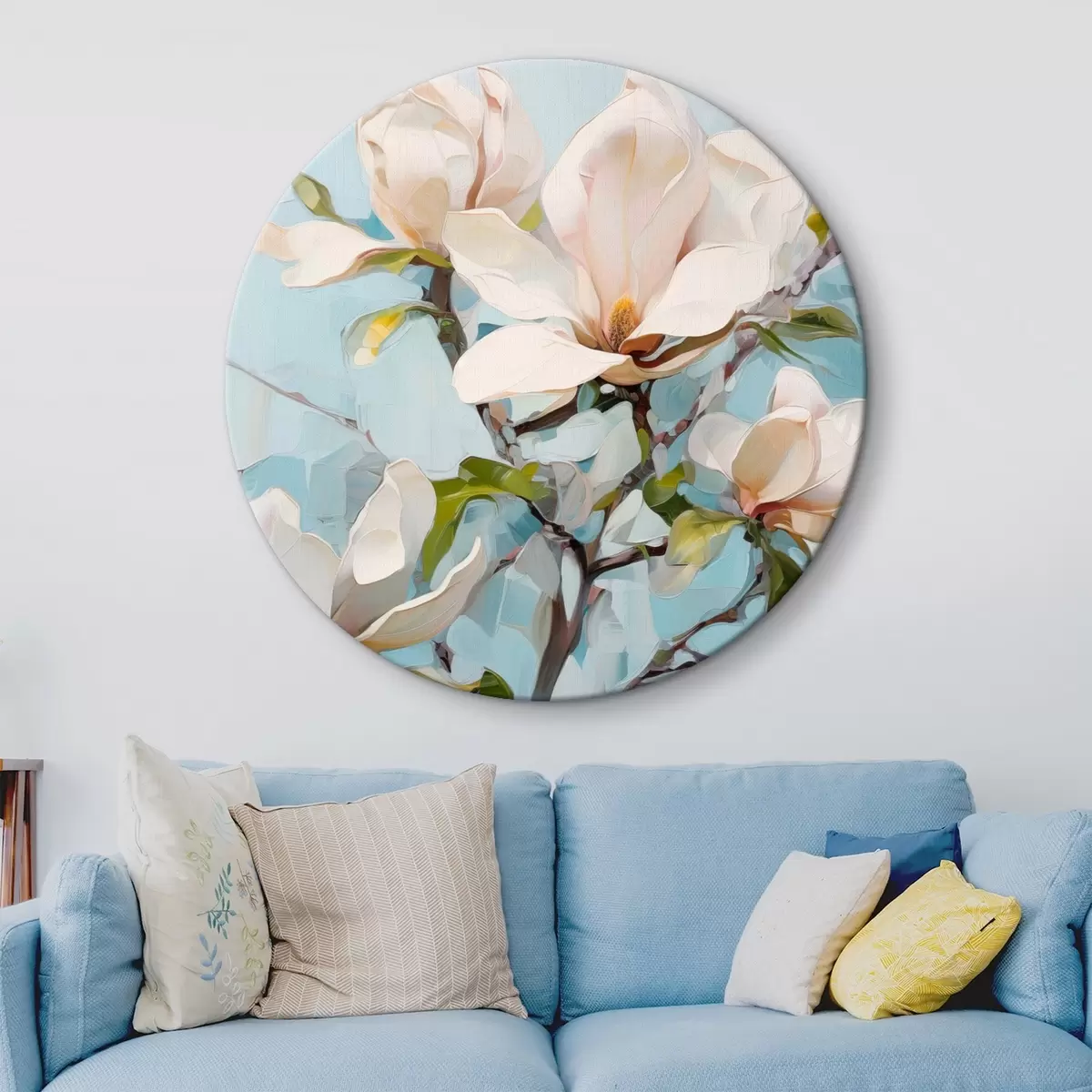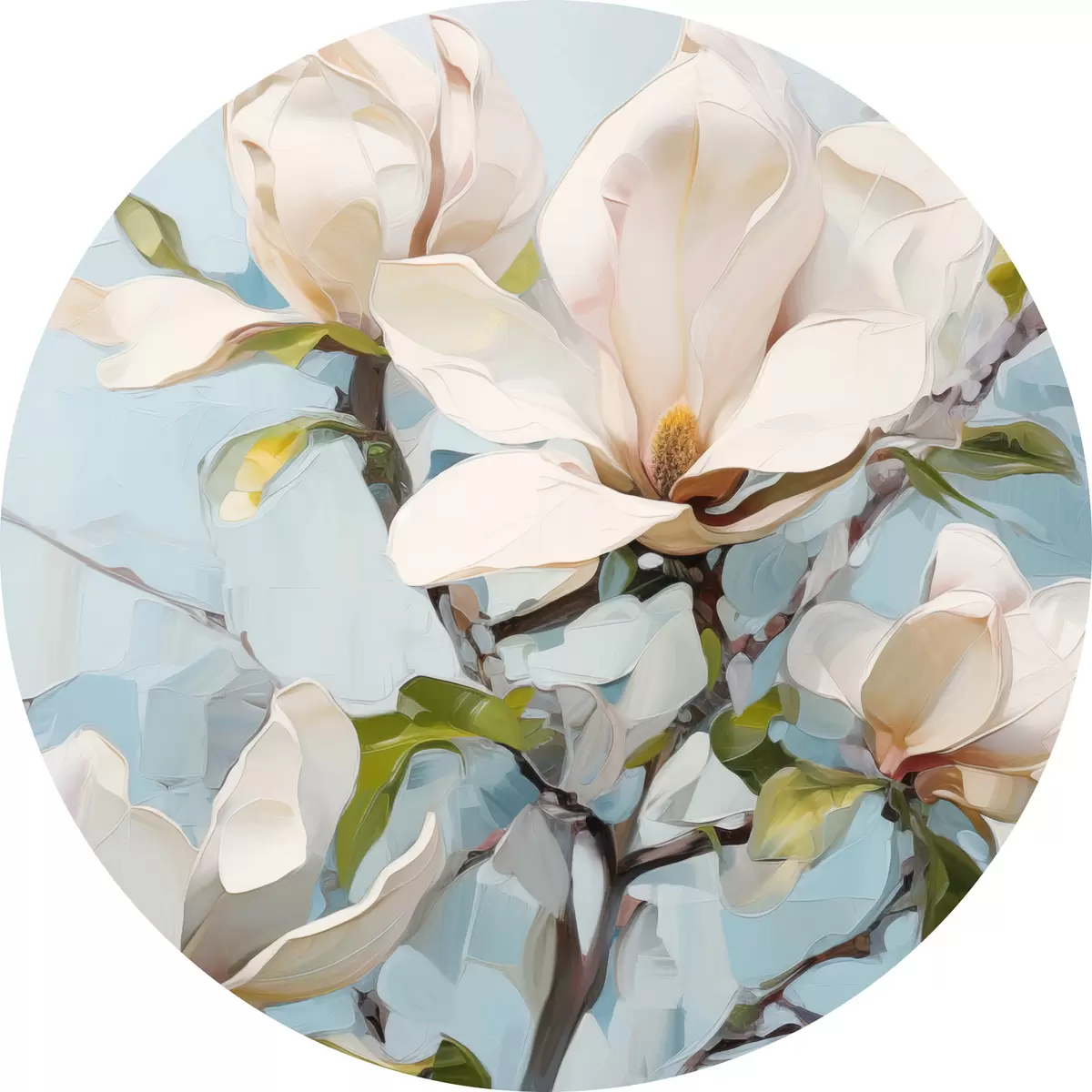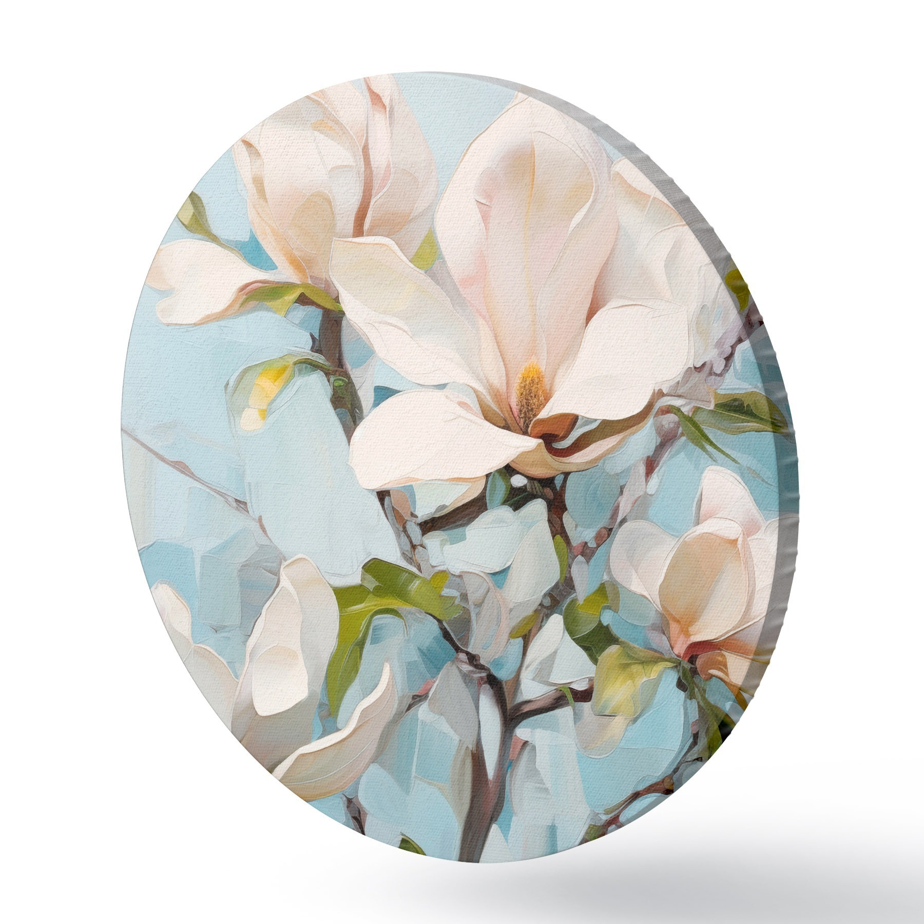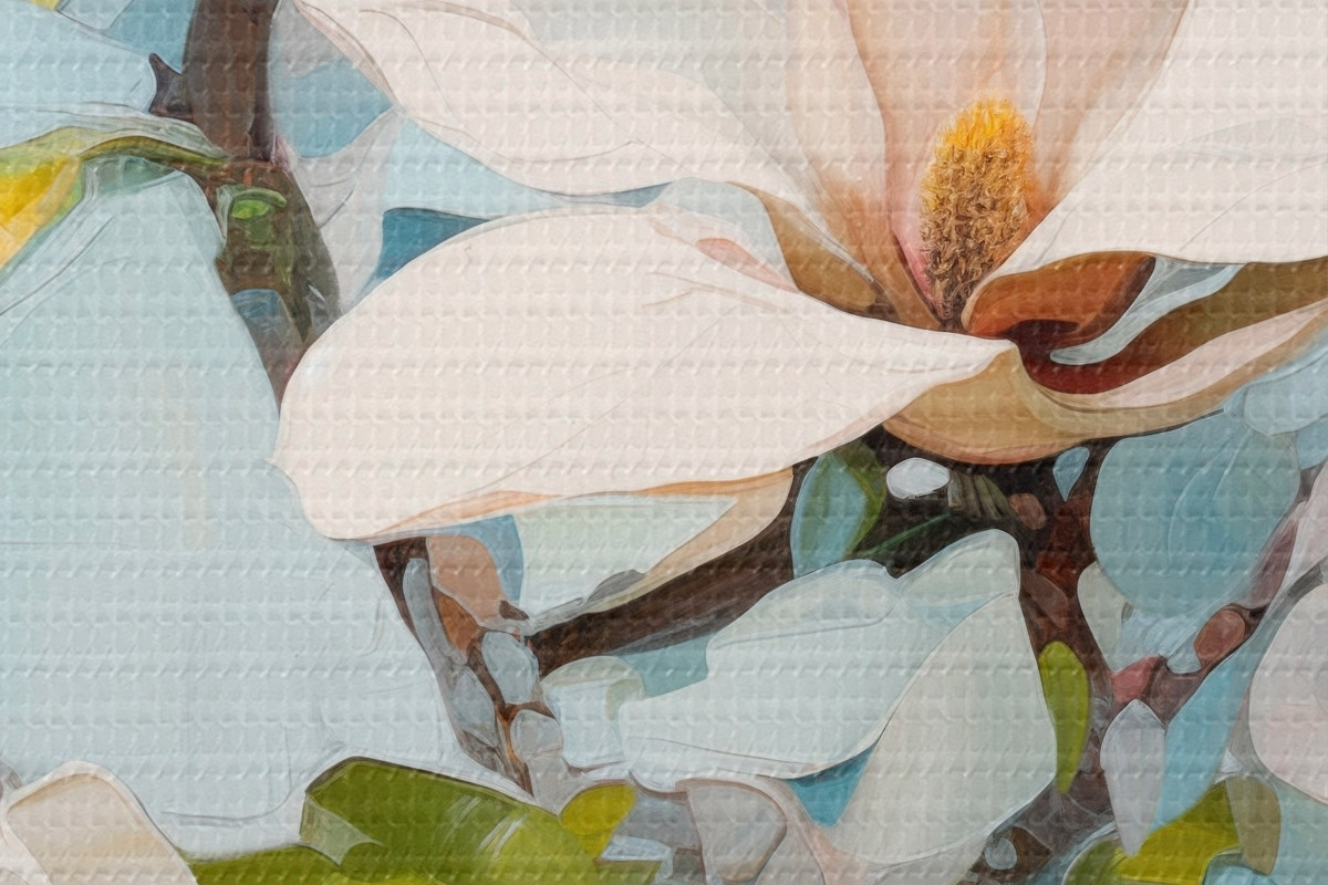 Pilt Valged magnoliaõied, helesinine taust pehme pintslitõmbega, õlimaalistiilis, impasto tekstuuriga Nr r46277