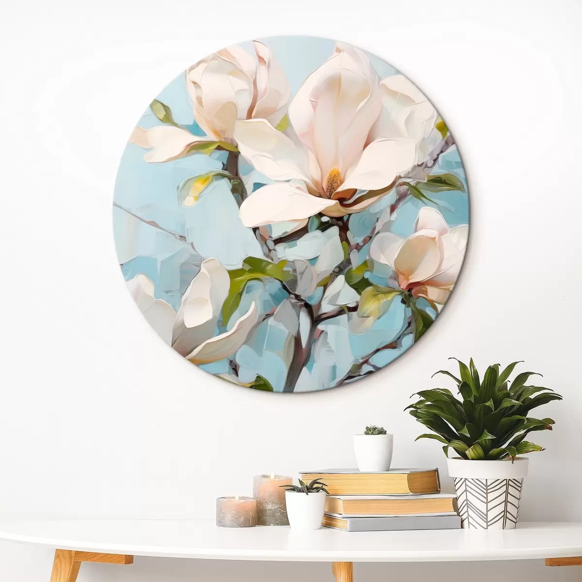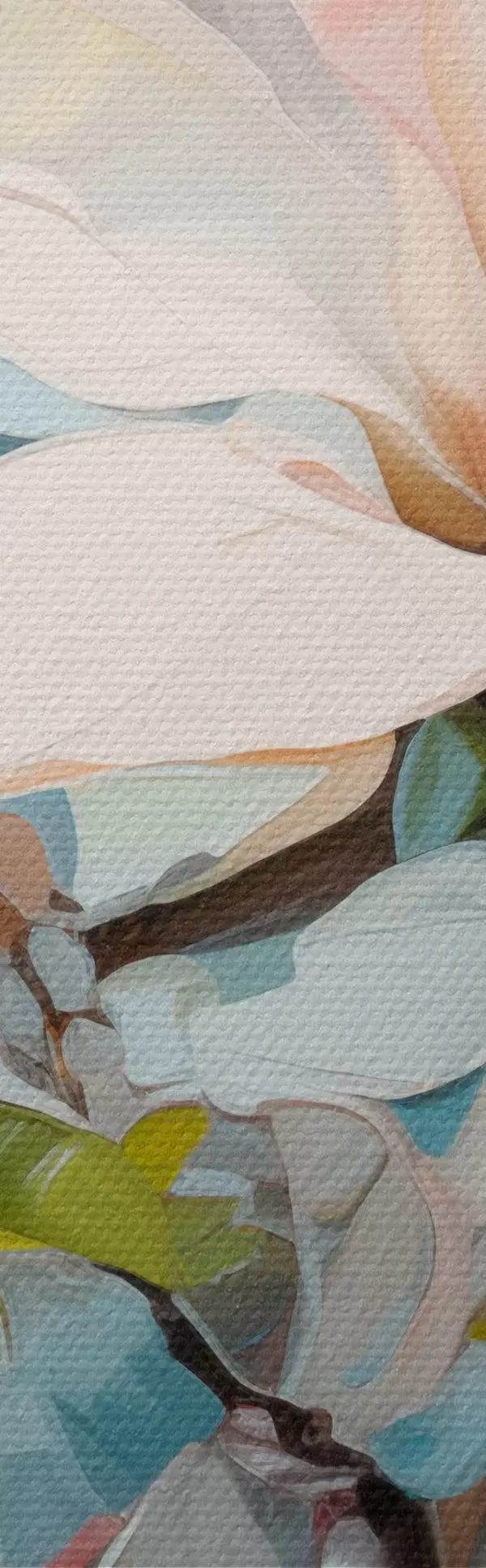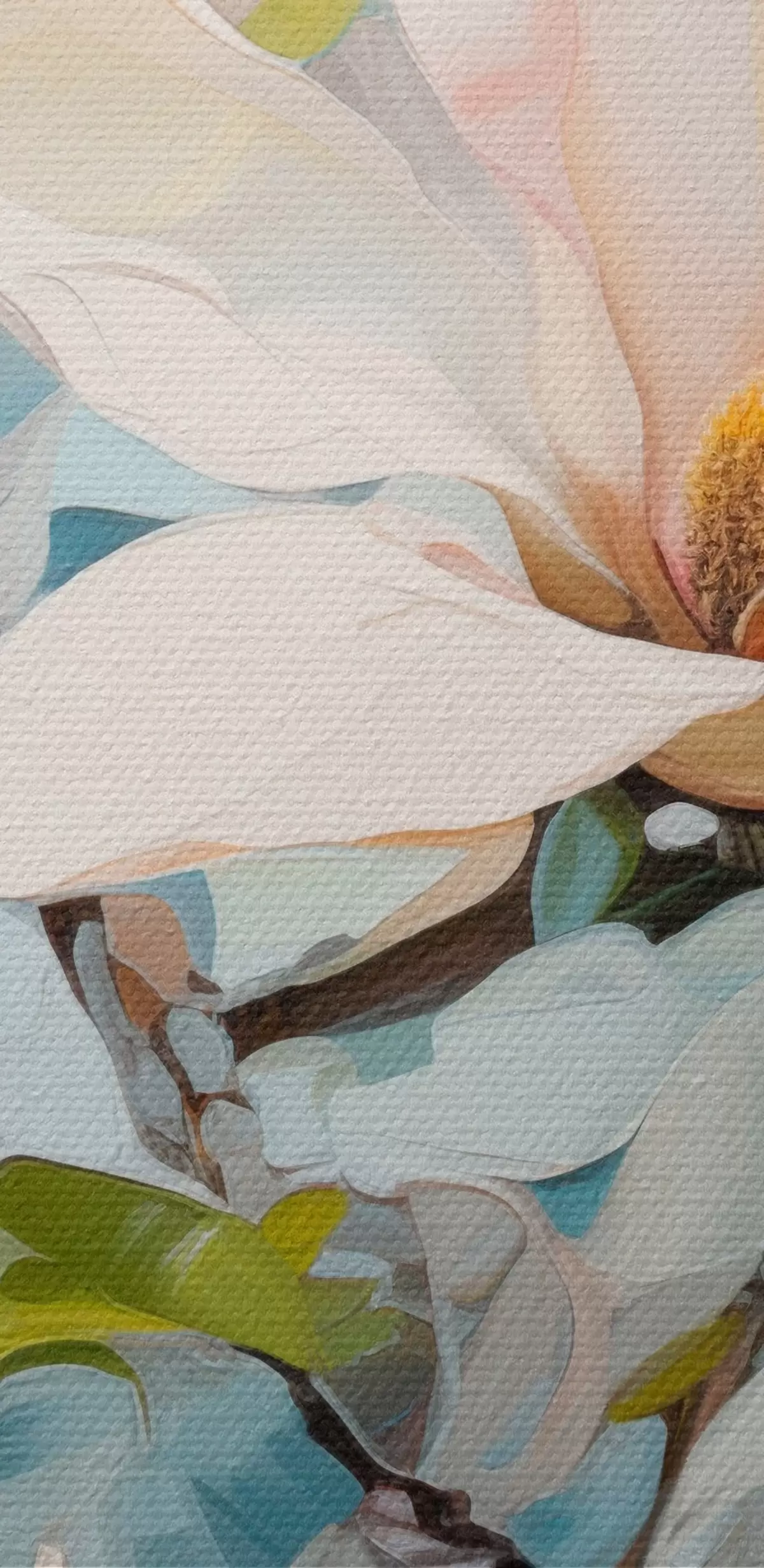 Pilt Valged magnoliaõied, helesinine taust pehme pintslitõmbega, õlimaalistiilis, impasto tekstuuriga Nr r46277