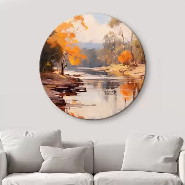 Pilt Sügisene maastik, jõgi puudega kaldal, mets taustal, peegeldused veepinnal Nr r46280