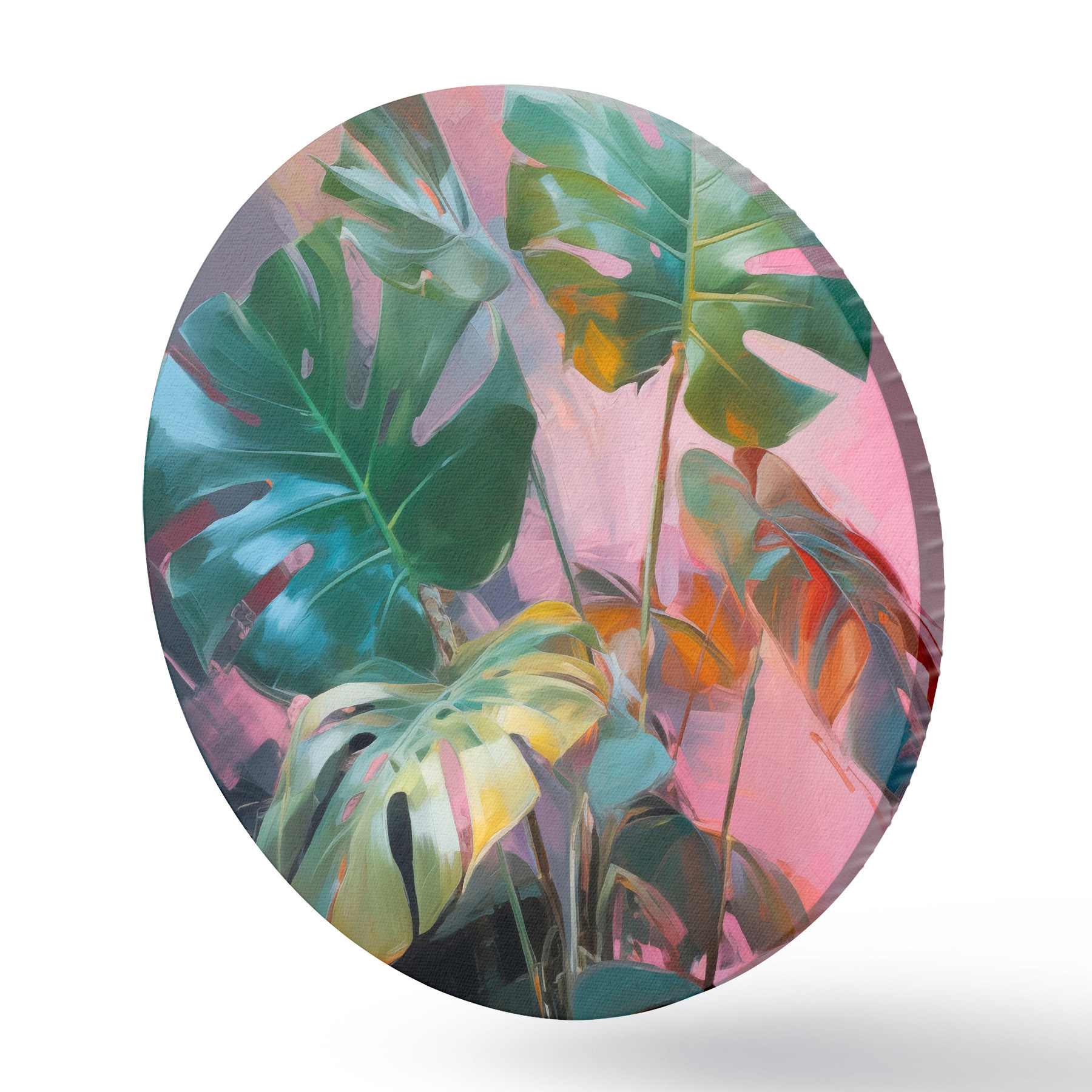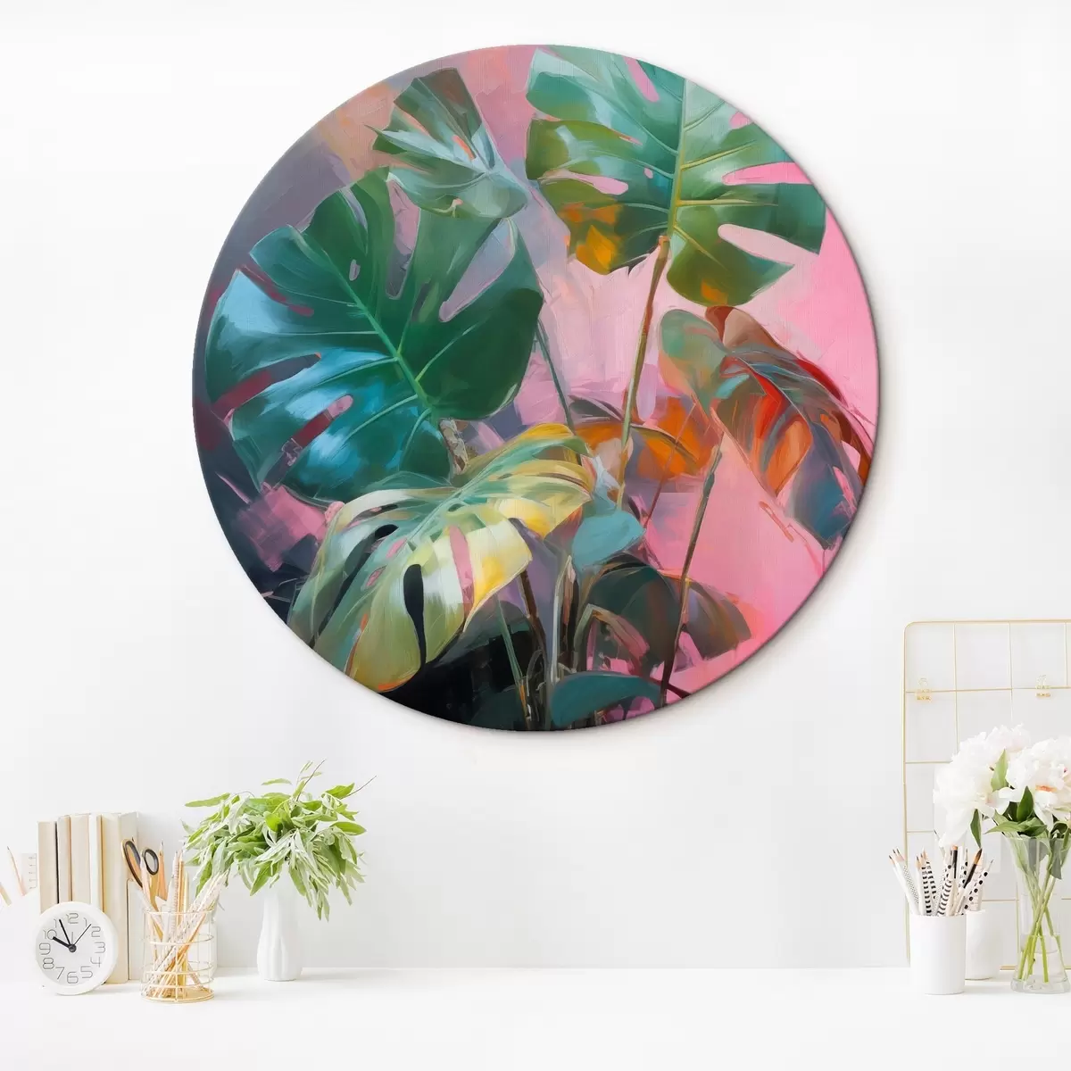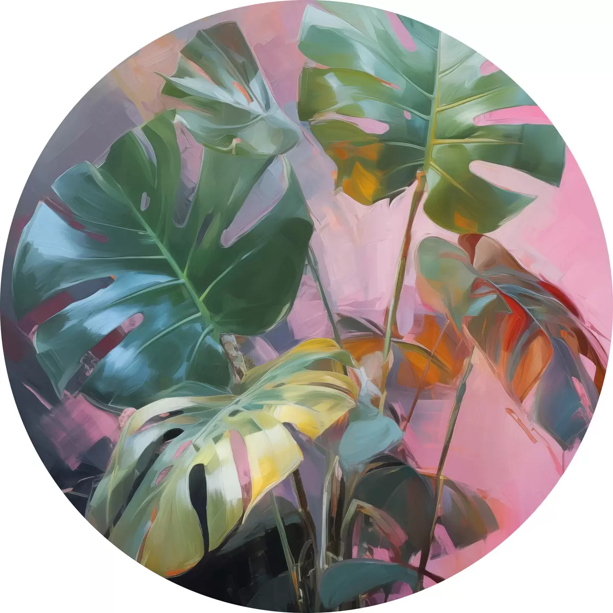 Pilt Abstraktne monstera taim erksate roheliste lehtedega, pehme roosa ja lilla toonide taustal Nr r46286