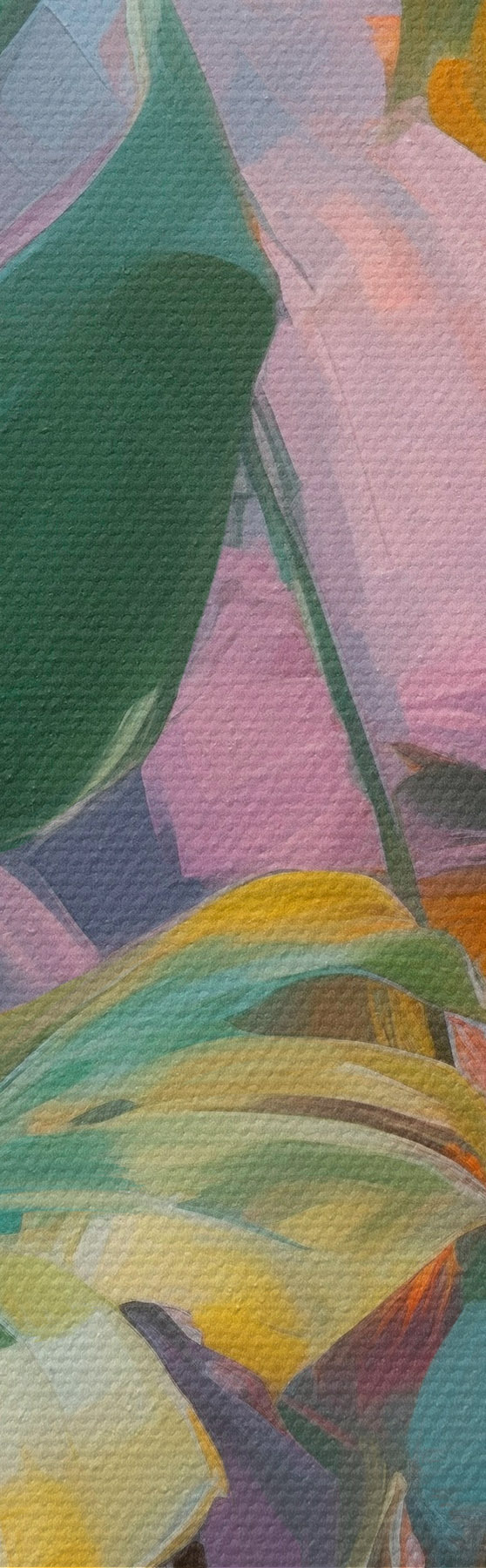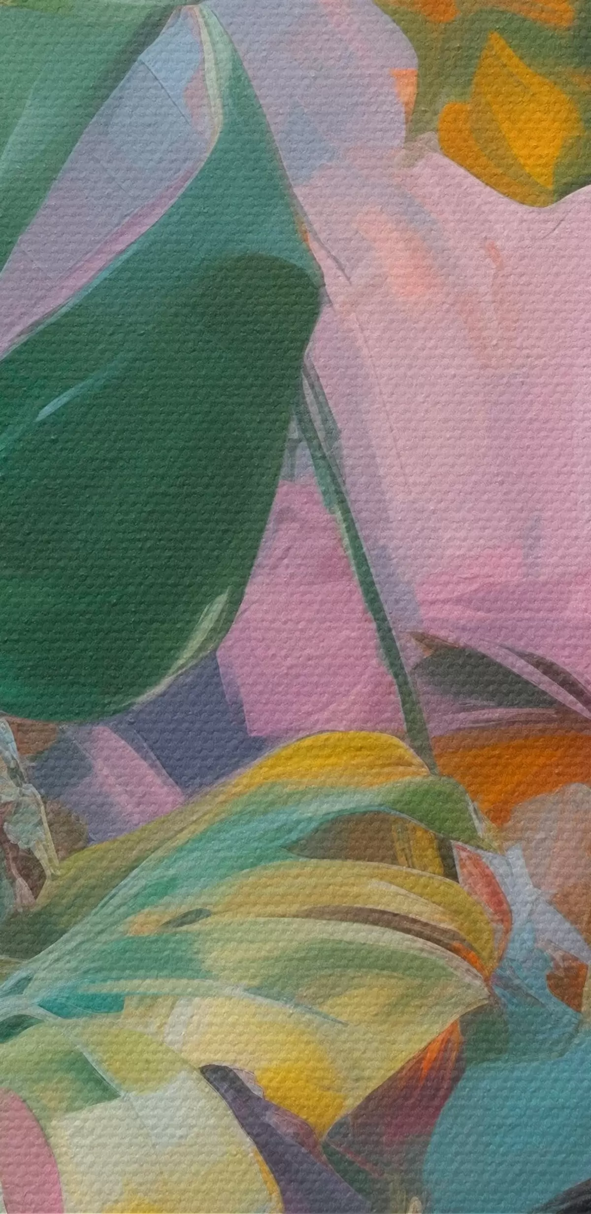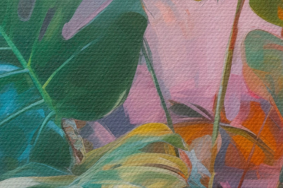 Pilt Abstraktne monstera taim erksate roheliste lehtedega, pehme roosa ja lilla toonide taustal Nr r46286