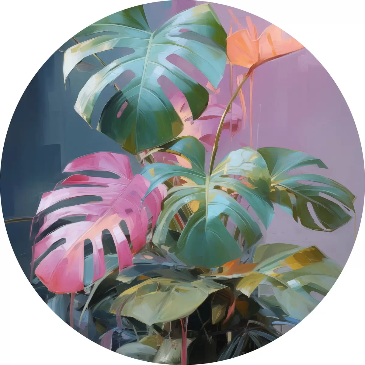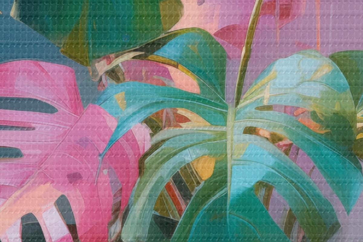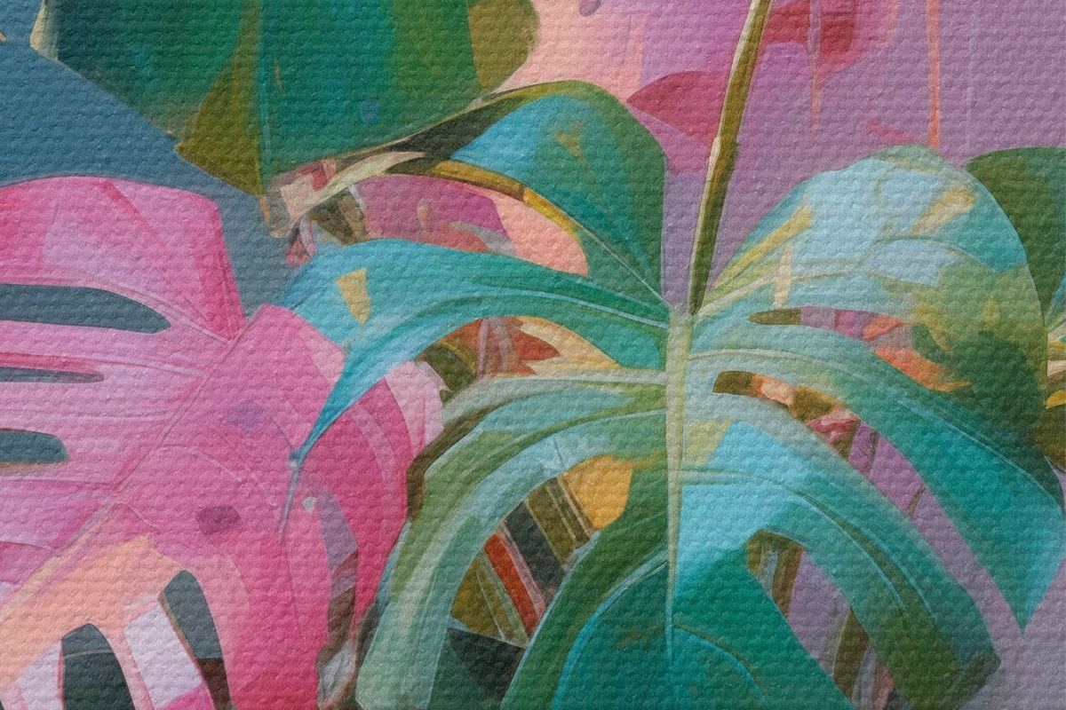 Pilt Abstraktne monstera taim roosa ja roheliste lehtedega, erksad värvid, udune taust Nr r46287