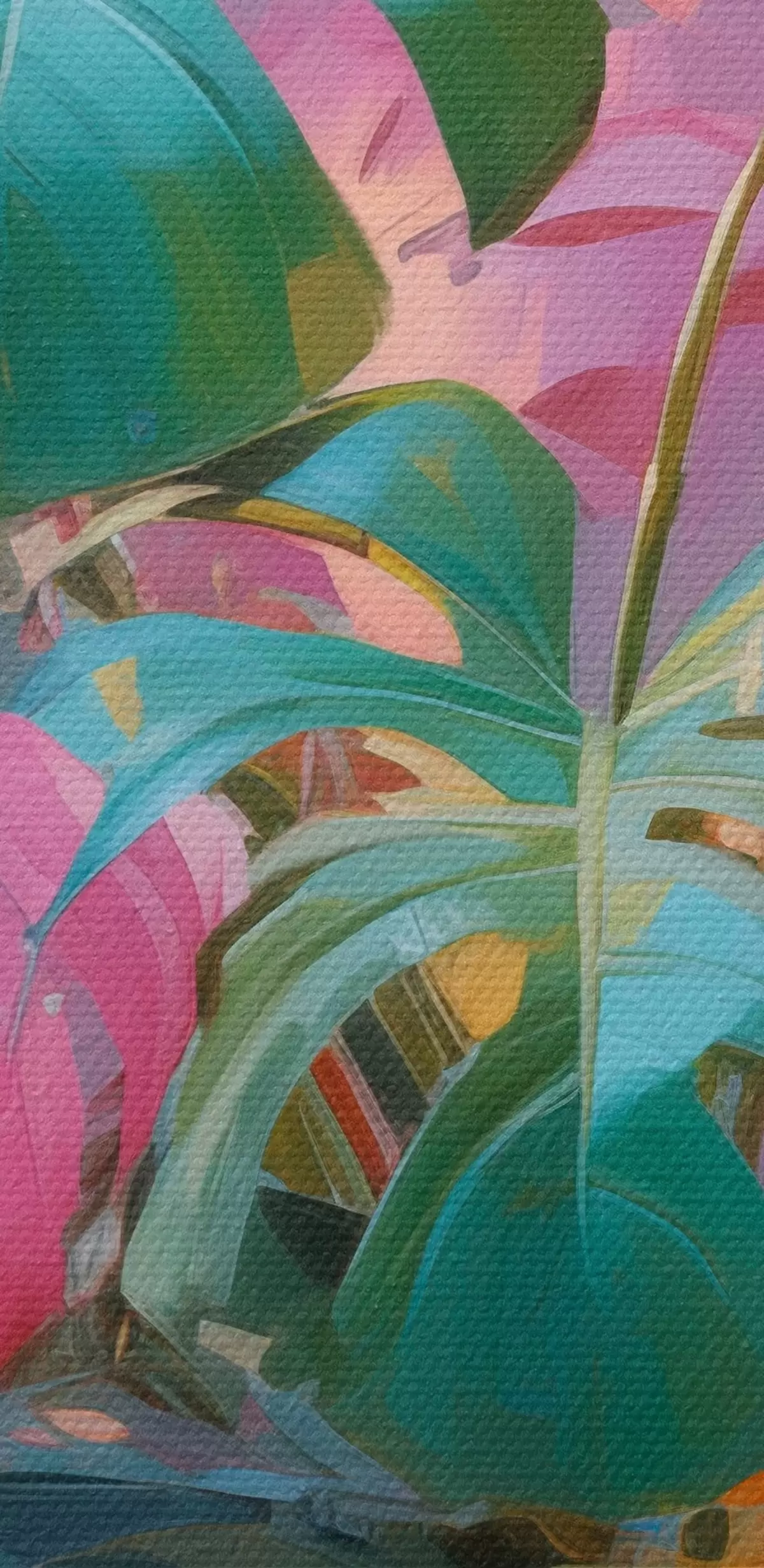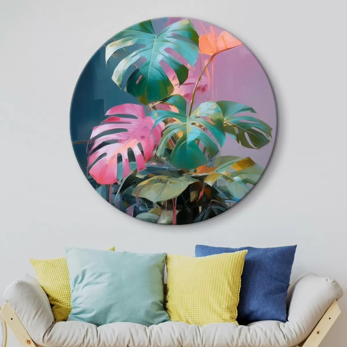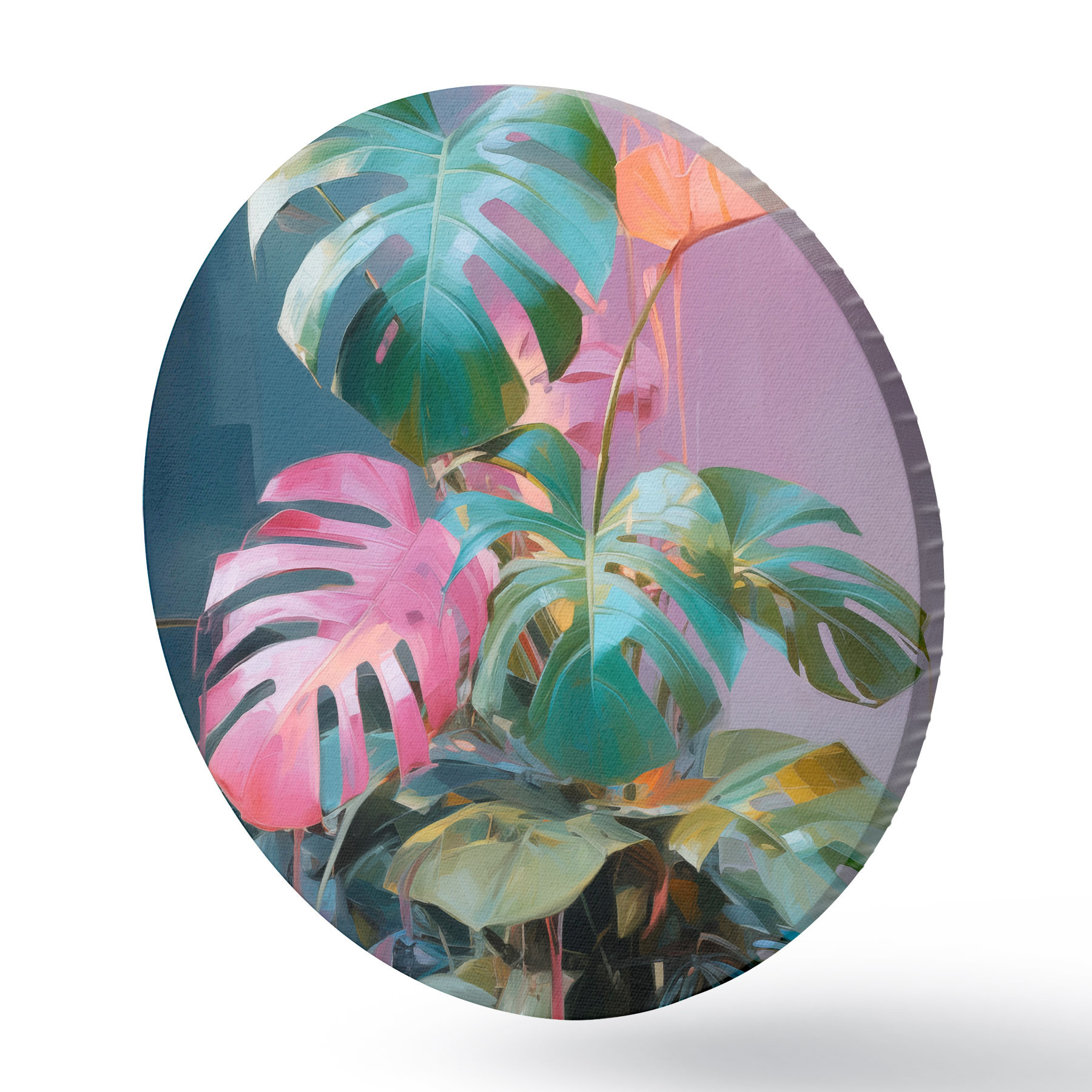 Pilt Abstraktne monstera taim roosa ja roheliste lehtedega, erksad värvid, udune taust Nr r46287