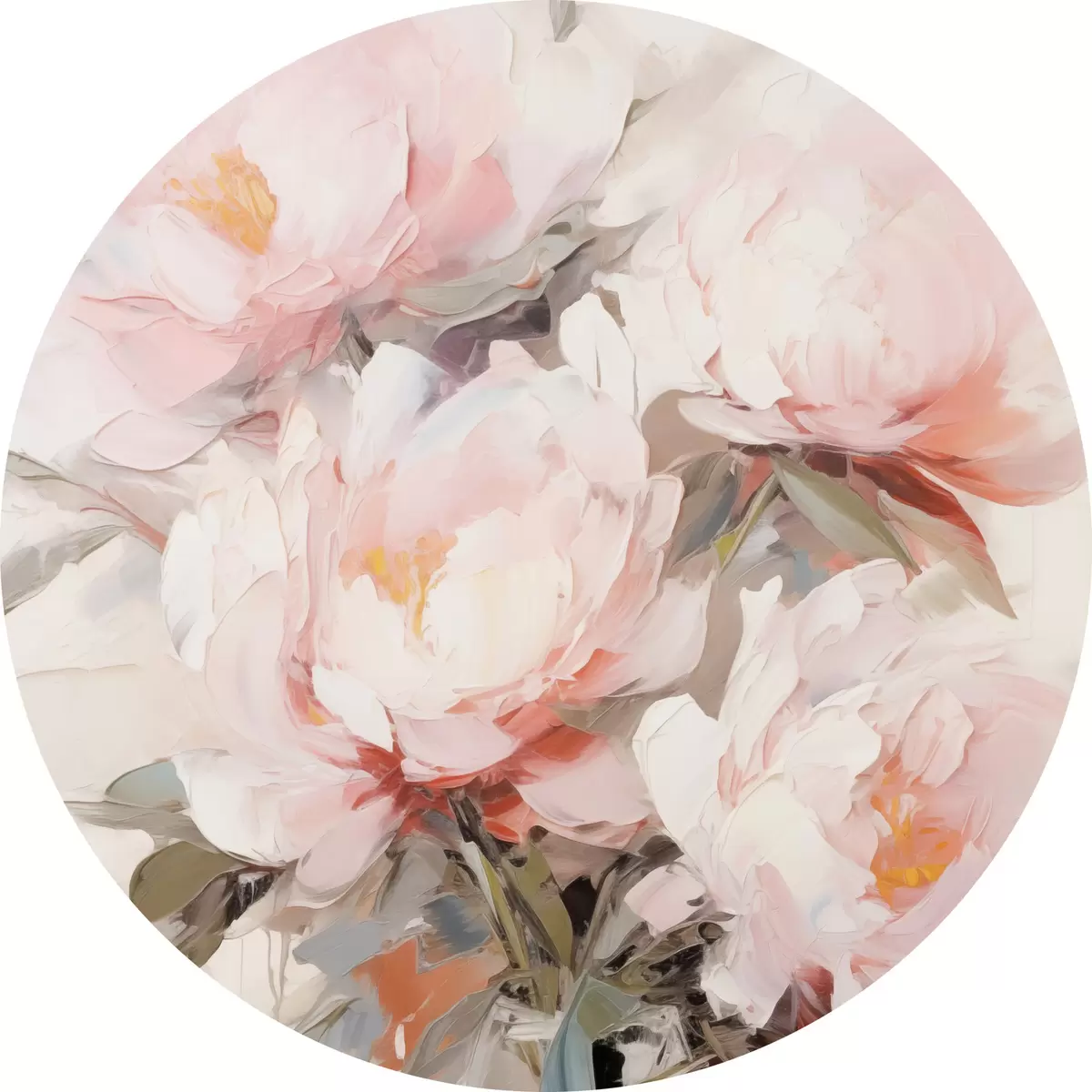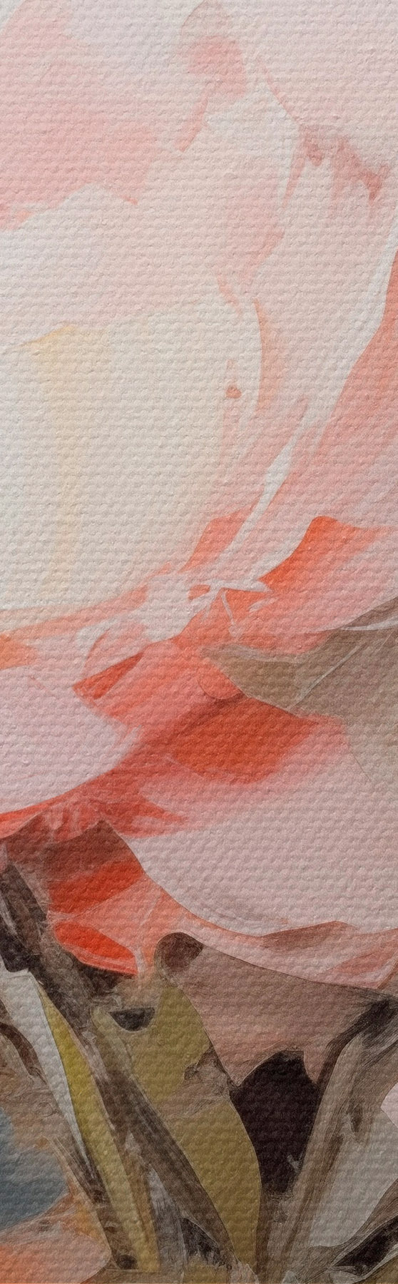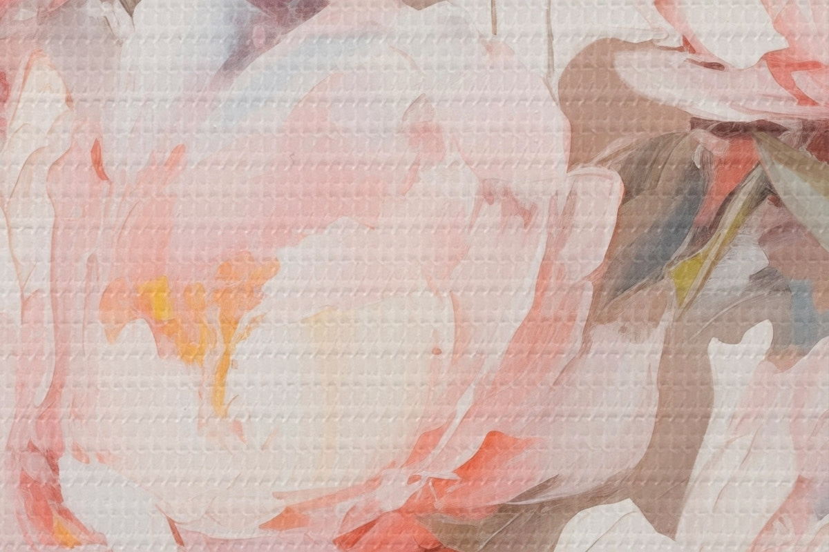 Pilt Roosa ja valge pioonide kimp klaasvaasis, pehmed pintslitõmbed, pastelltoonid, neutraalne taust Nr r46295