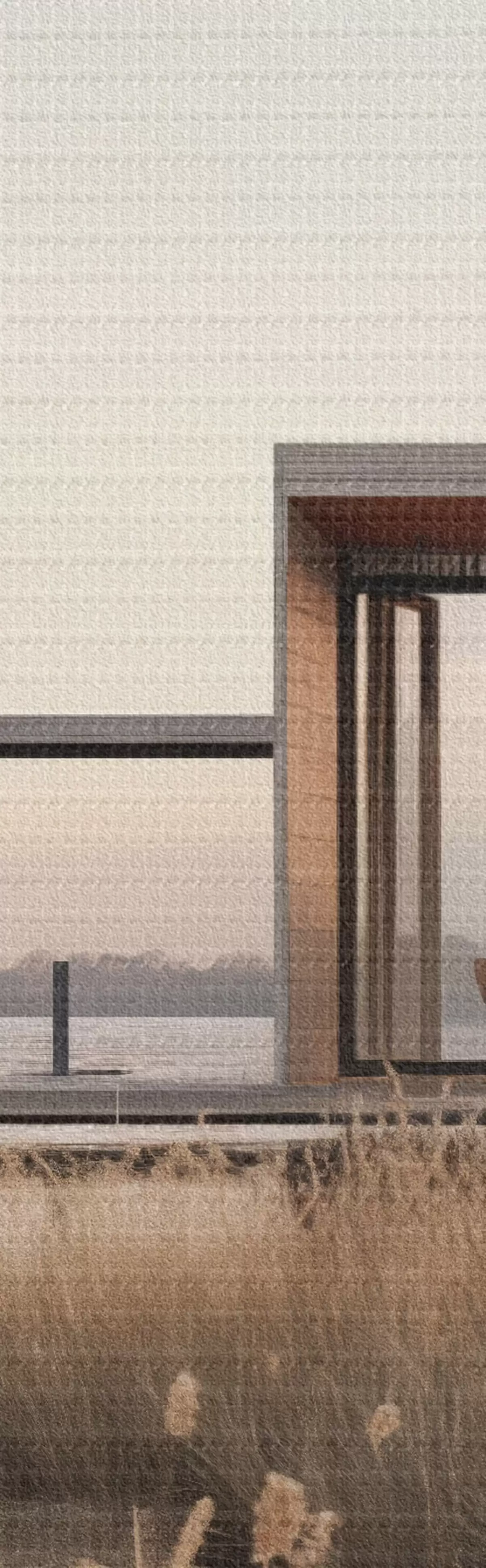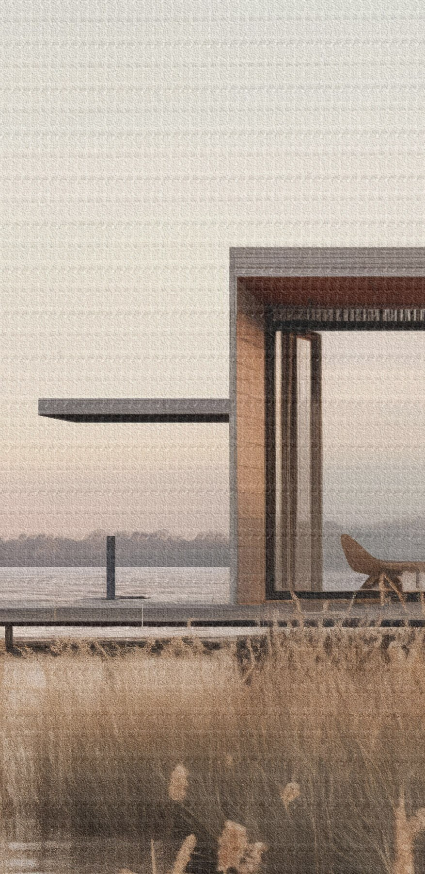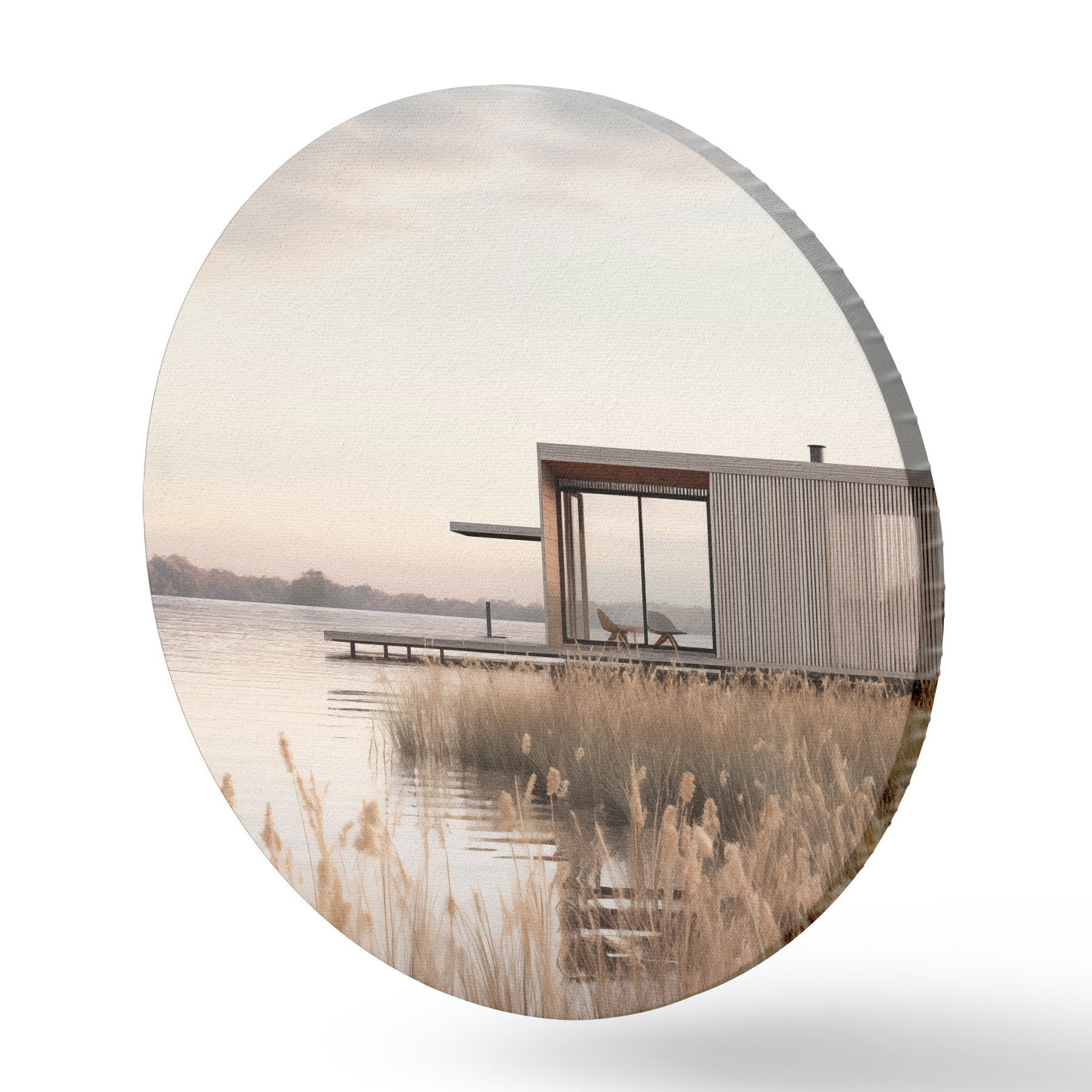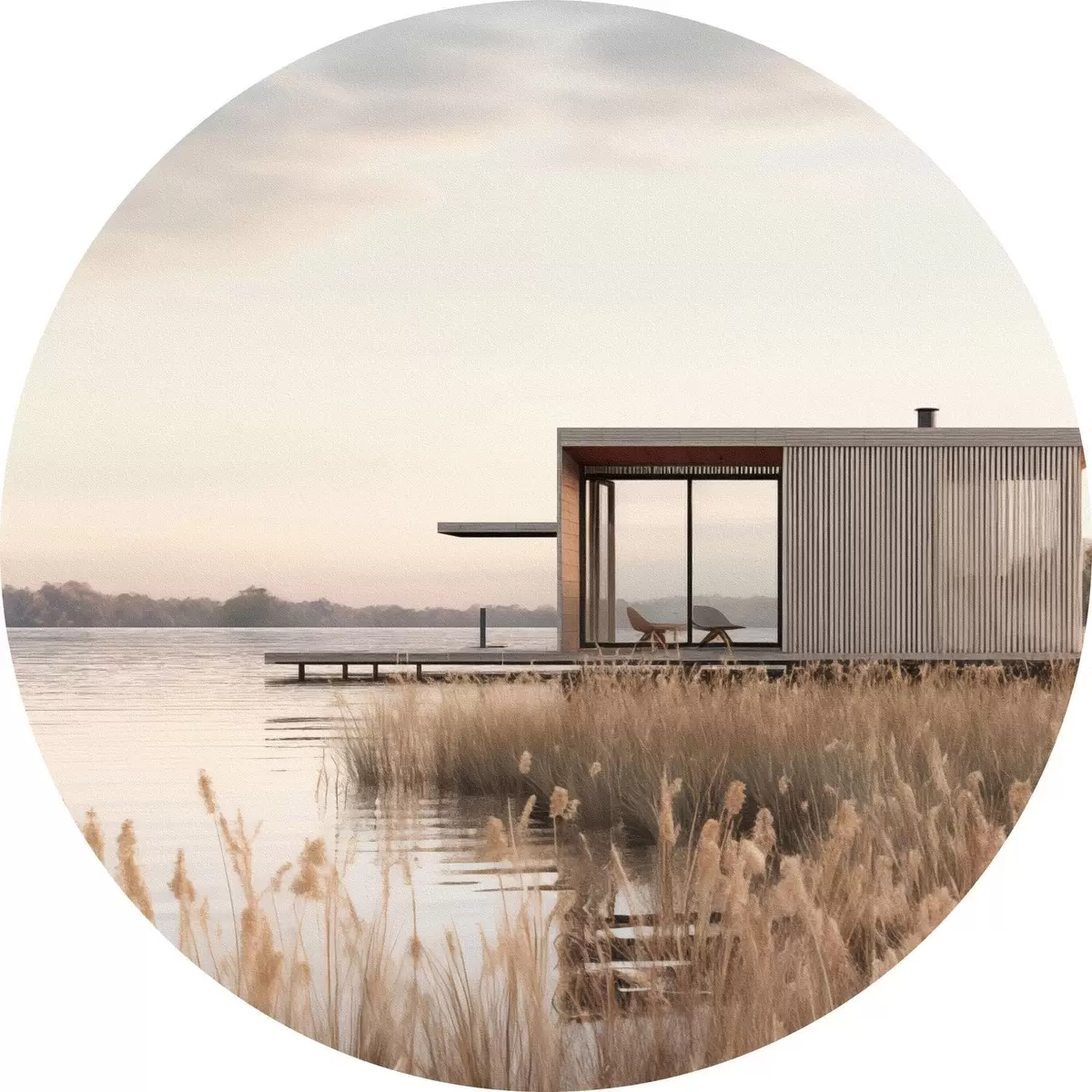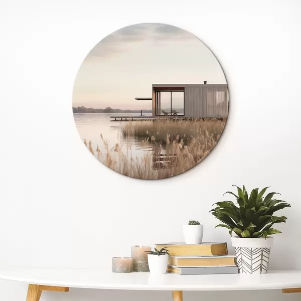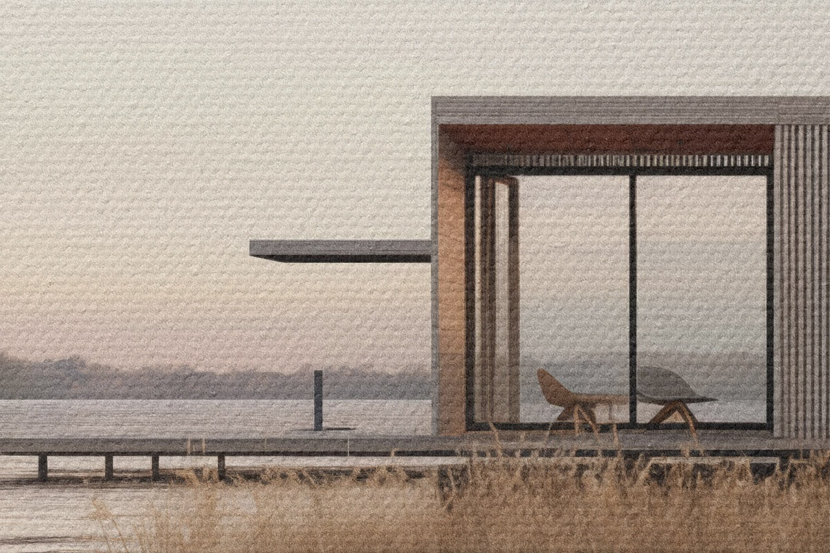 Pilt Kaasaegne järveäärne majake pilliroo keskel pehmes hämaras Nr r46513