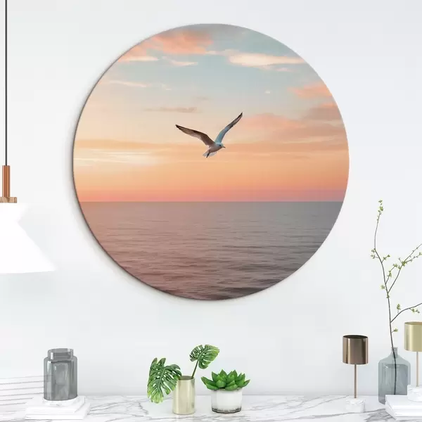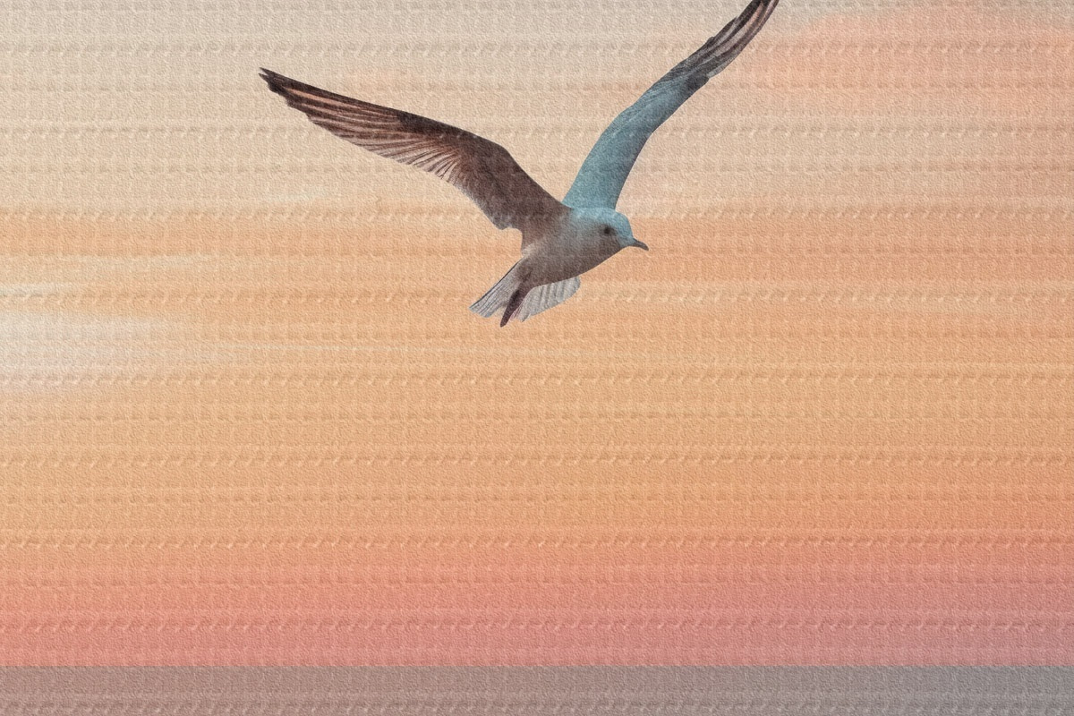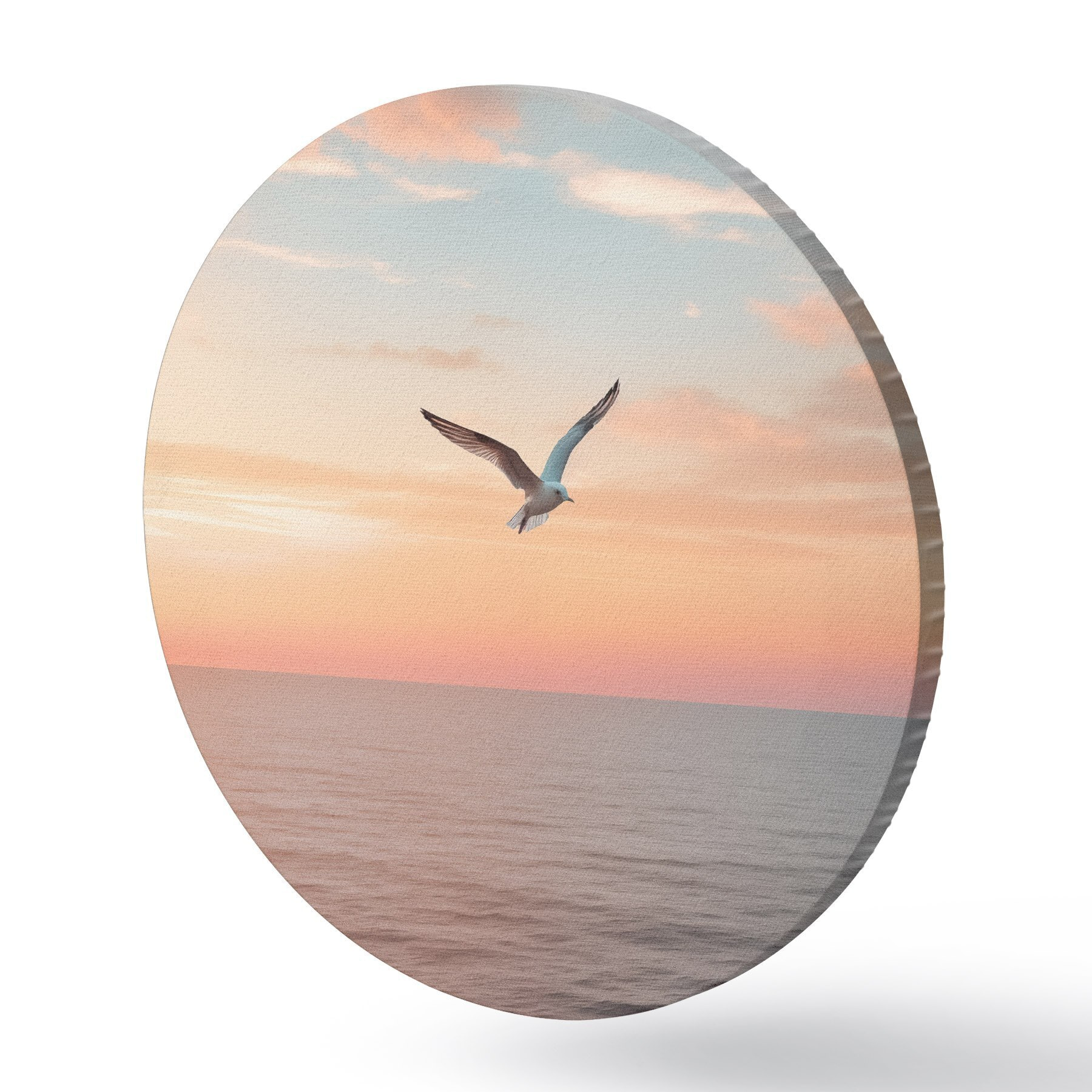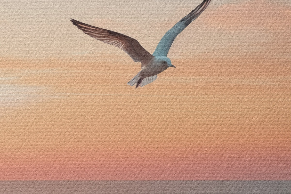 Pilt Kajakas mere kohal roosa-virsiku värvi päikeseloojangul Nr r46520