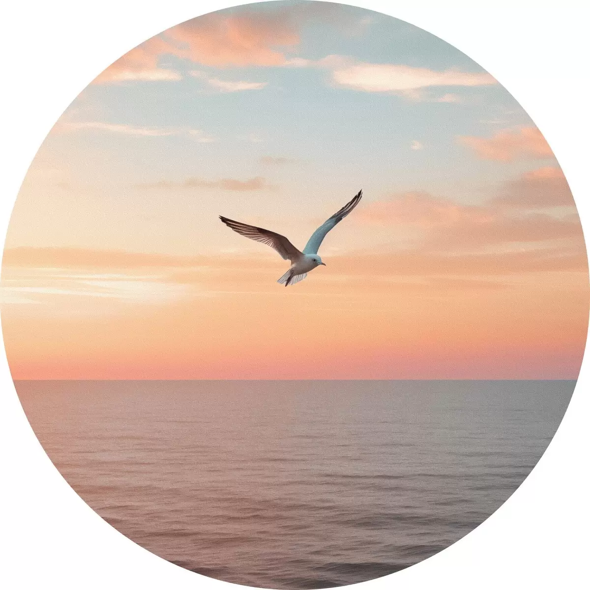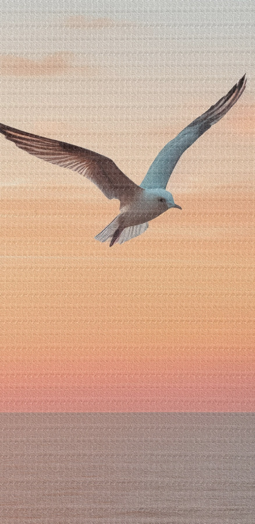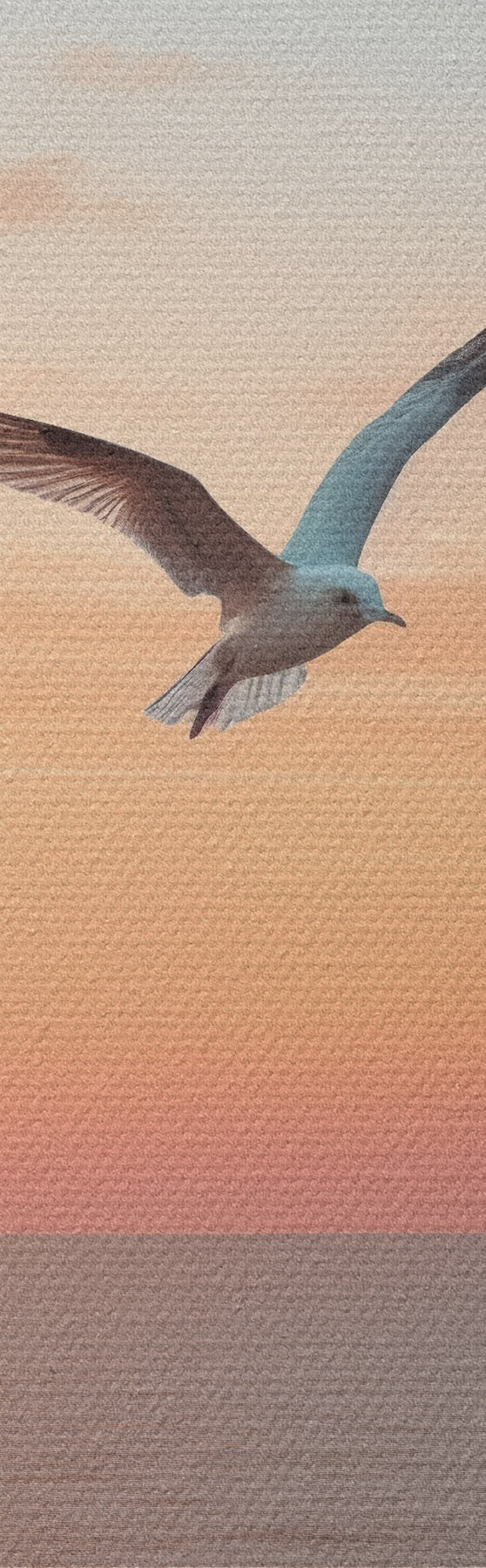Pilt Kajakas mere kohal roosa-virsiku värvi päikeseloojangul Nr r46520