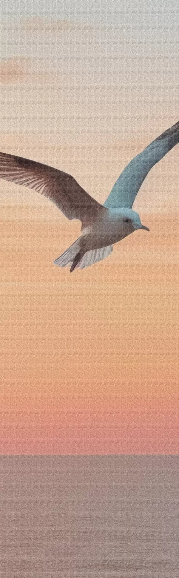 Pilt Kajakas mere kohal roosa-virsiku värvi päikeseloojangul Nr r46520