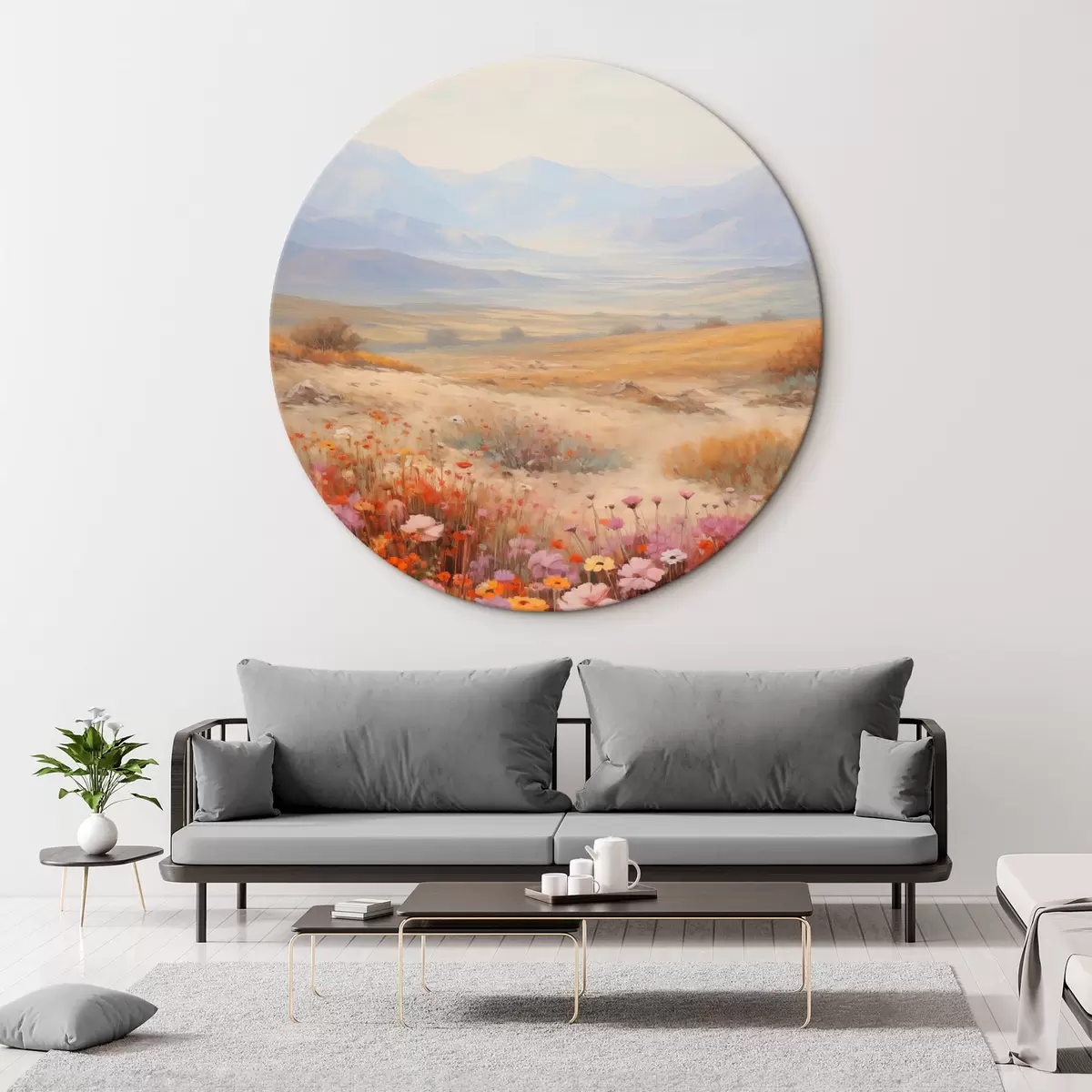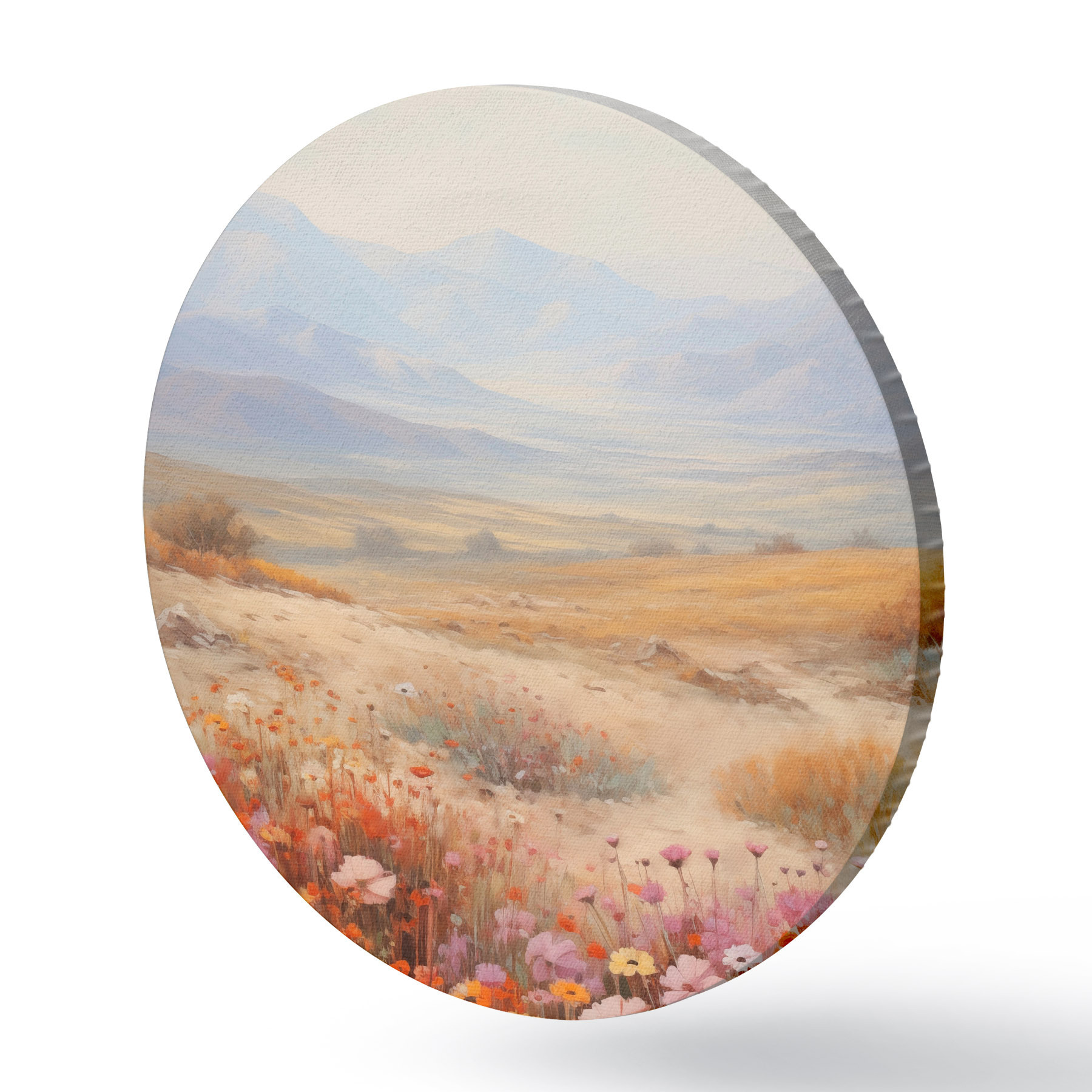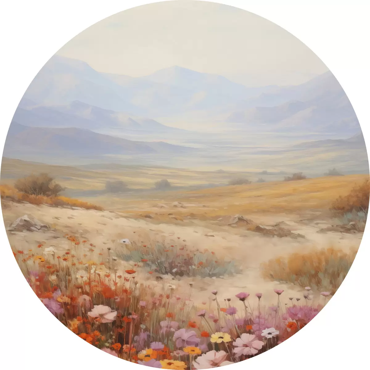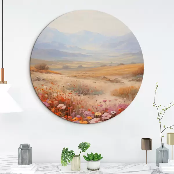 Pilt Maastik, värviliste lillede väli mägedega taustal, pehmed ja pastelsed värvid Nr r46685