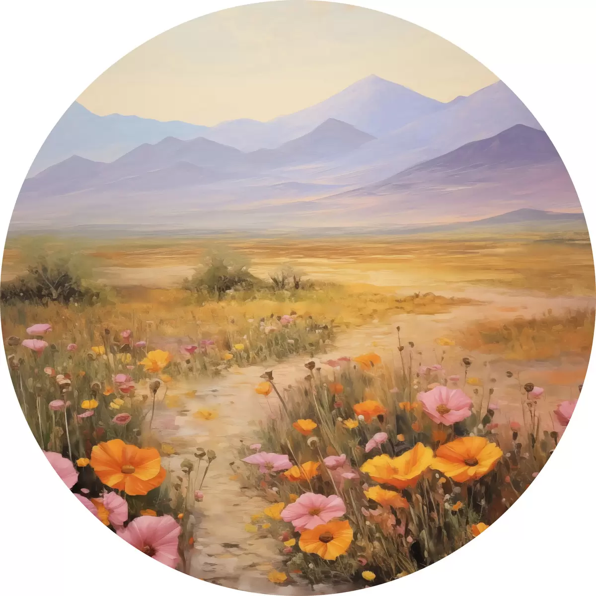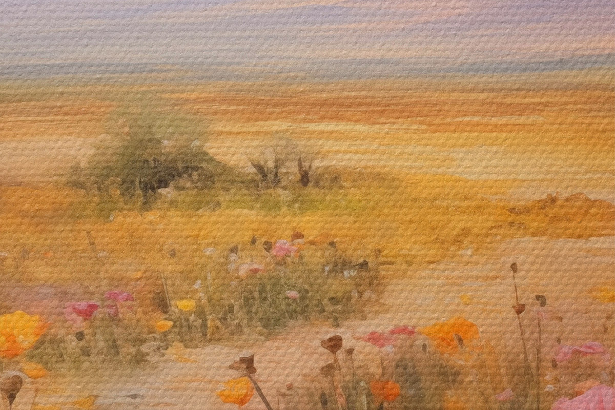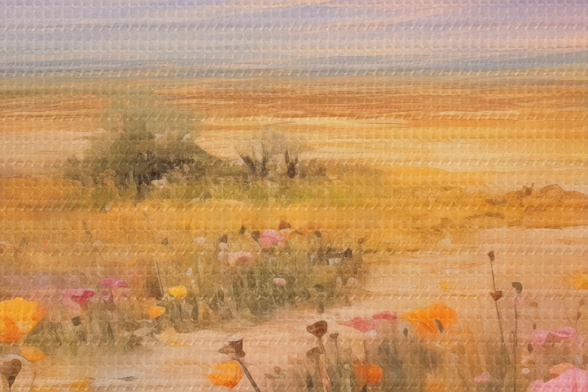 Pilt Maastik, värviliste lillede väli mägedega taustal, pehmed ja pastelsed värvid Nr r46686