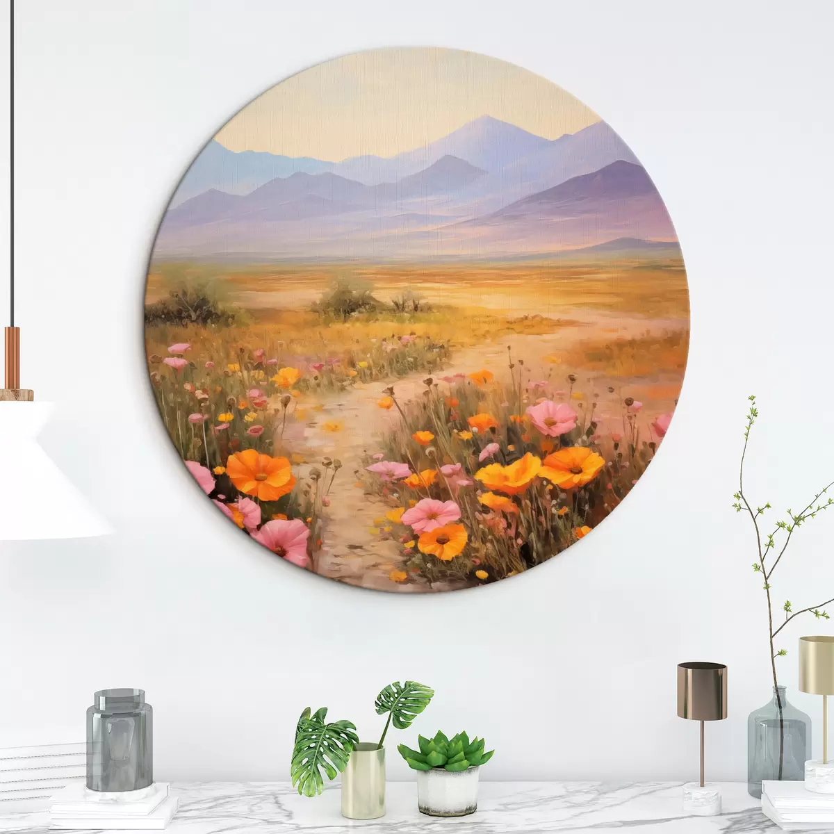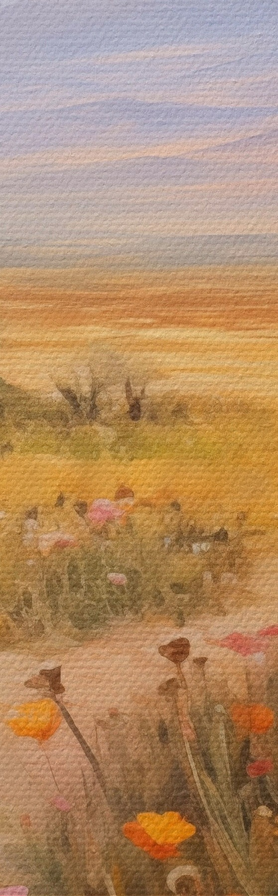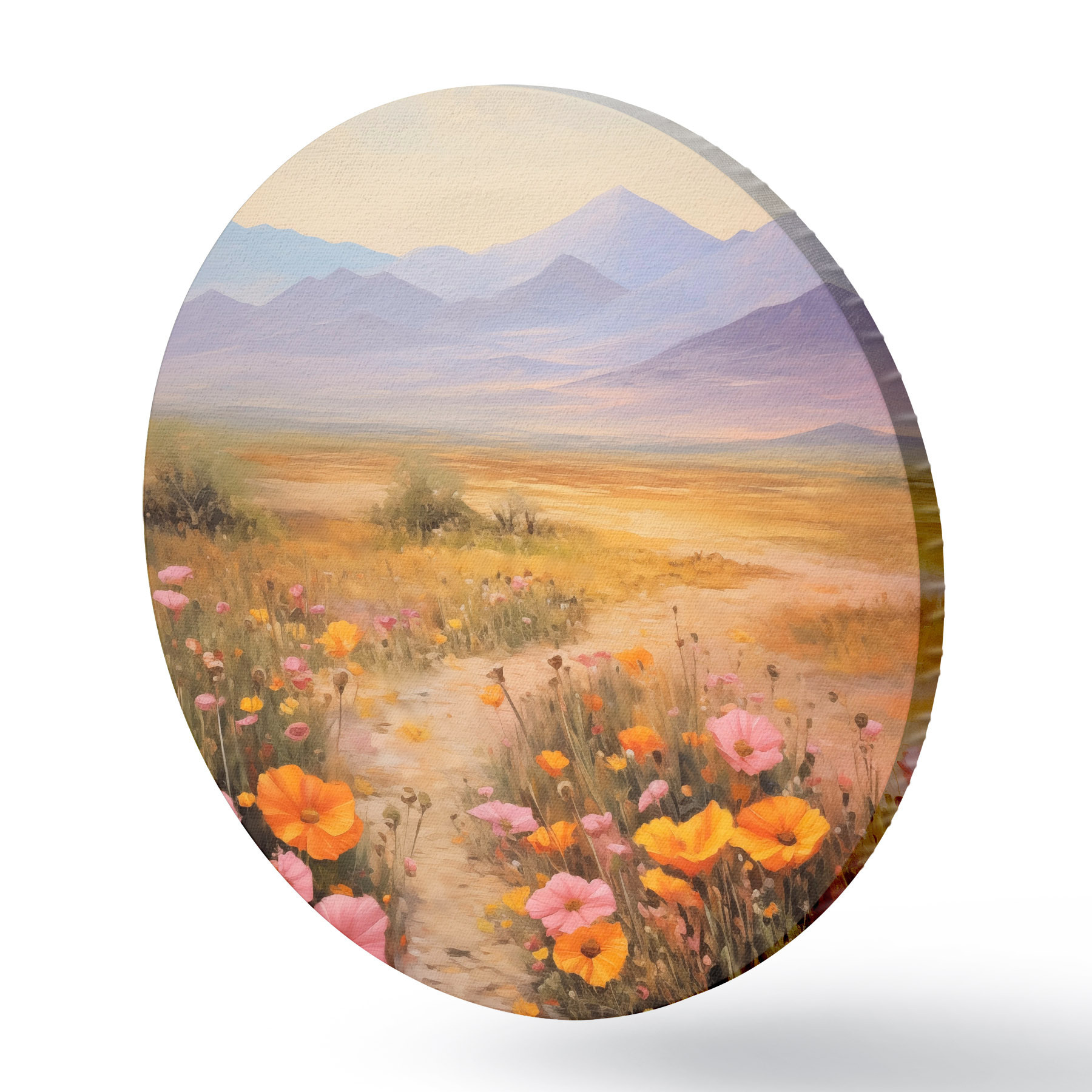Pilt Maastik, värviliste lillede väli mägedega taustal, pehmed ja pastelsed värvid Nr r46686