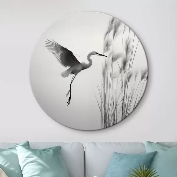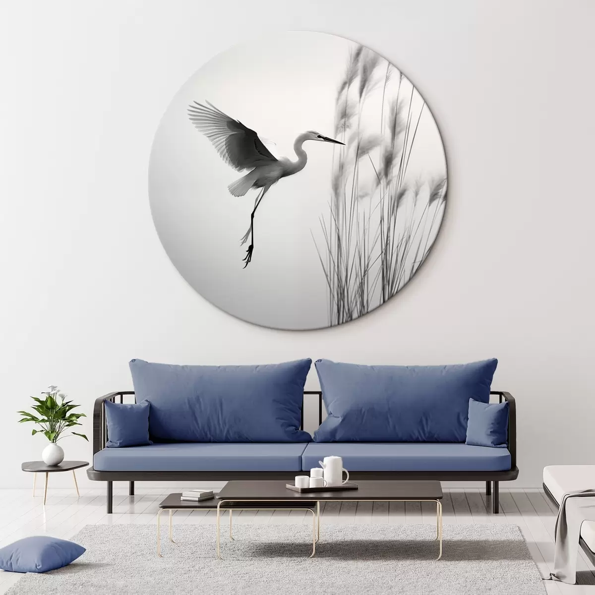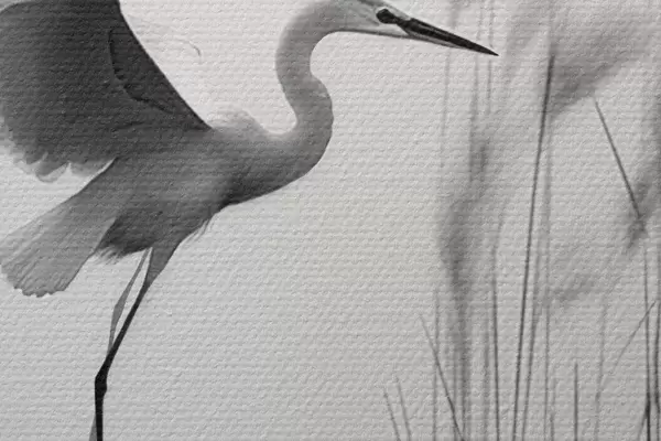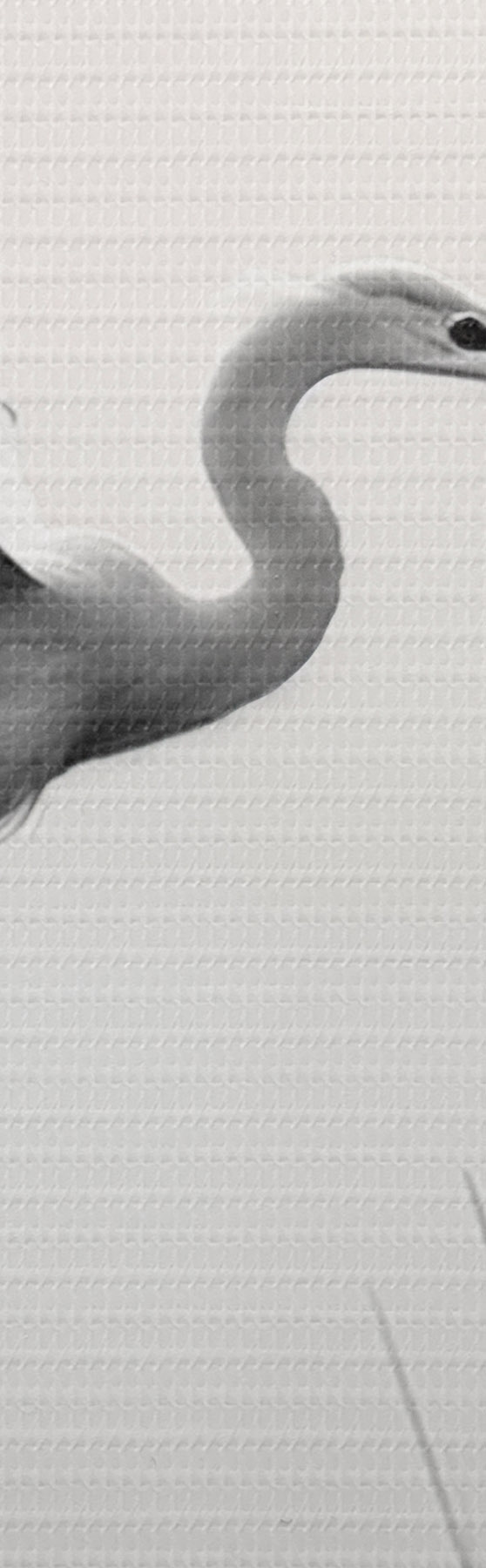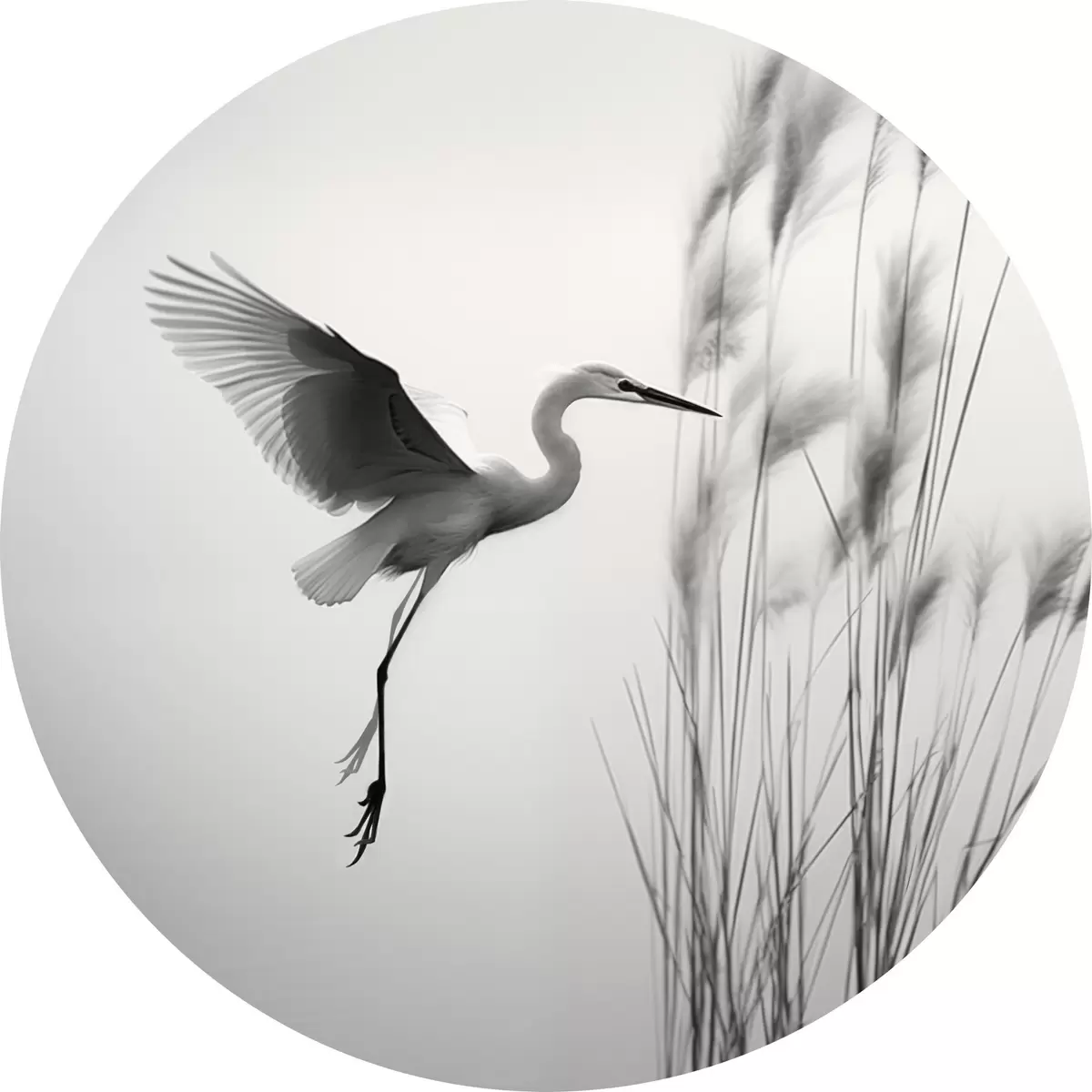 Pilt Valge toonekurg laiali tiibadega, lendamas kõrge roostiku lähedal, must-valge minimalistlik kompositsioon Nr r46693