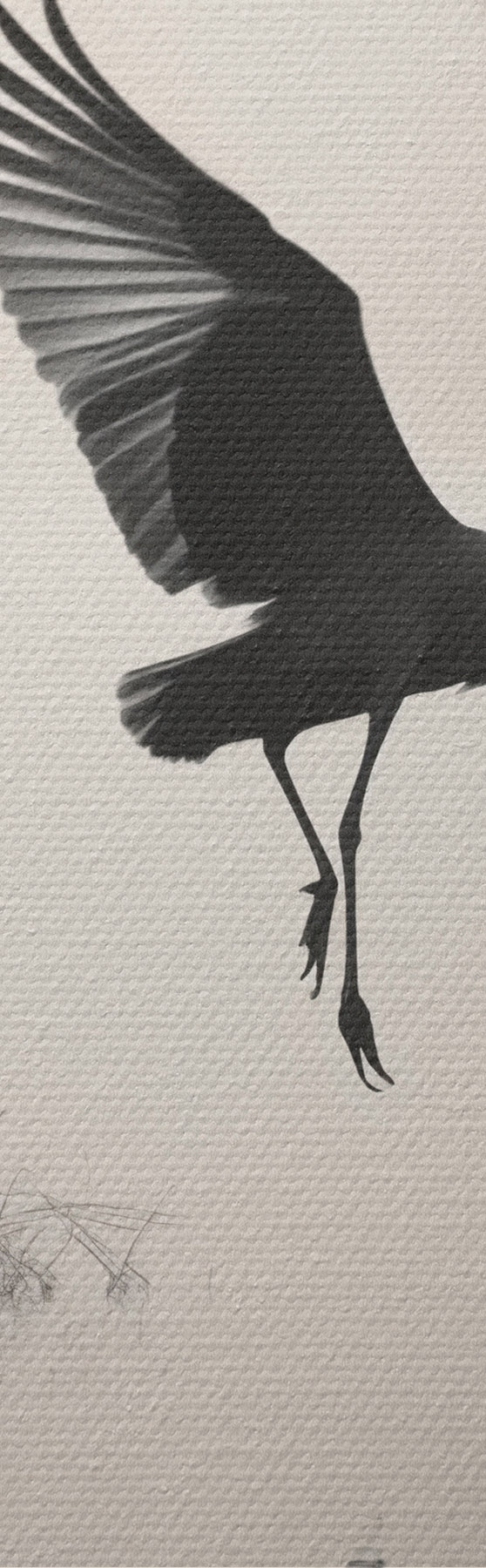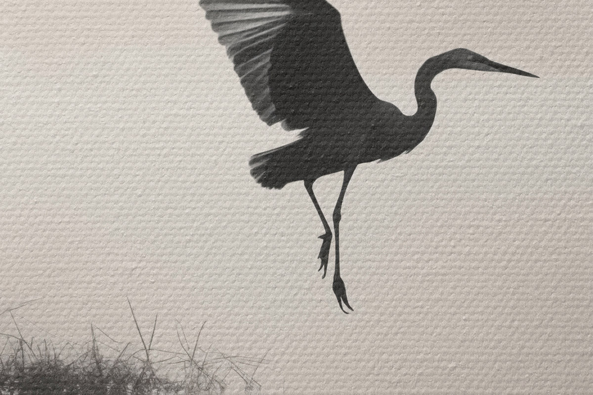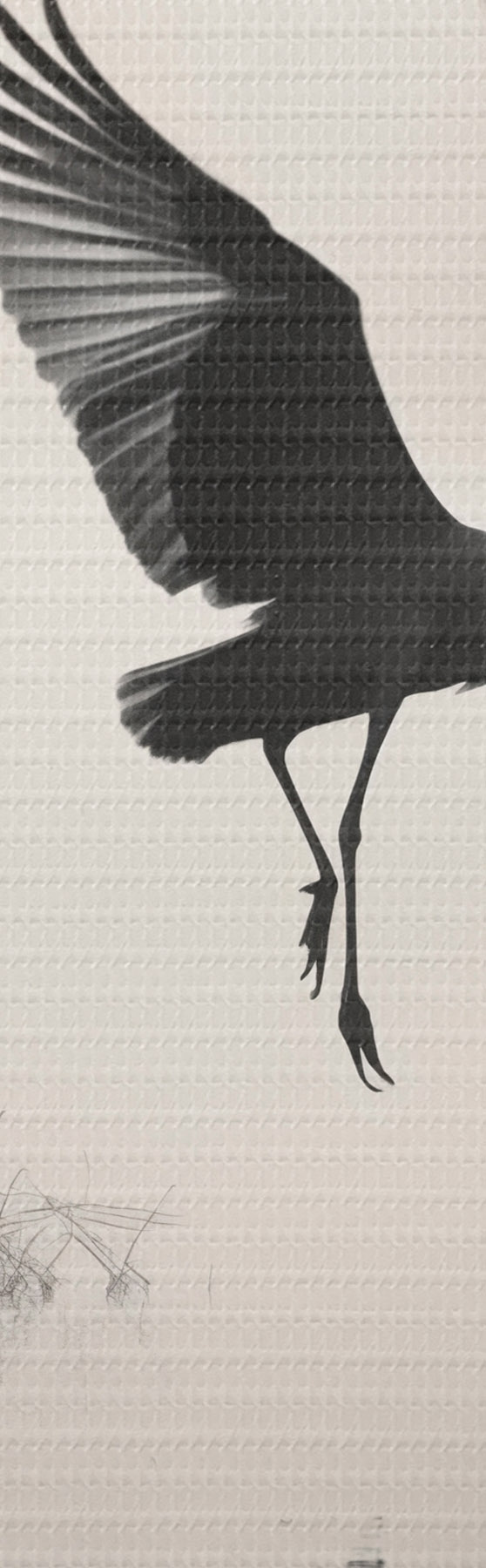 Pilt Valge toonekurg laiali tiibadega, lendamas kõrge roostiku lähedal, must-valge minimalistlik kompositsioon Nr r46694
