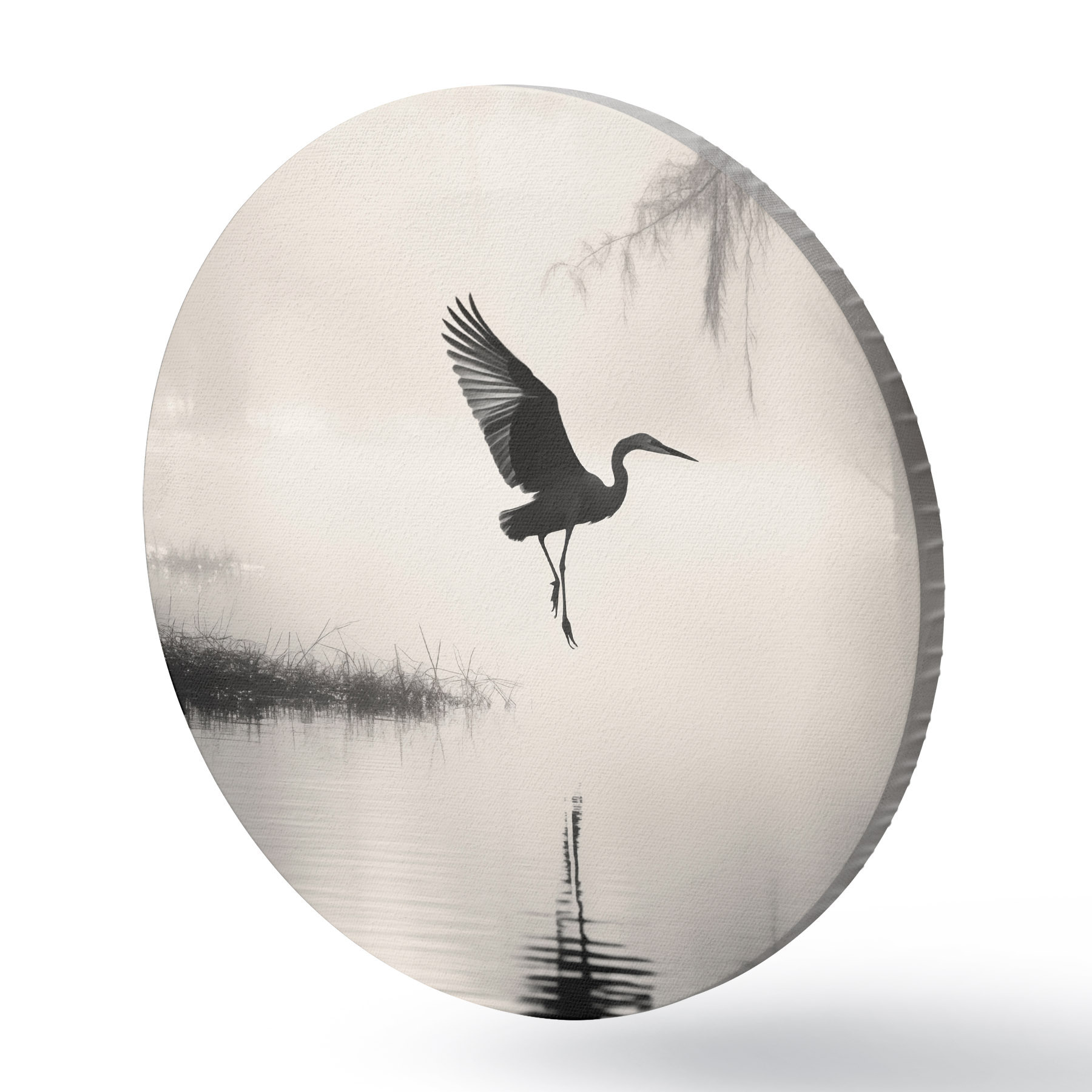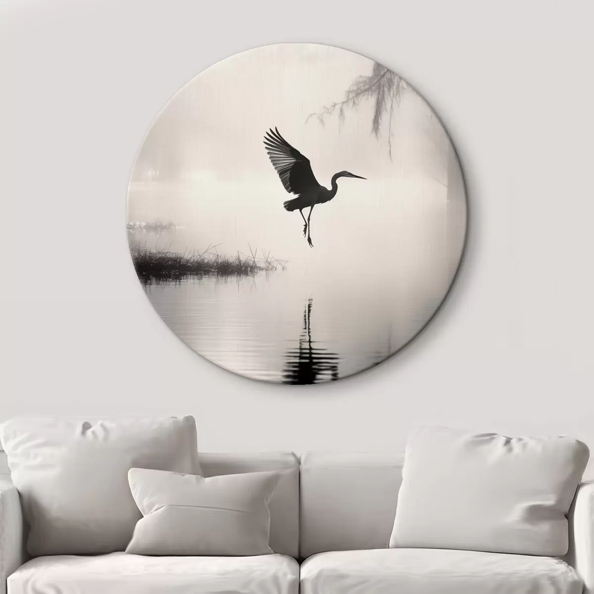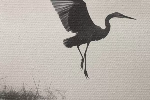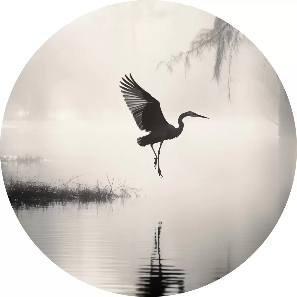 Pilt Valge toonekurg laiali tiibadega, lendamas kõrge roostiku lähedal, must-valge minimalistlik kompositsioon Nr r46694